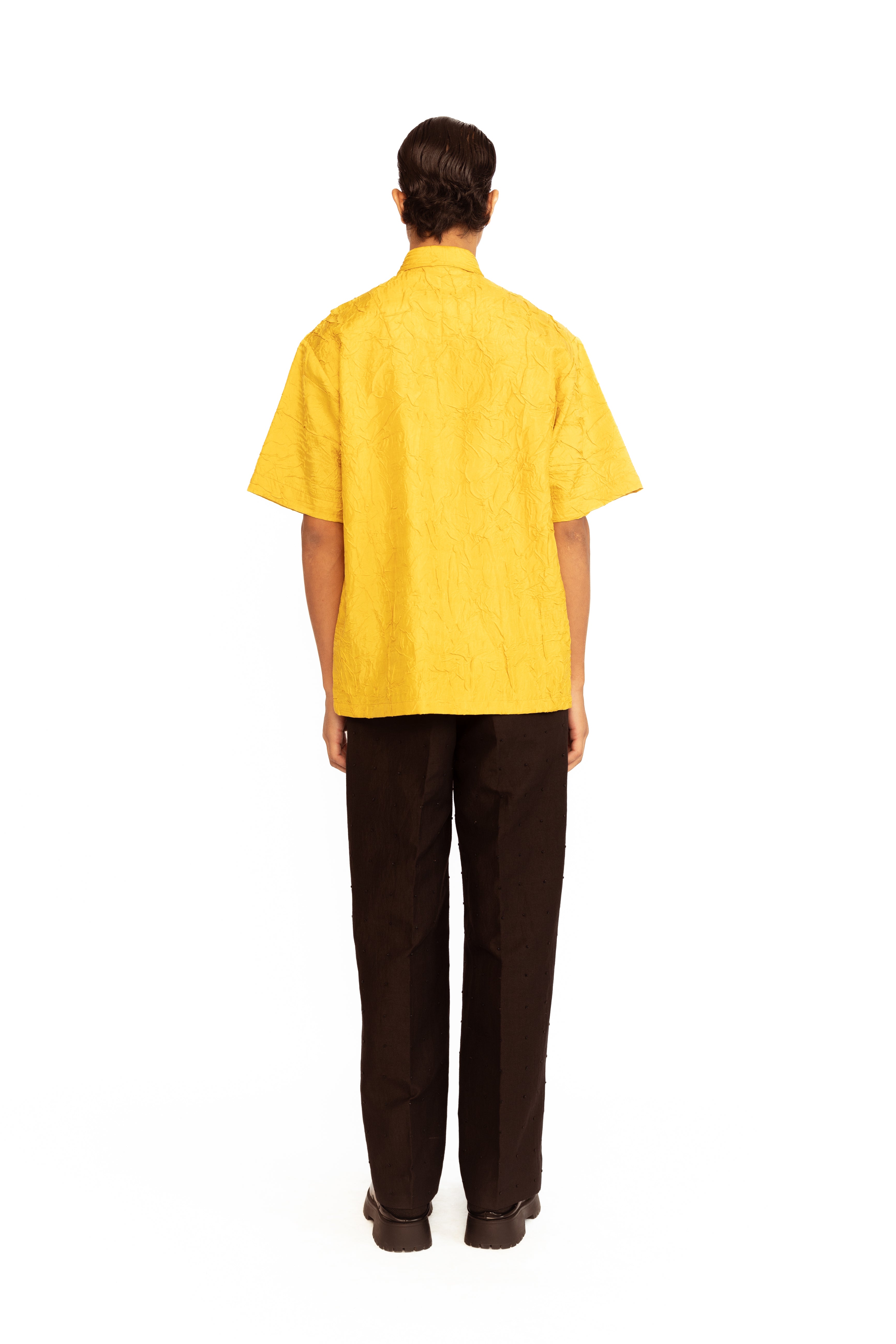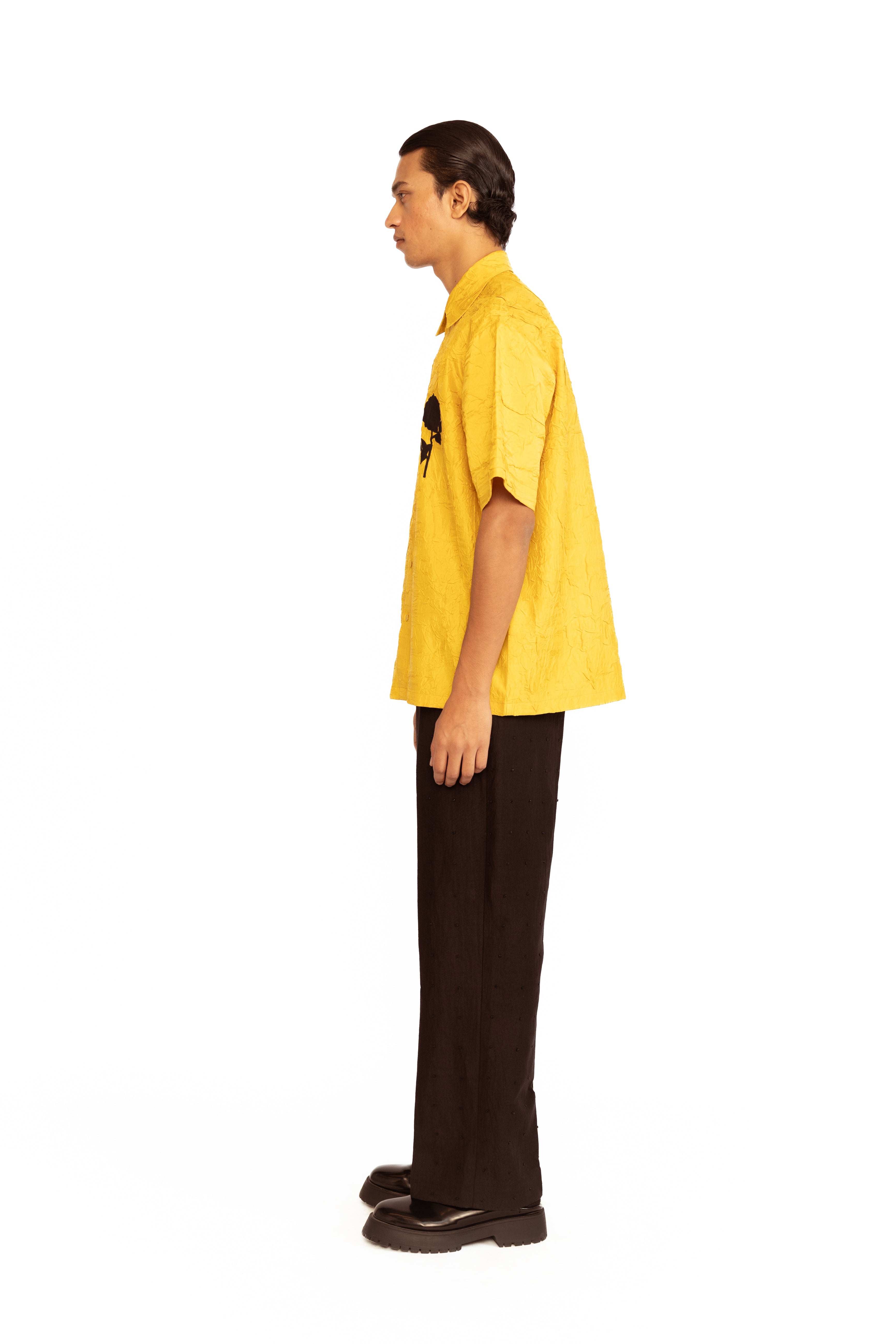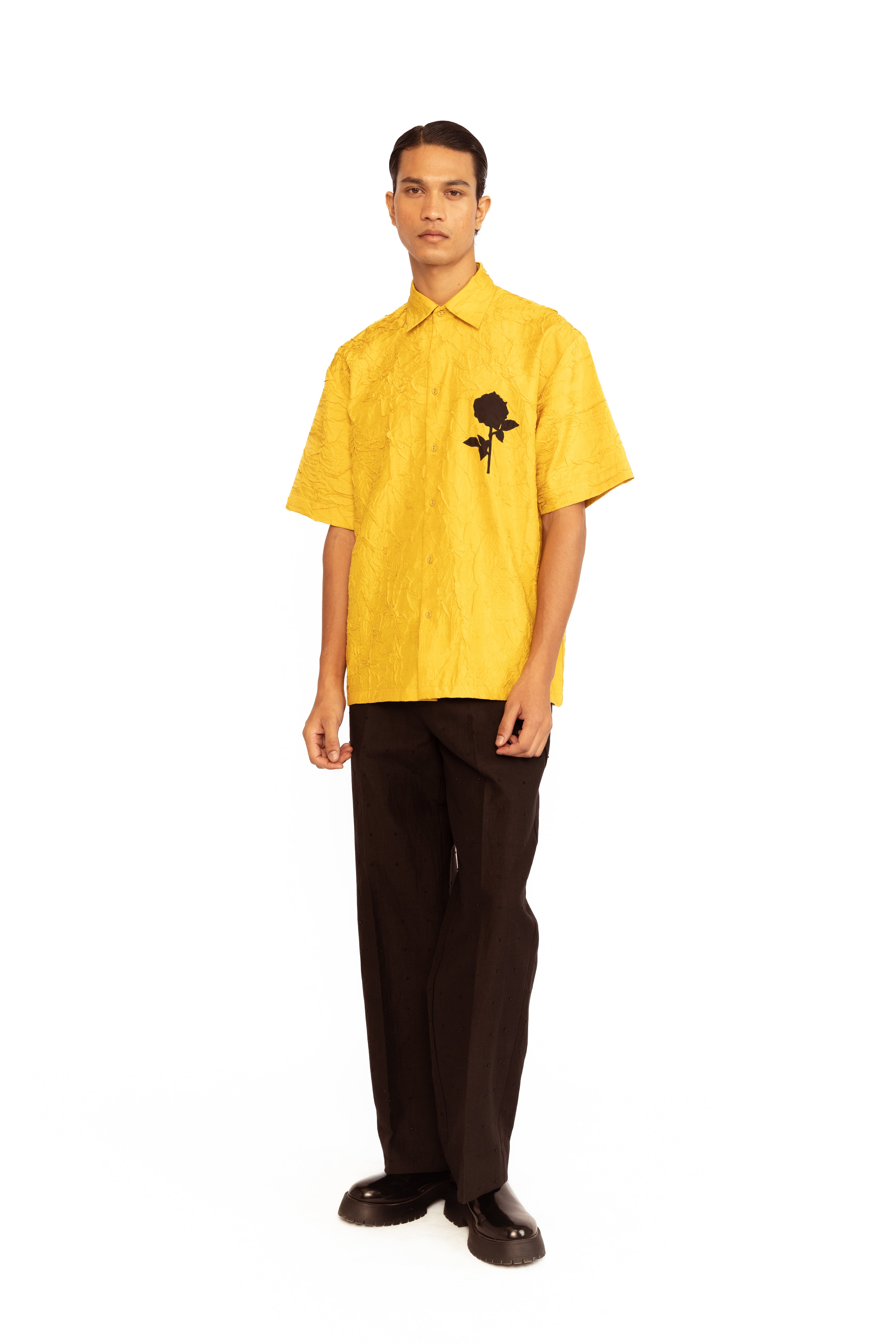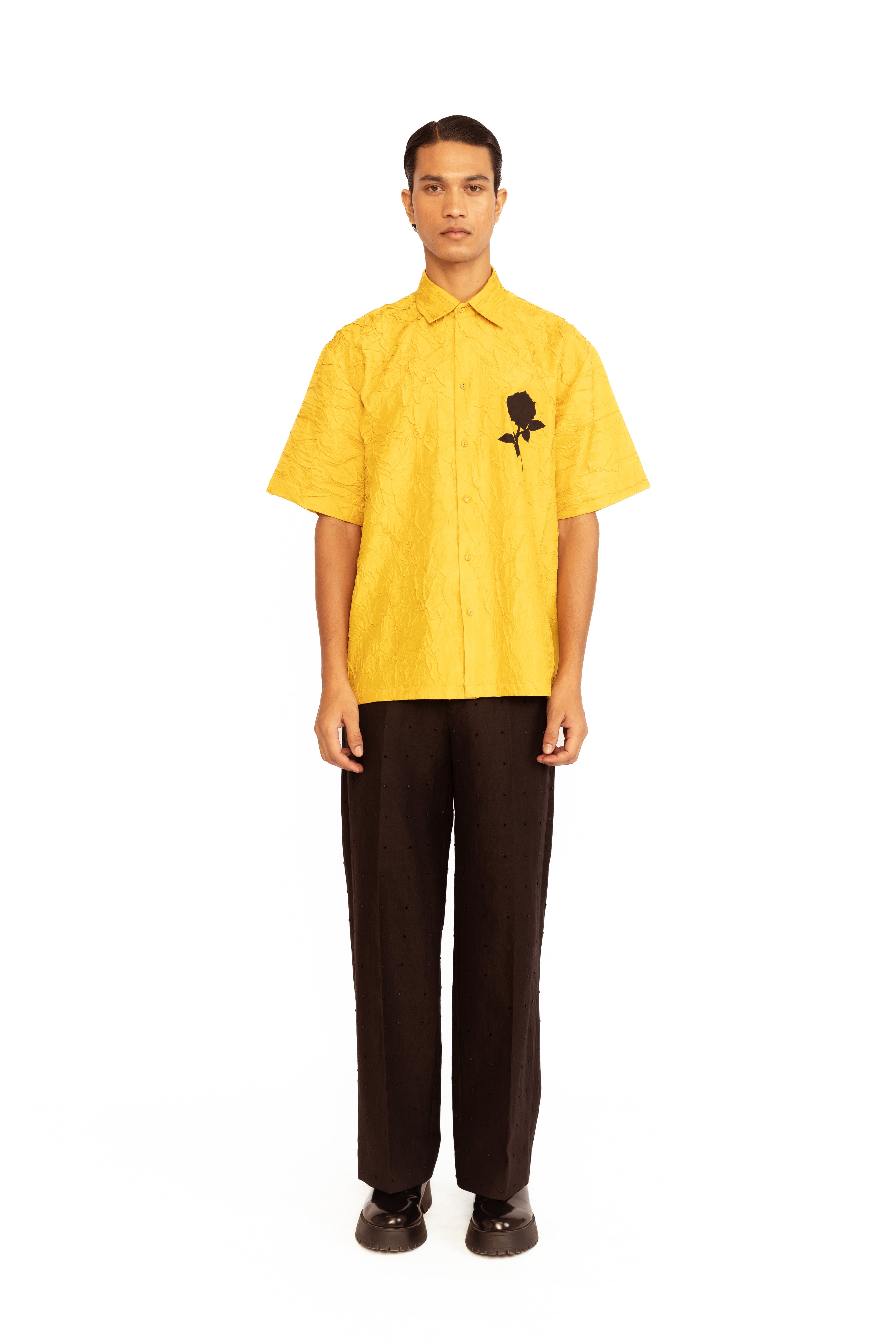 Crafted in luxurious crinkled silk, this men’s shirt combines modern elegance with artistic detail. The relaxed silhouette is elevated with intricate floral appliqué, adding a refined touch of texture and sophistication—ideal for statement dressing at special occasions.