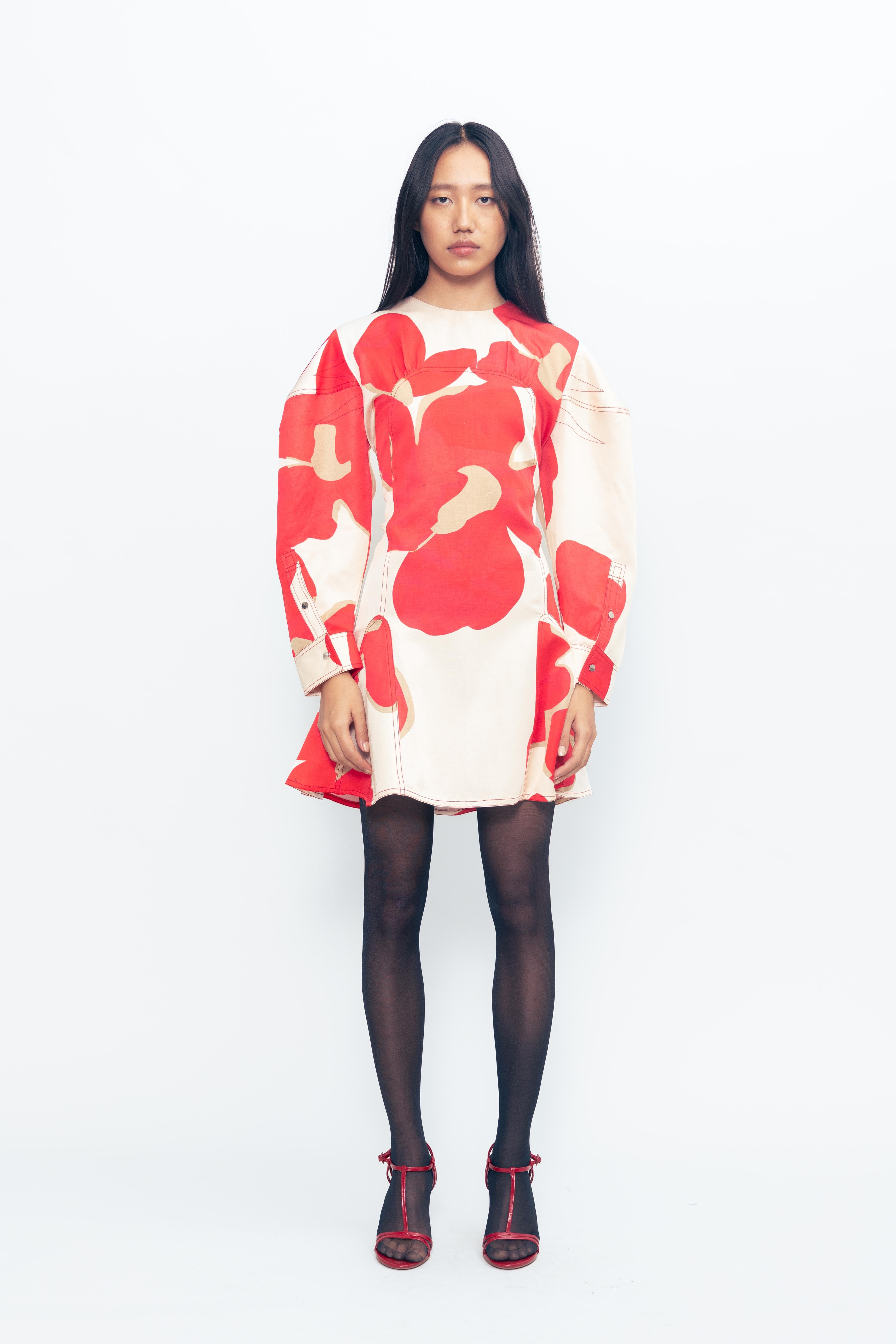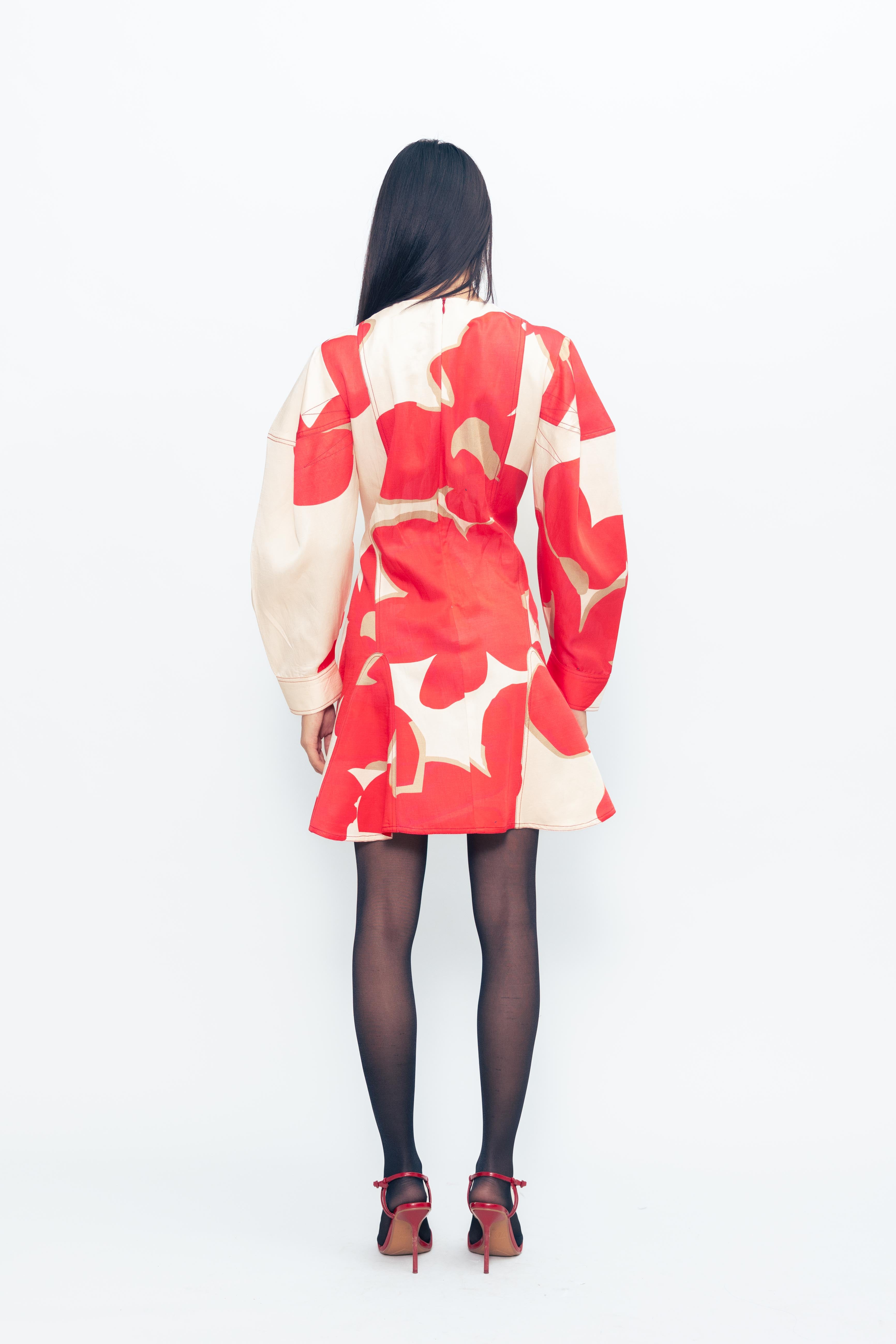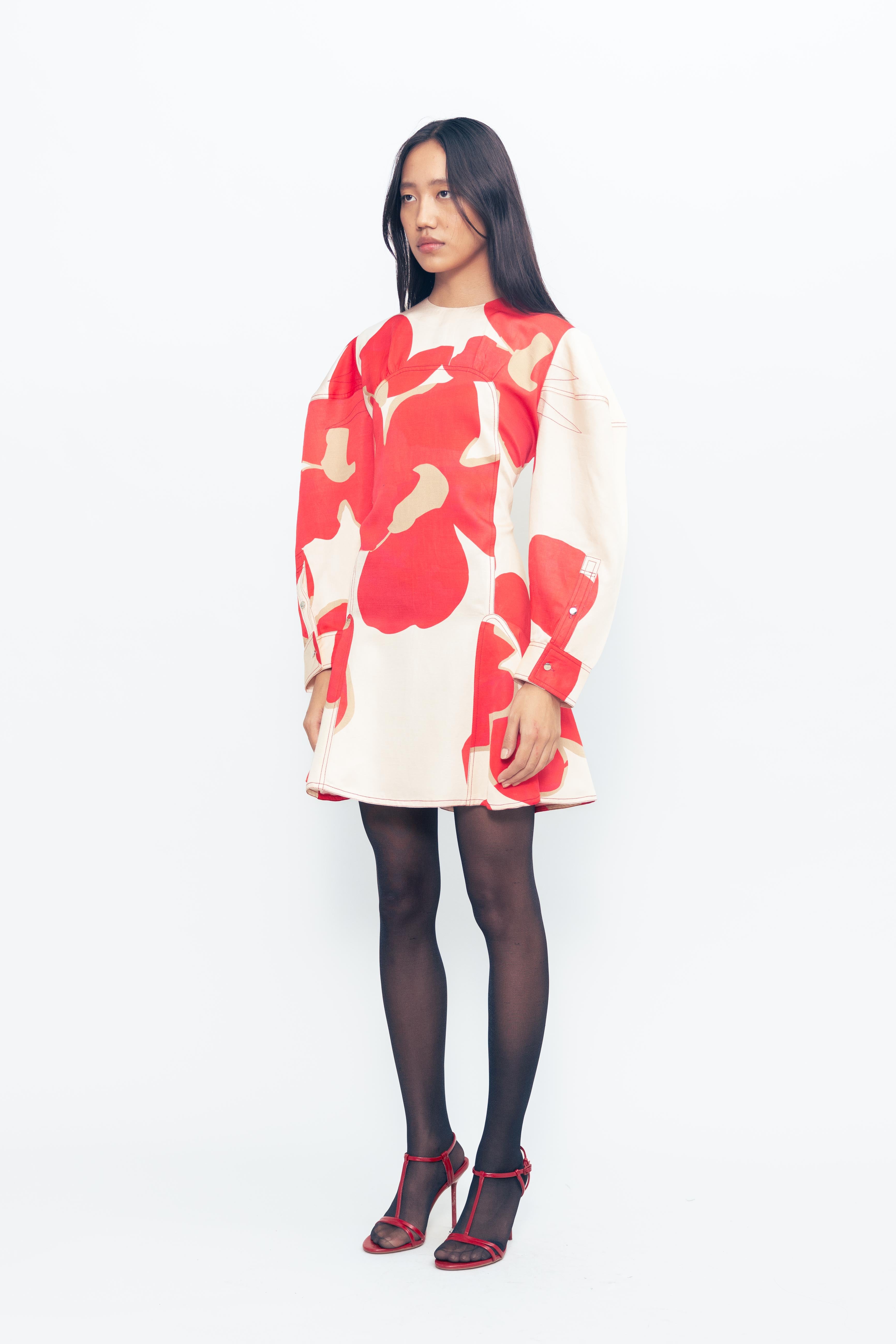 Shaped with intention and lifted with ease, this piece draws the eye through soft curves and sculptural volume. The bodice follows a fluid line, while rounded sleeves add a playful buoyancy to the form. Across the surface, vivid florals bloom with spirited clarity—bold yet balanced. Expressive in shape and full of motion, it’s a piece made to move with lightness and confidence.
