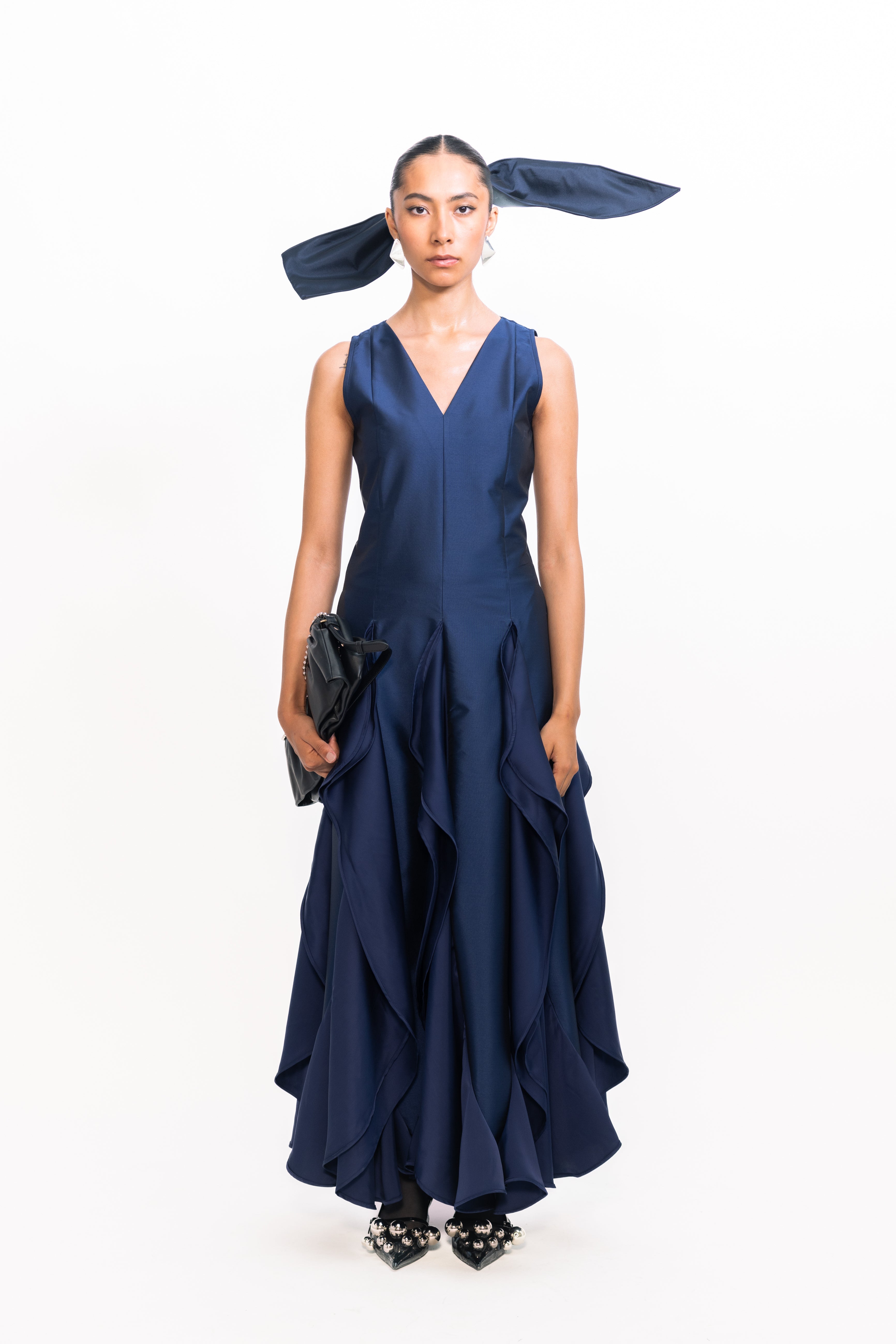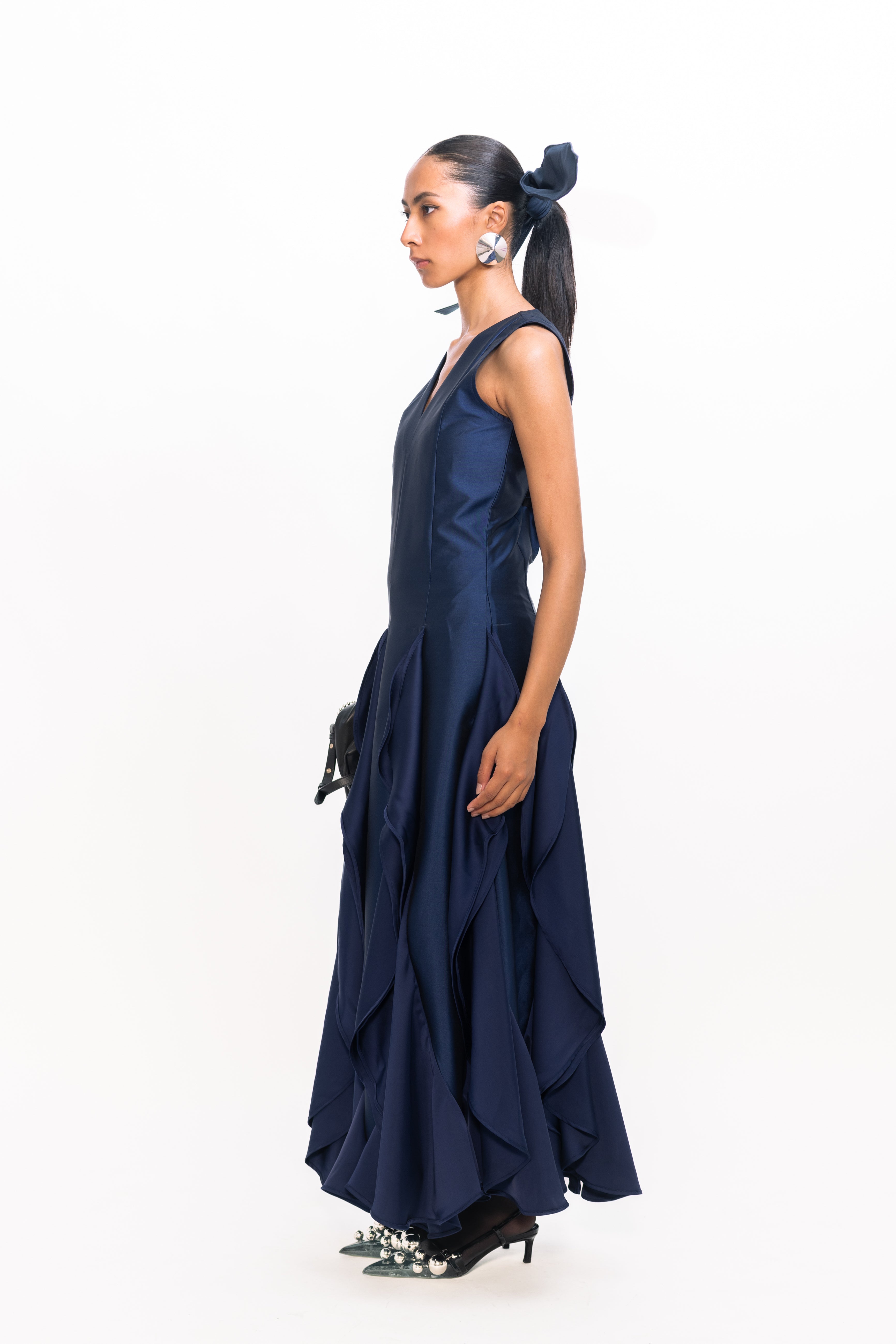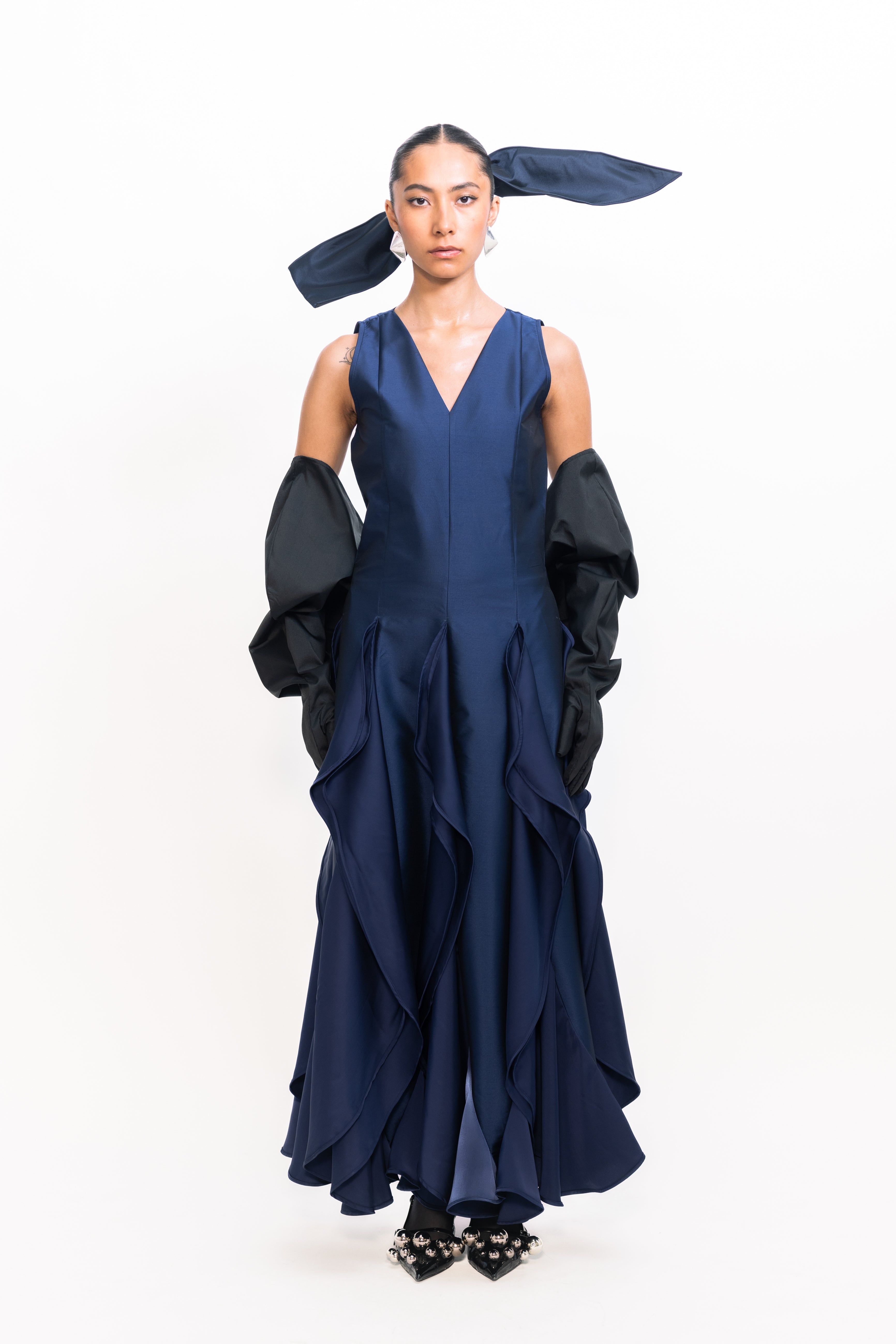This sophisticated gown features a sleek, fitted bodice with a flattering V-neckline that elongates the silhouette. The skirt flows into a dramatic cascade of pleats at the hem, creating graceful movement and a touch of modern romance—ideal for formal events or elegant evening occasions.