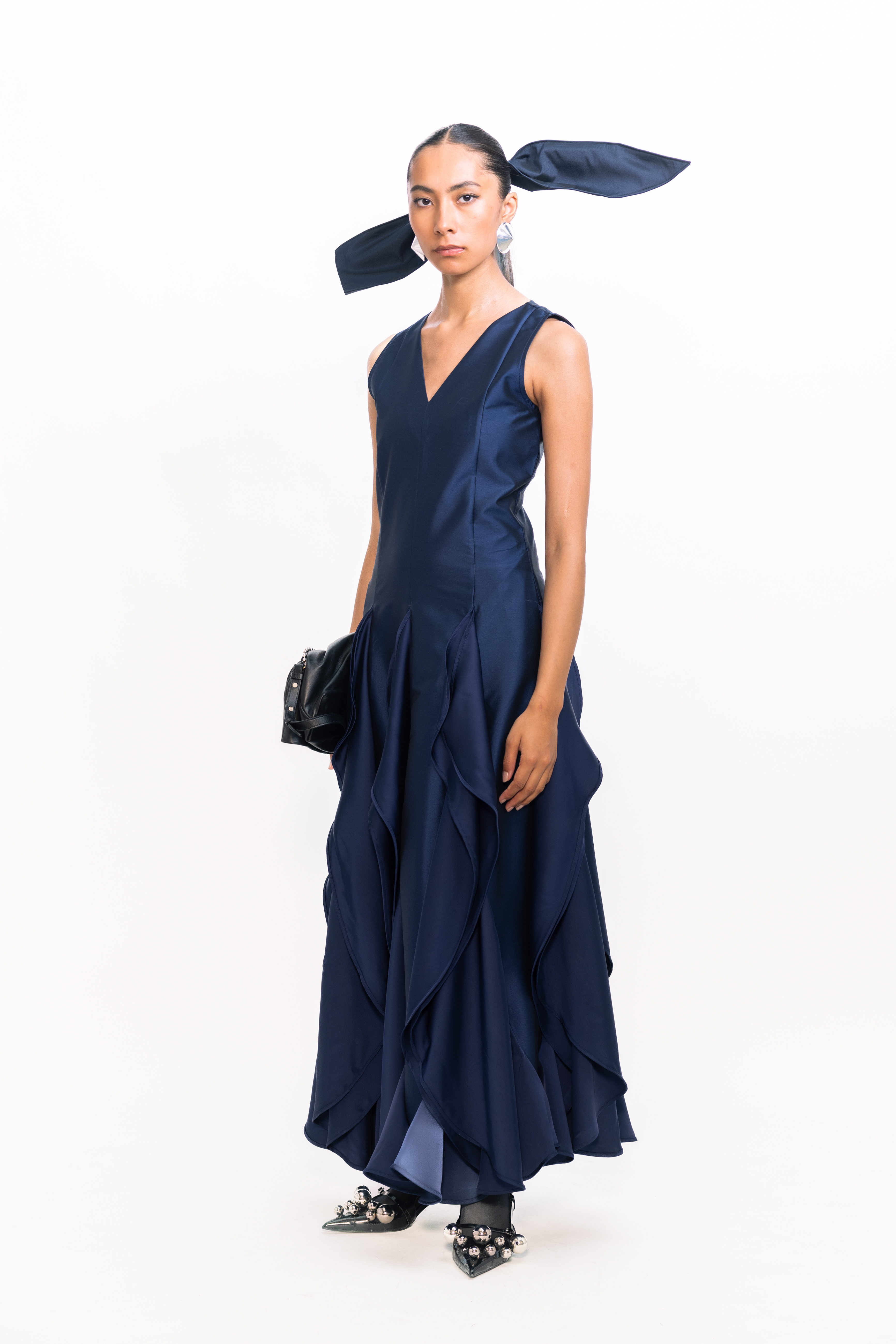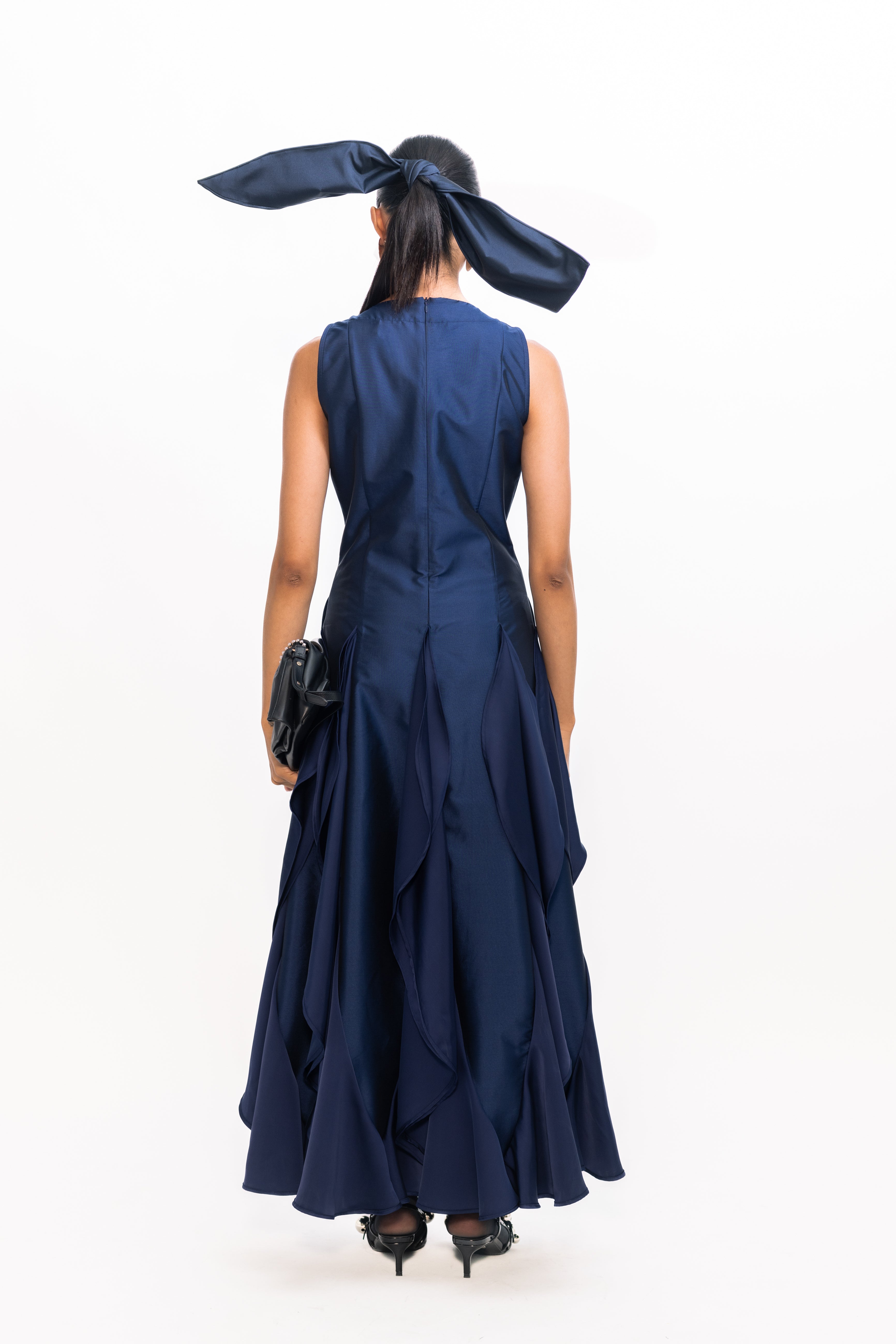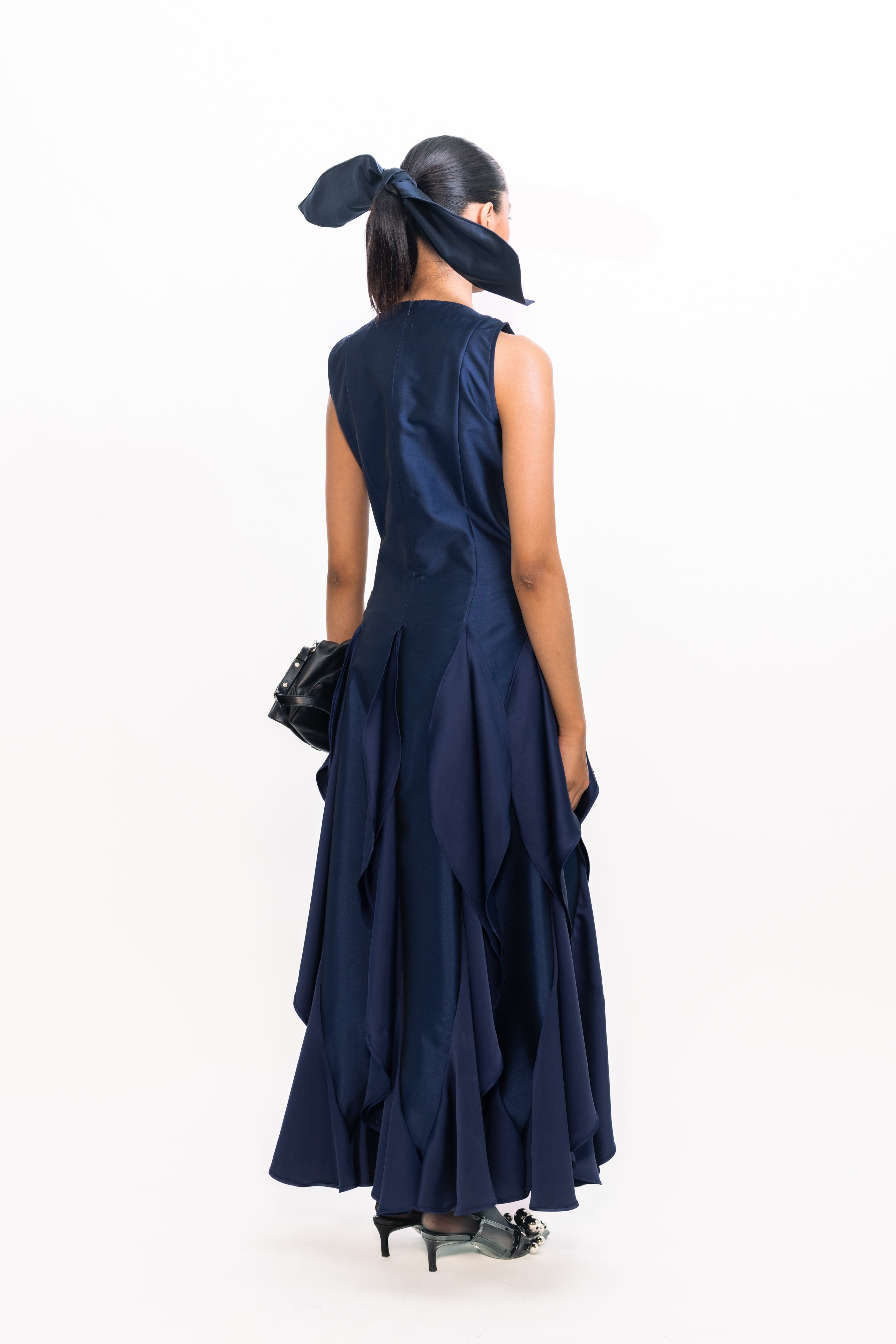 This sophisticated gown features a sleek, fitted bodice with a flattering V-neckline that elongates the silhouette. The skirt flows into a dramatic cascade of pleats at the hem, creating graceful movement and a touch of modern romance—ideal for formal events or elegant evening occasions.