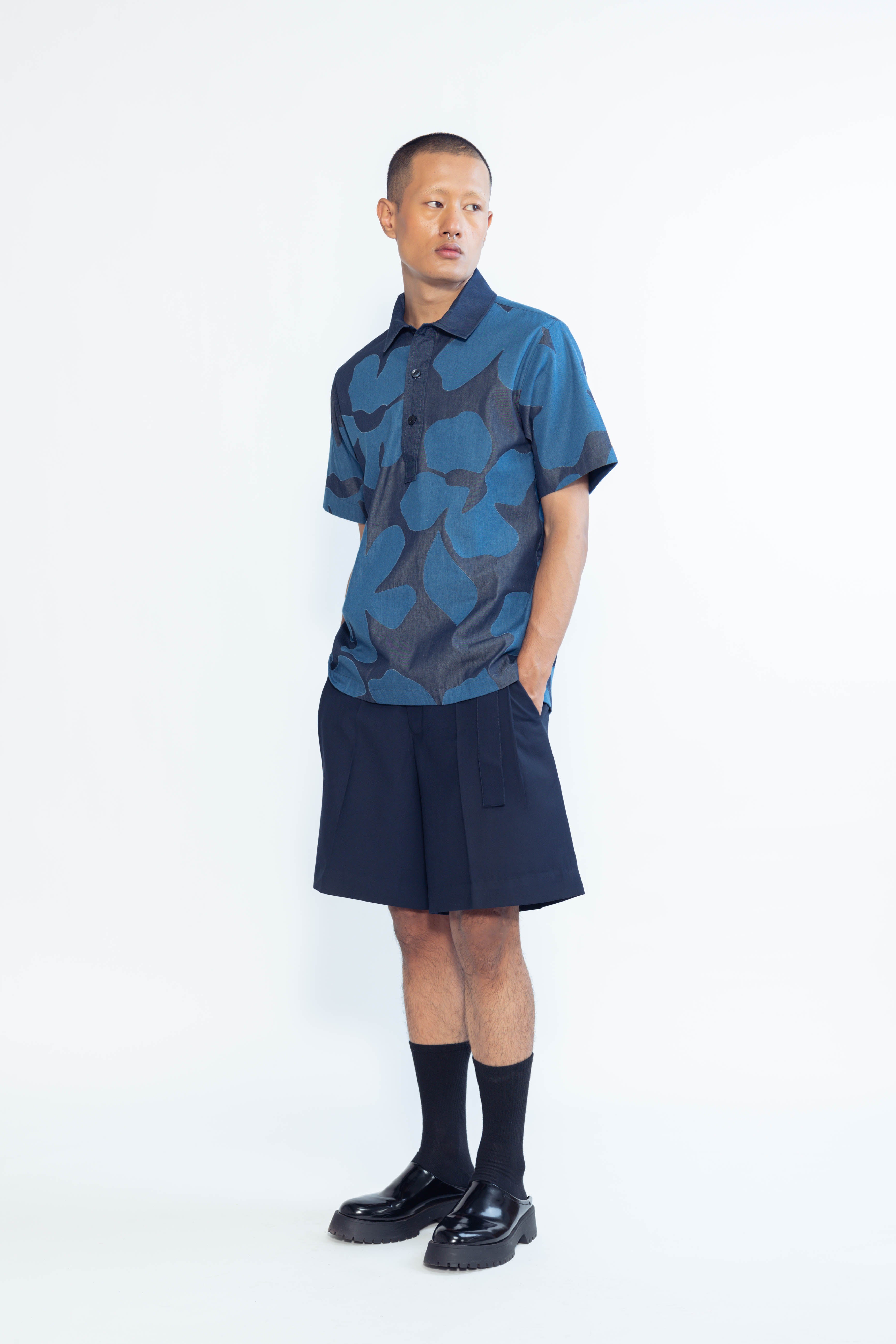 A structured reinterpretation of the classic polo, this piece stands out with layered tonal contrast and surface detail. Cut from mixed shades of denim, it features all-over floral appliqué — adding texture that plays subtly against the base. The fit and sleeves offer ease, while the length keeps the silhouette sharp and modern. A refined mix of craft and utility, made to hold its own.