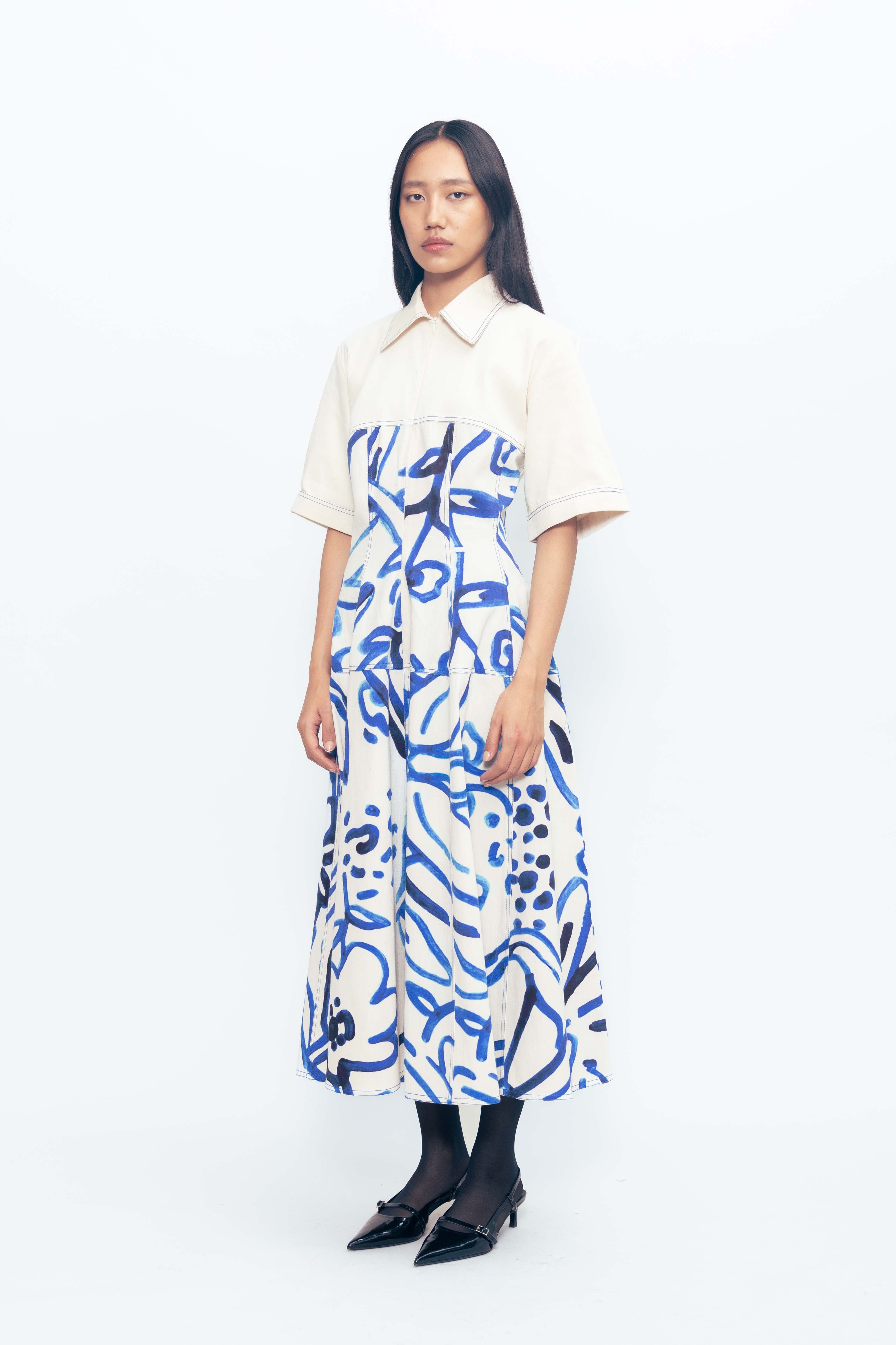 The solid yoke with print paneled midi dress offers a balanced blend of structure and fluidity. Featuring a clean, solid yoke that transitions into artfully arranged printed panels, it creates a striking visual contrast with effortless flow.