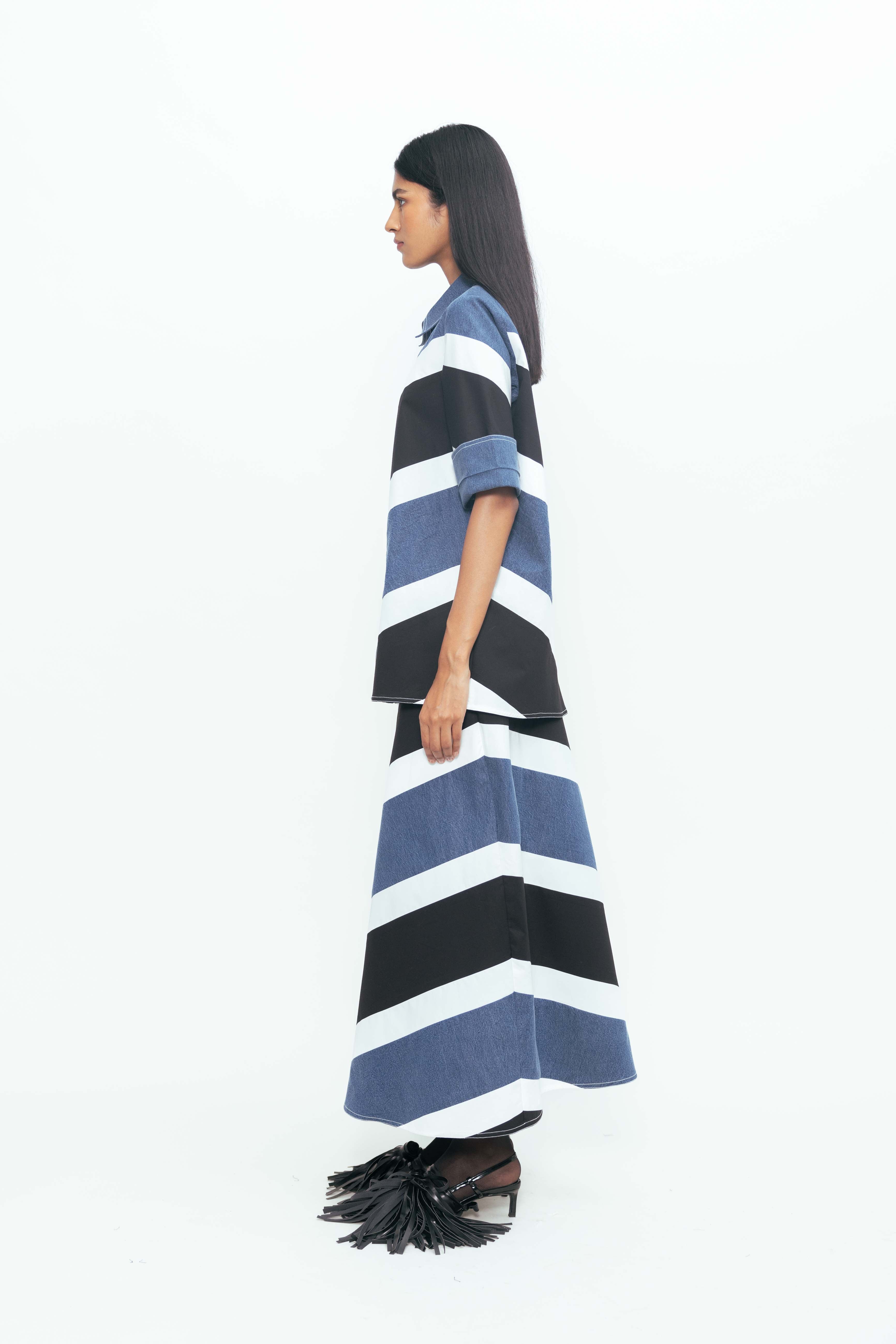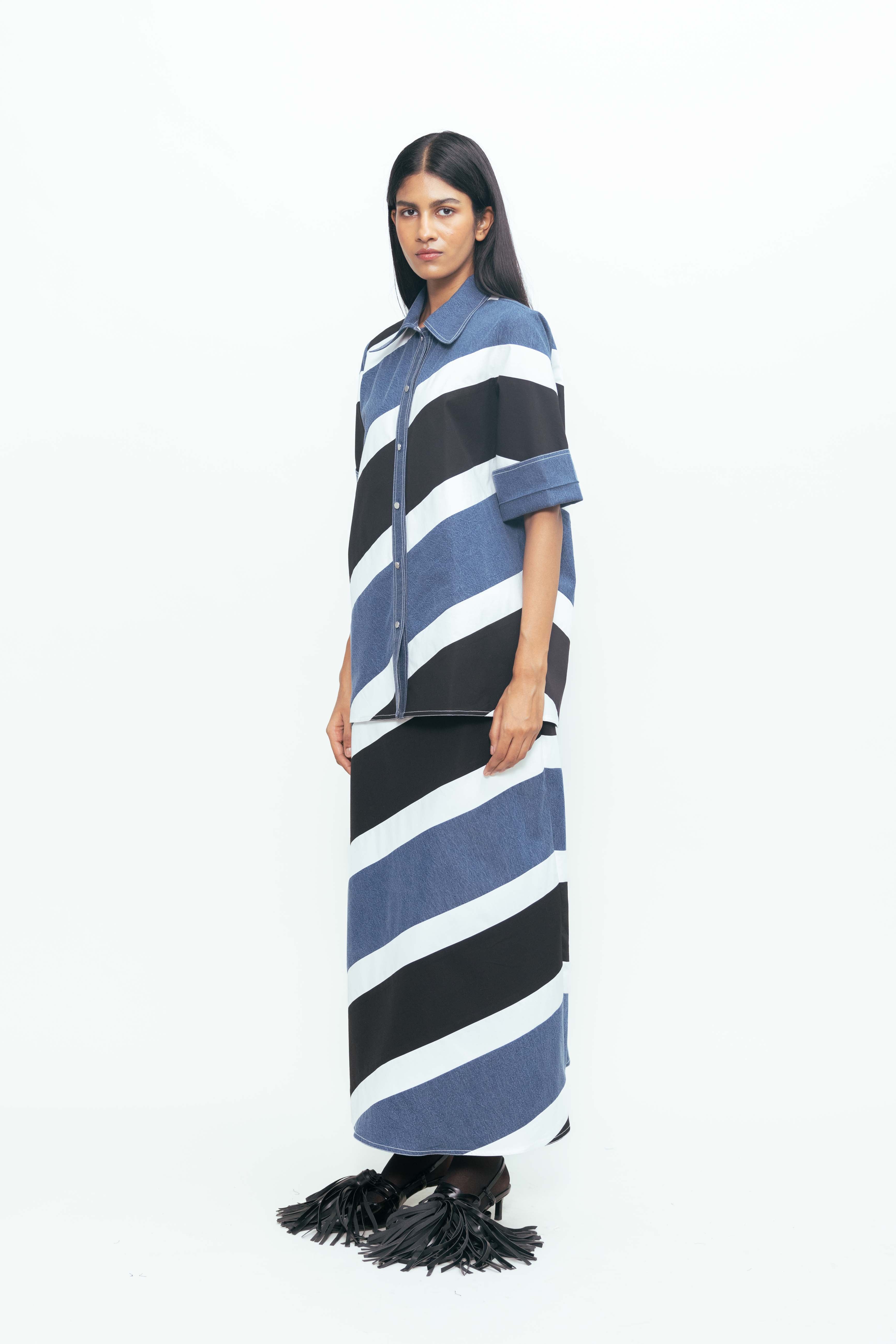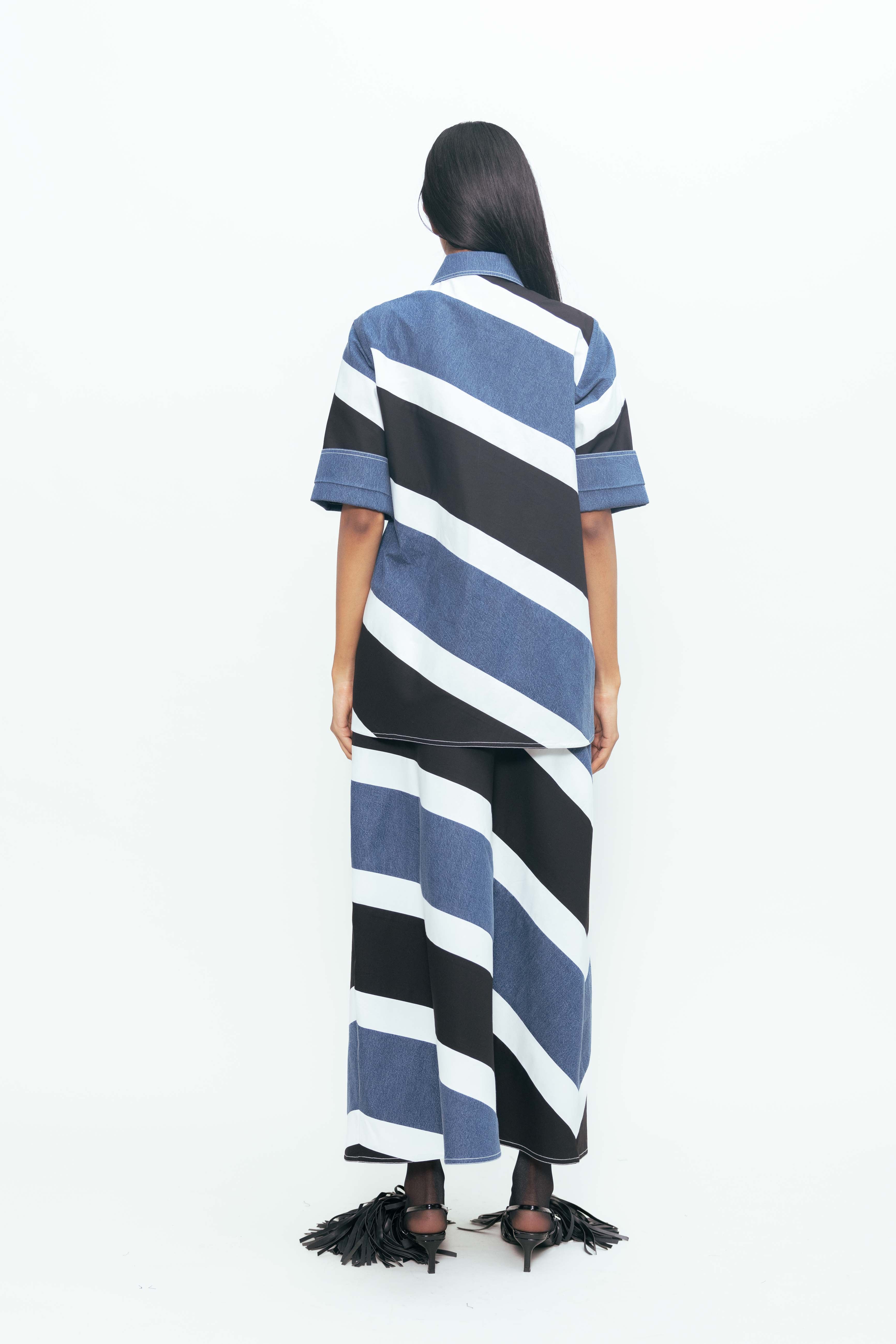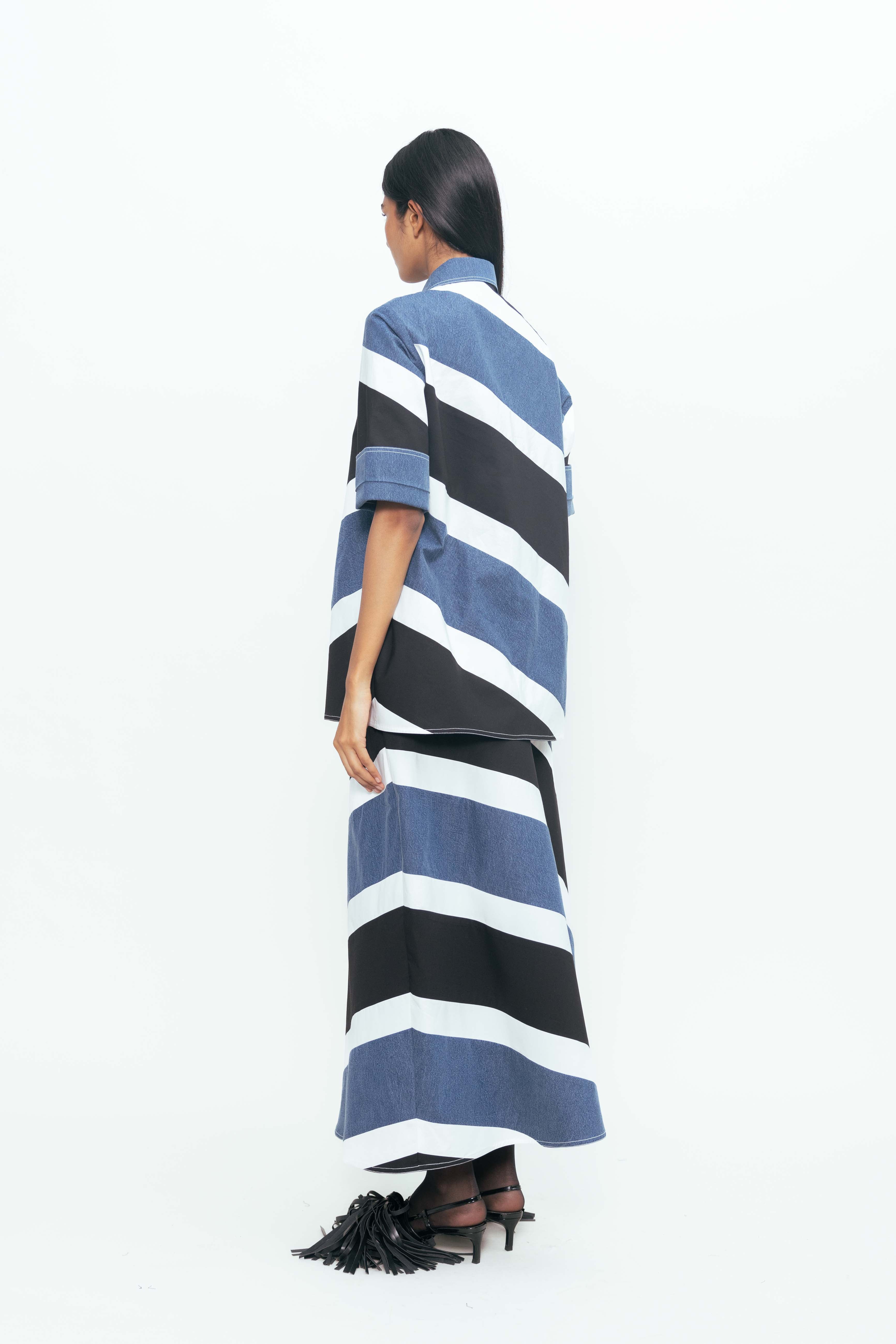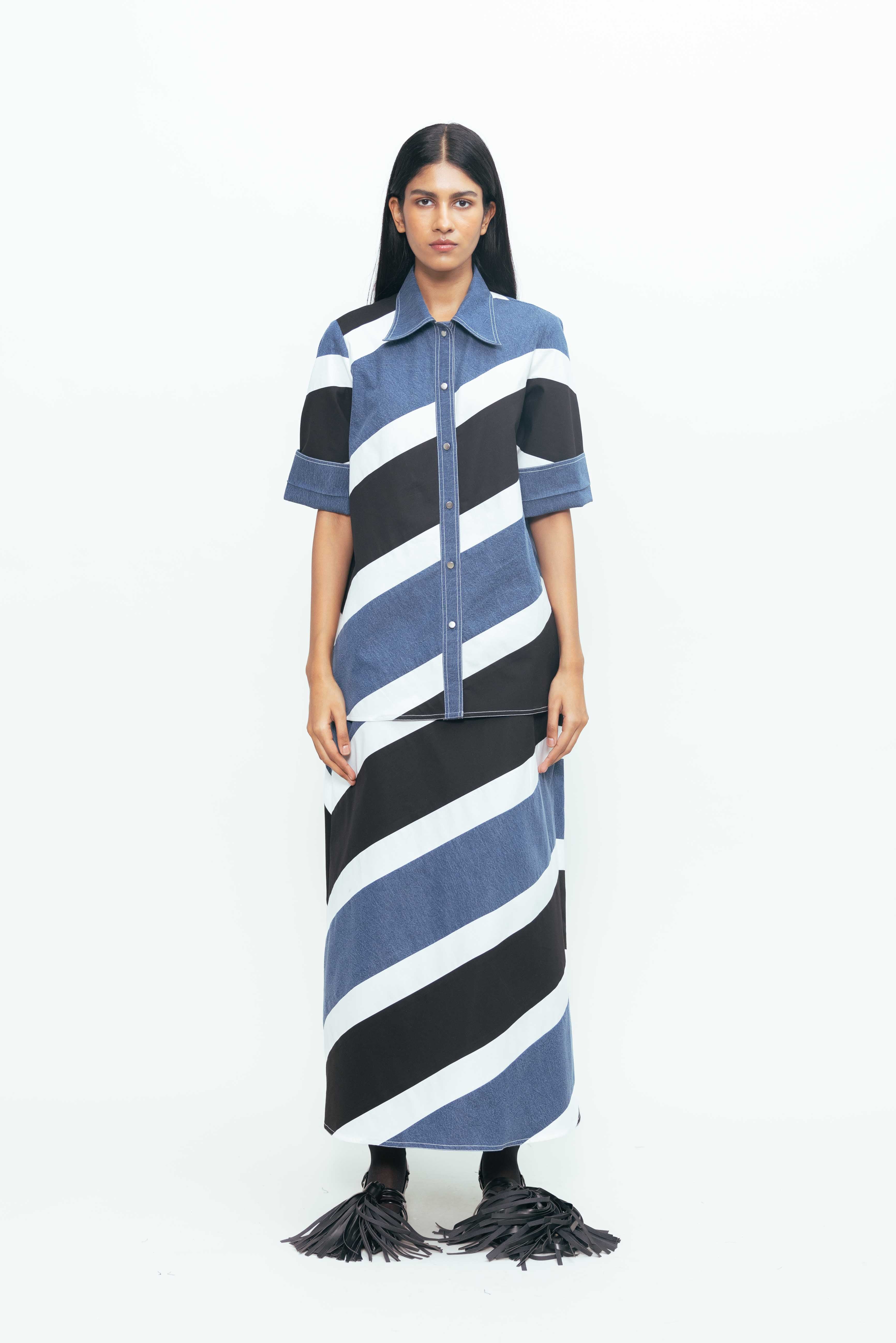 This slant color-blocked box fit midi skirt blends structure with bold visual appeal. Featuring sharp, angled color-block panels, it’s designed in a boxy, midi-length silhouette for a modern, architectural look. The clean lines and crisp fabric make it a statement piece with effortless edge. Ideal for contemporary, standout styling.