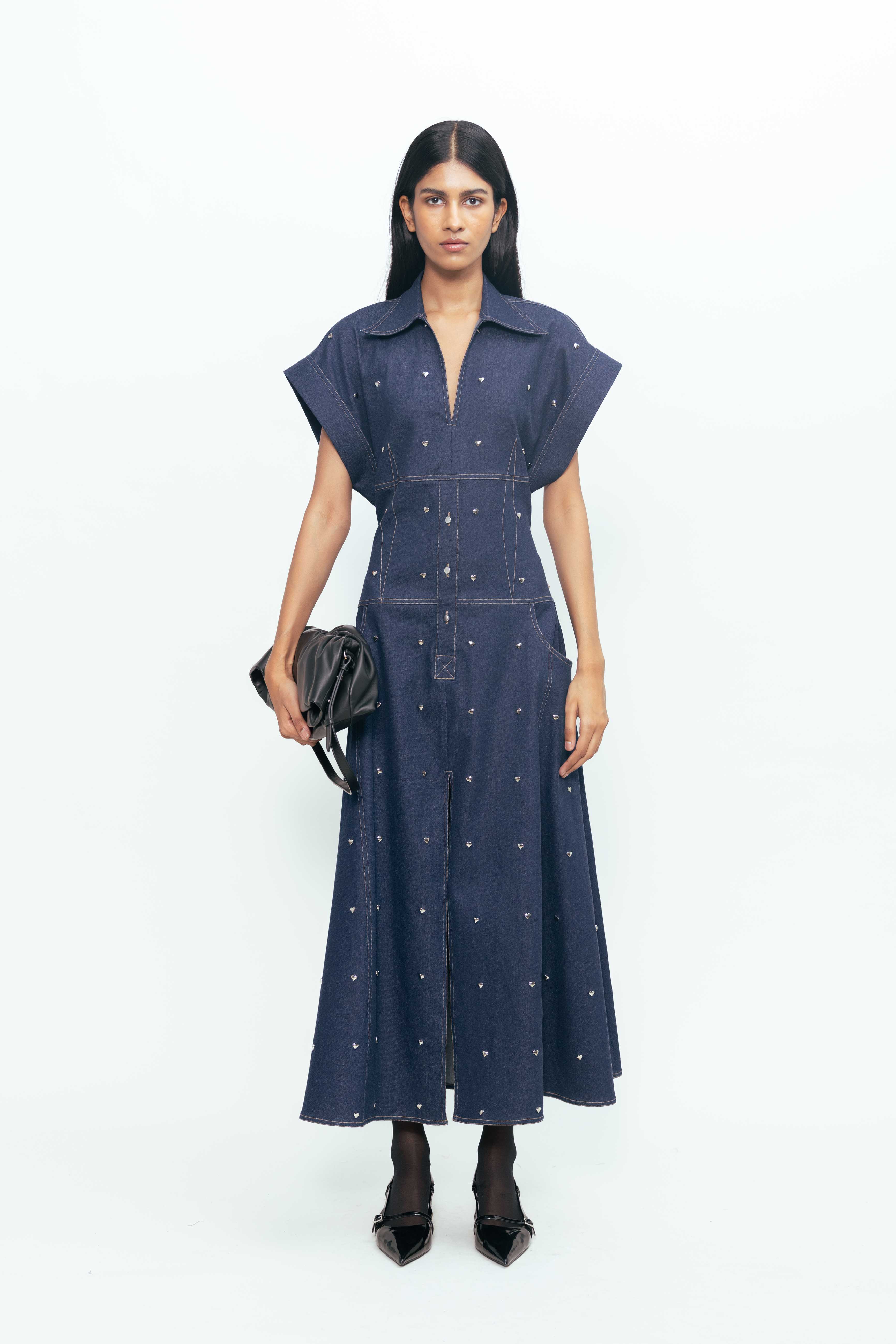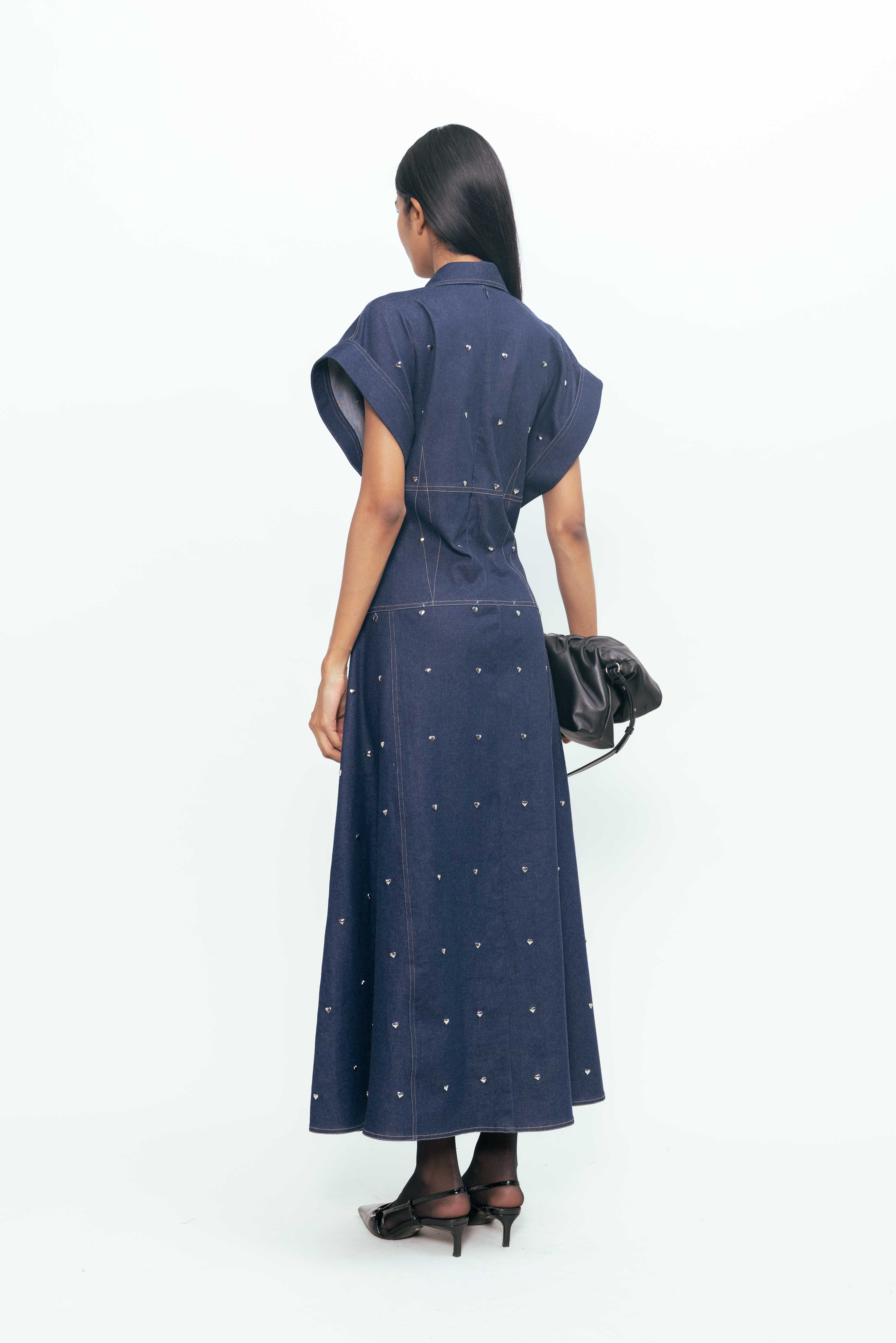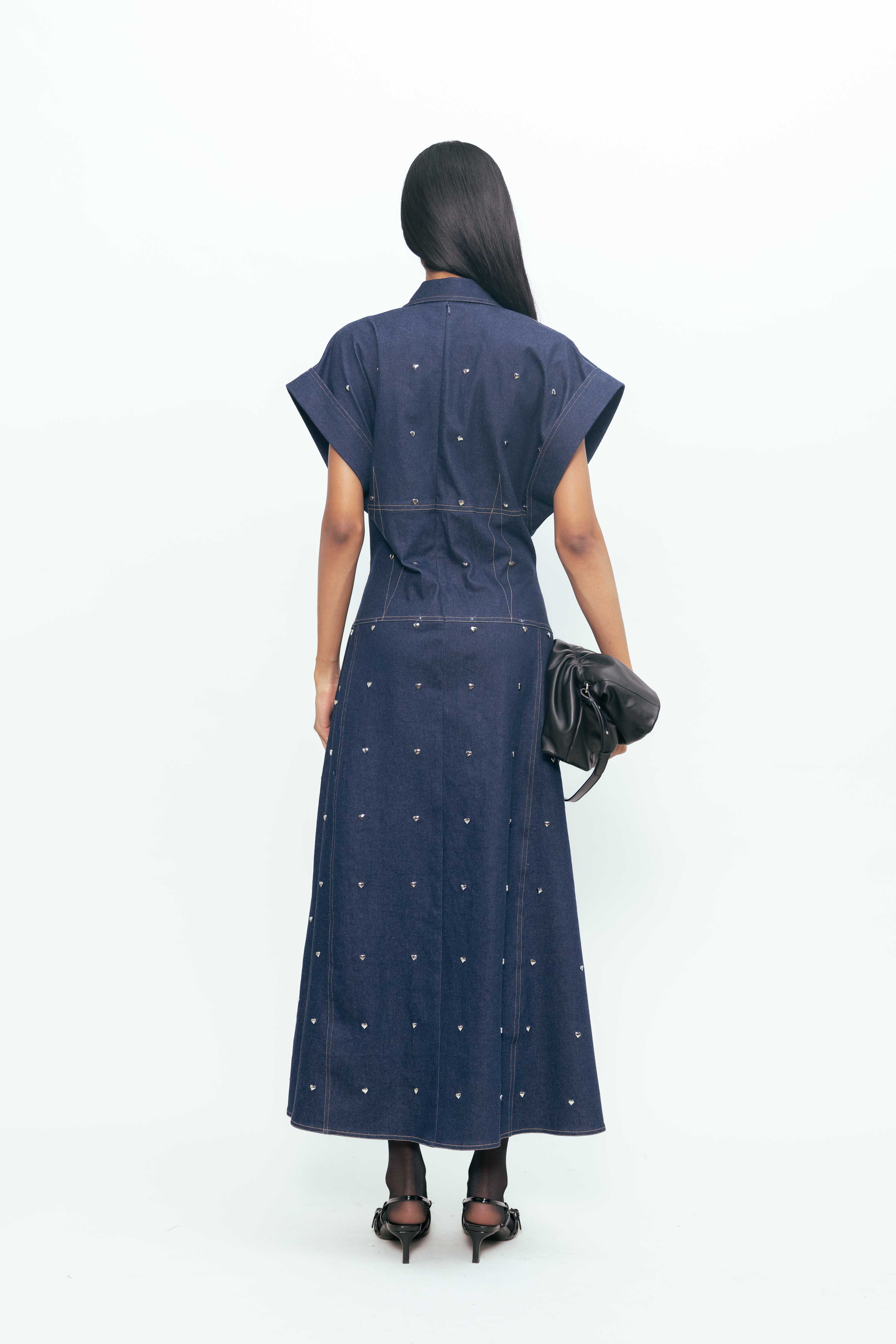 Strong lines meet softened edges in this structured yet expressive piece. Sculpted to hold its shape, it’s detailed with metallic accents—small heart-shaped hardware that adds a playful tension against the form’s clean geometry. The deep, tonal surface lends a grounded feel, while precise seams and paneling give it clarity and confidence. A study in contrast: tough, tender, and unmistakably bold.