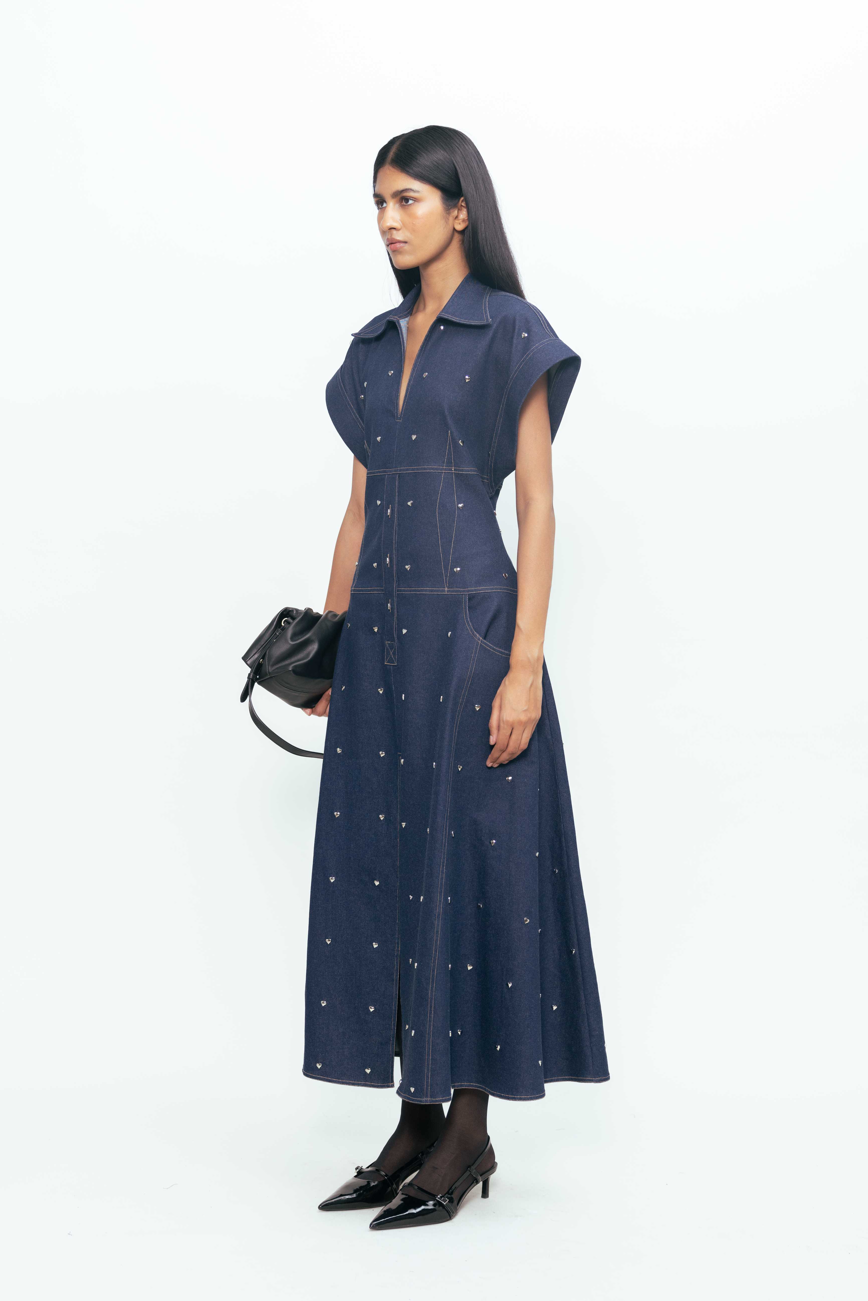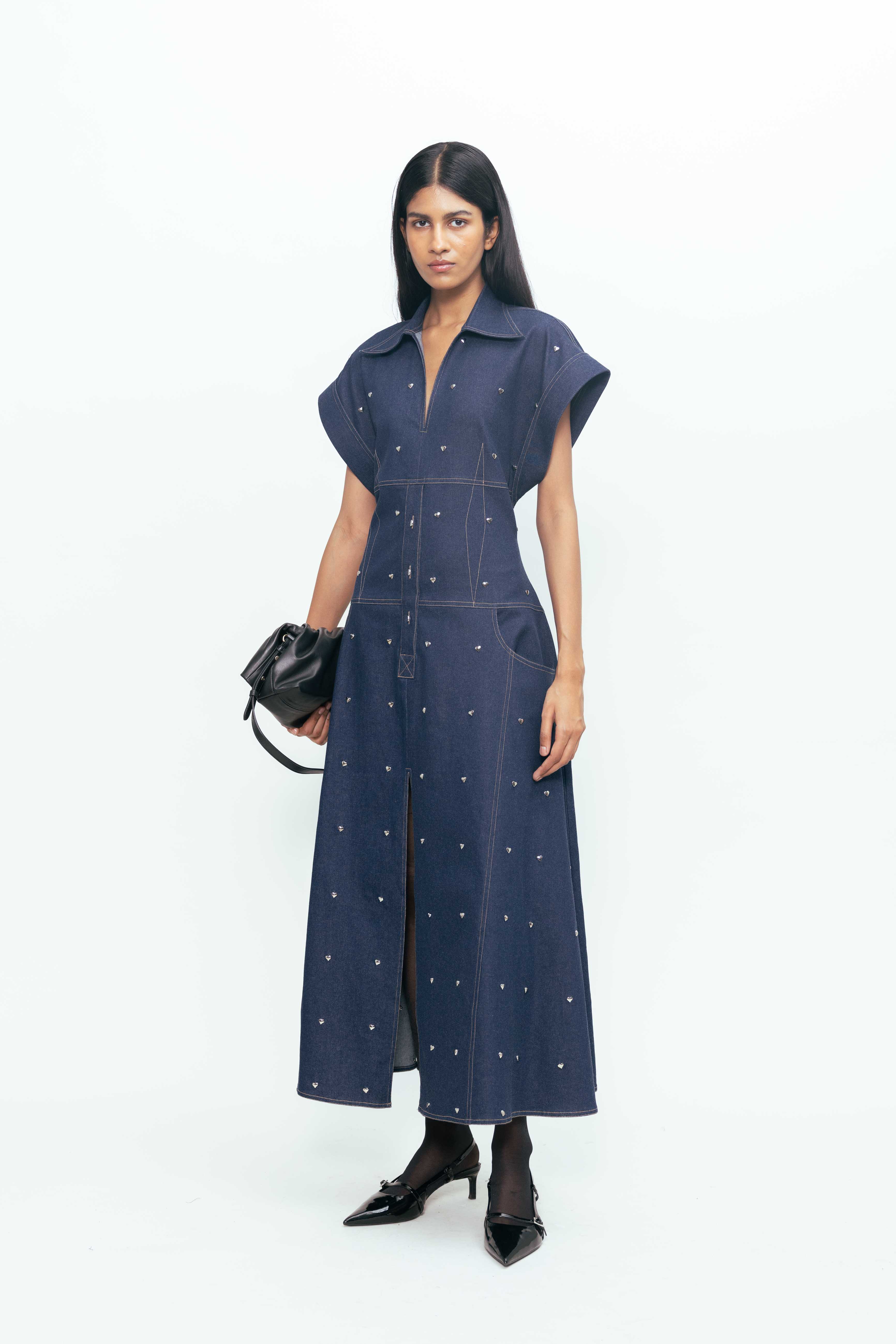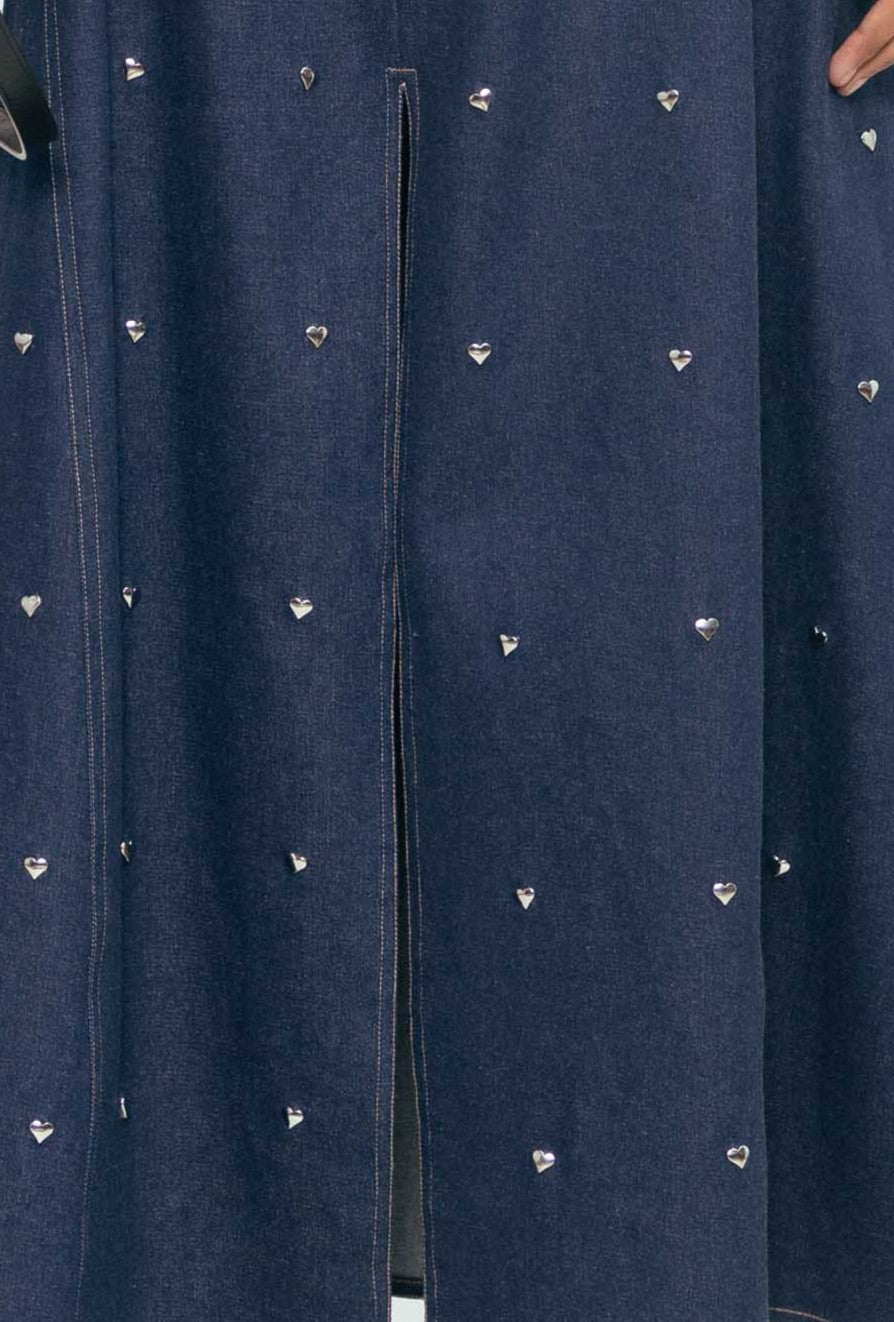 Strong lines meet softened edges in this structured yet expressive piece. Sculpted to hold its shape, it’s detailed with metallic accents—small heart-shaped hardware that adds a playful tension against the form’s clean geometry. The deep, tonal surface lends a grounded feel, while precise seams and paneling give it clarity and confidence. A study in contrast: tough, tender, and unmistakably bold.