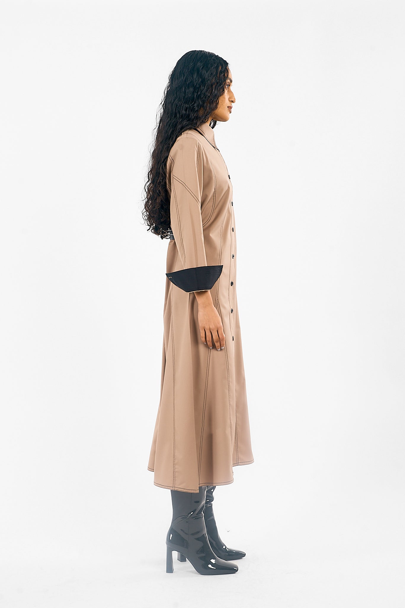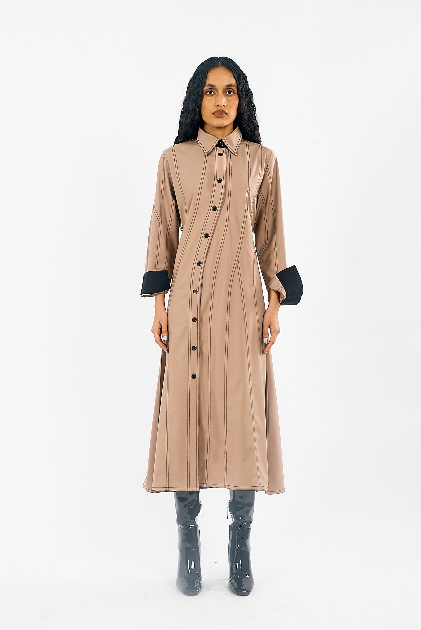 This full-sleeved paneled dress with a slant placket and contrast topstitching combines structured panels with modern detailing for a sophisticated and versatile look