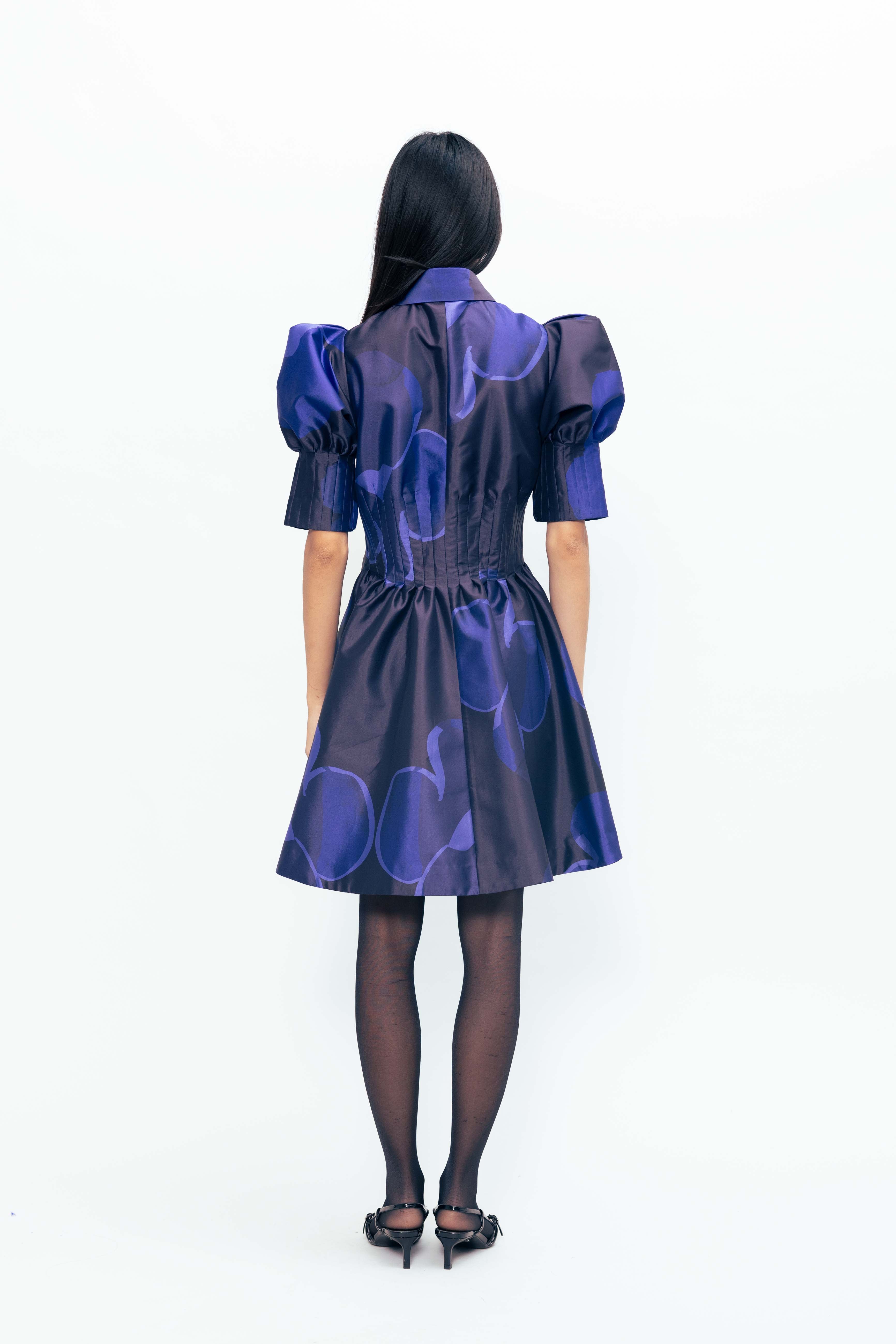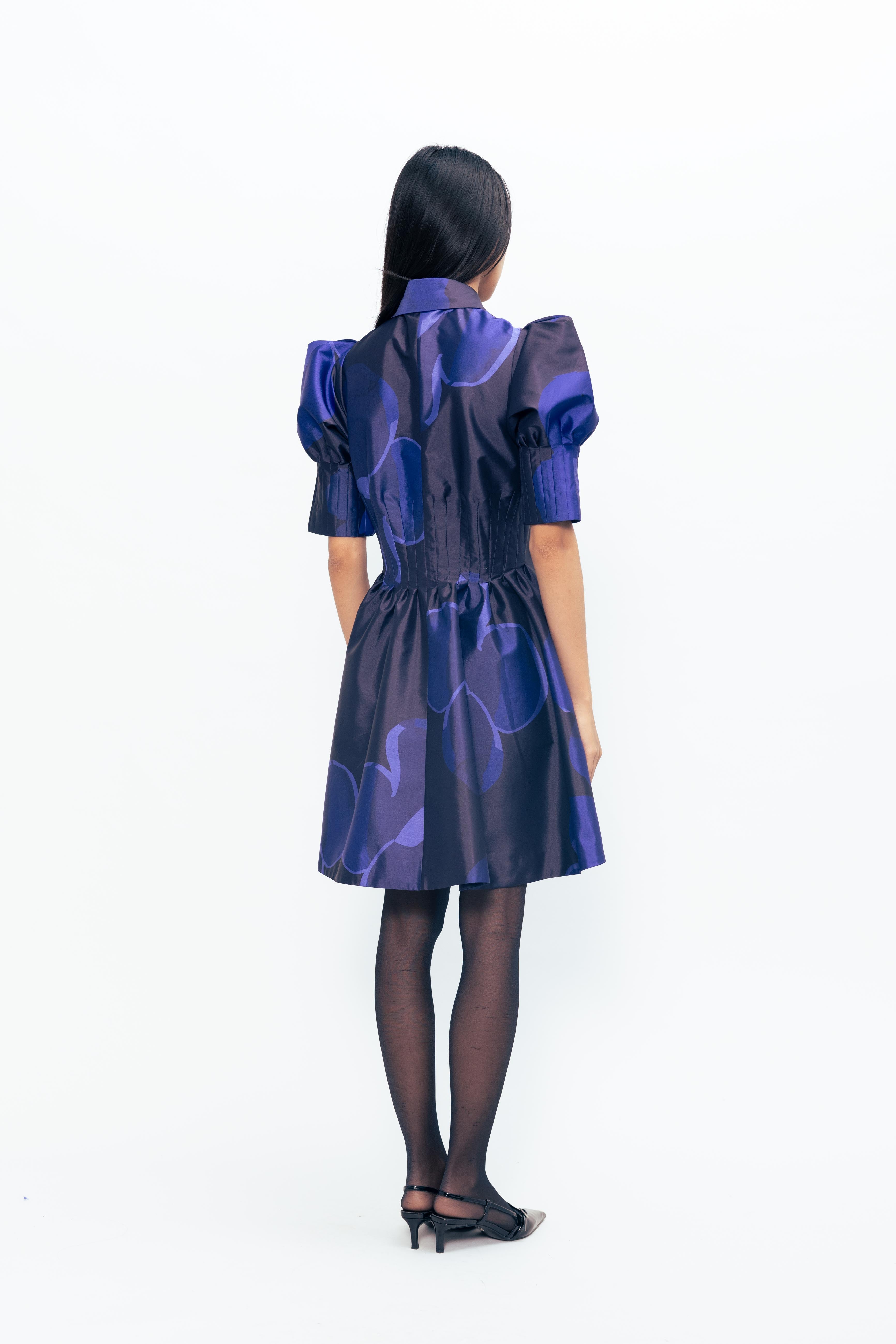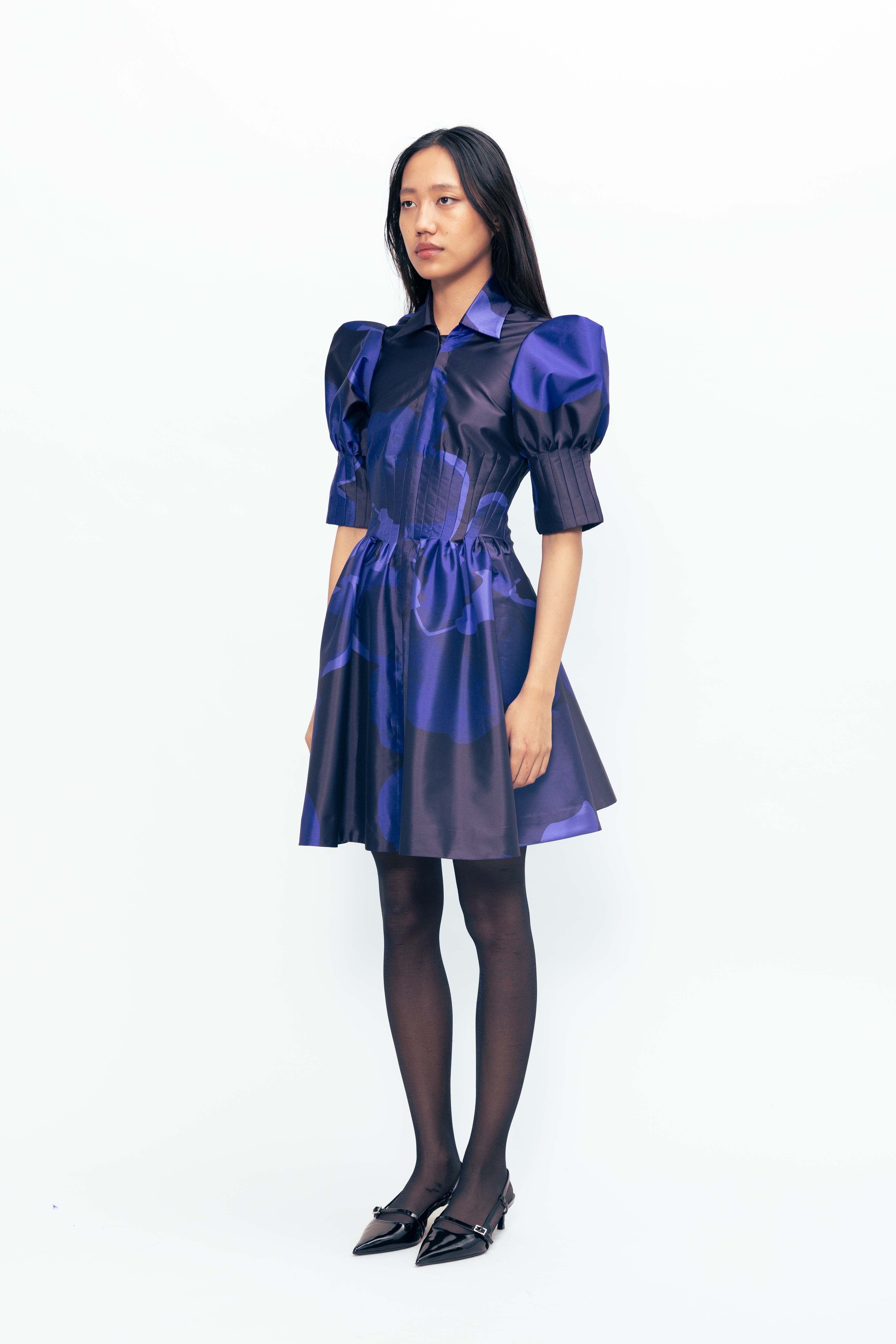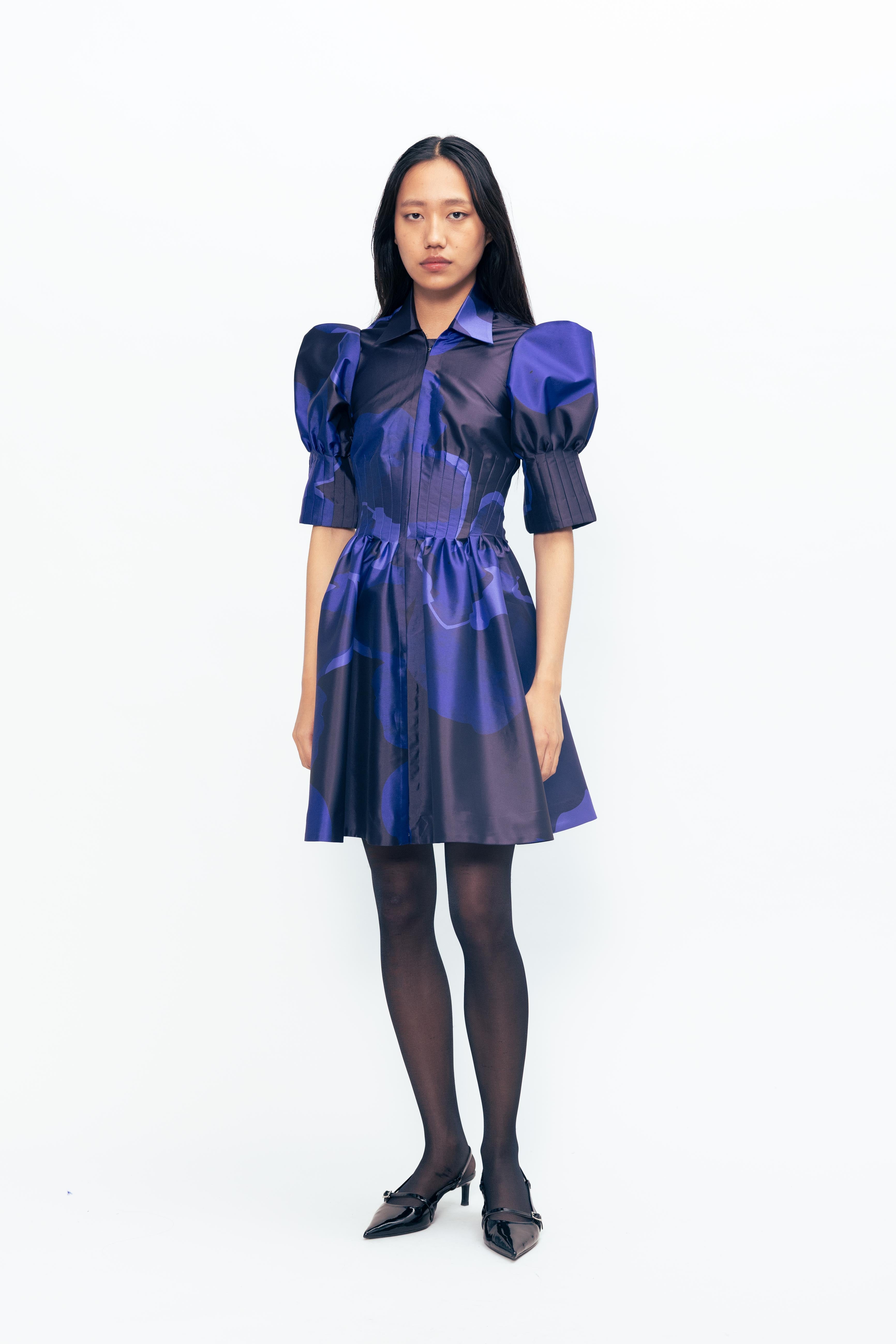 A bold silhouette softened by bloom-like detailing, this piece holds its shape with quiet drama. The sleeves lift gently, creating volume that contrasts with a closely darted bodice—structured, yet easy. The surface comes alive with vivid florals, scattered across a crisp, luminous base that catches light with every movement. Striking but not loud, it carries presence with refined confidence.