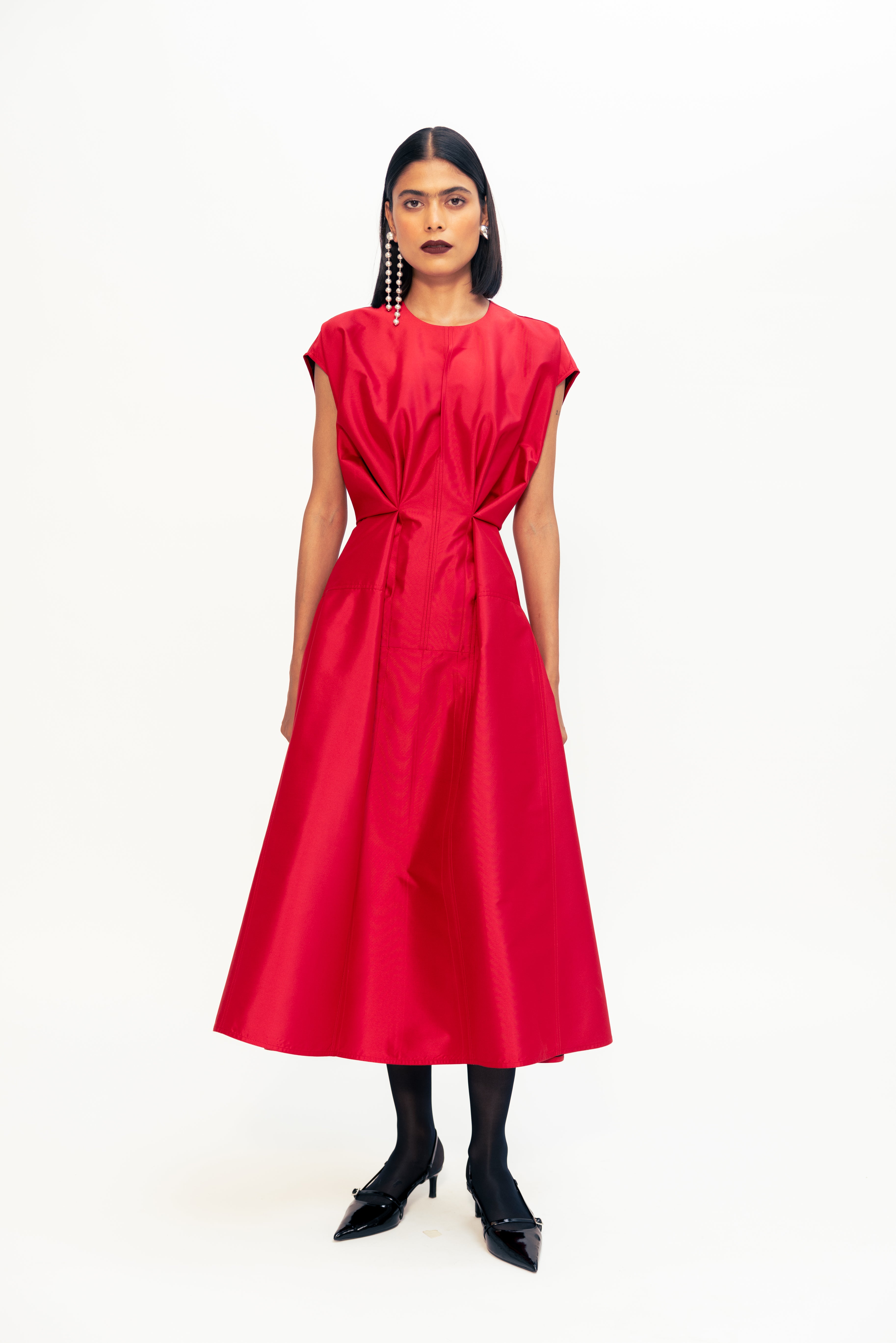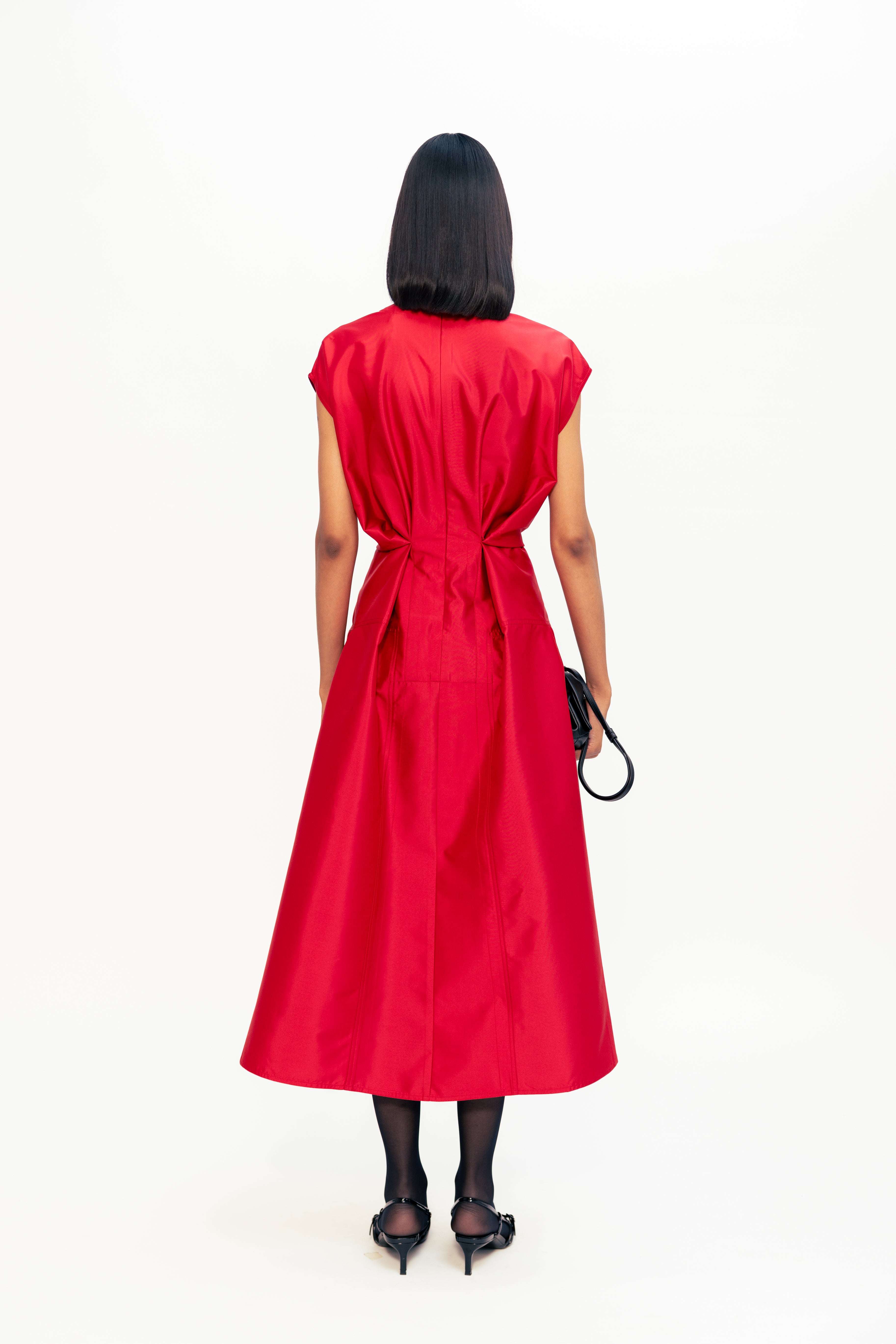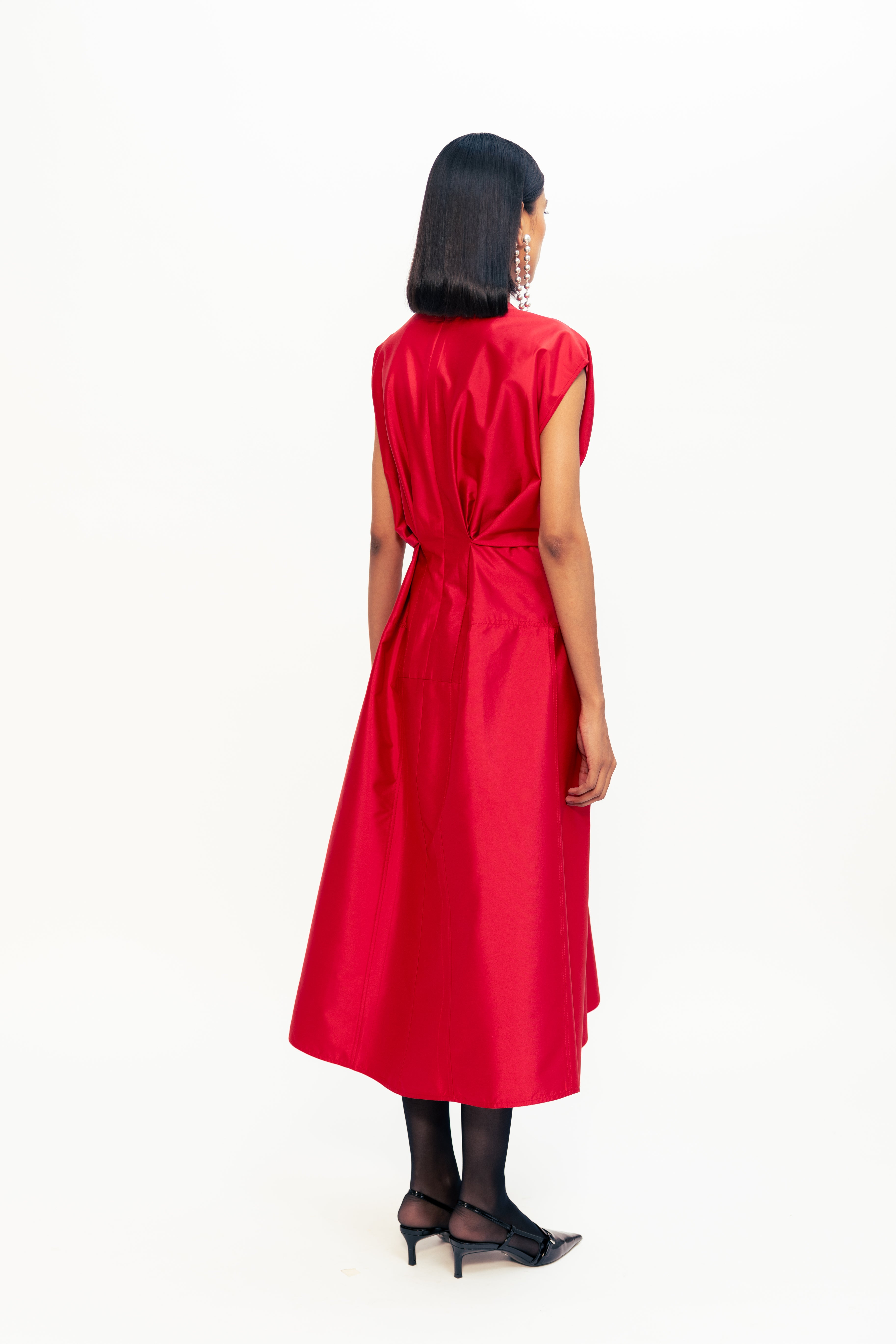 Defined by sharp folds and a sculpted waistline, this piece blends ease with architectural precision. The shoulder structure adds quiet strength, while subtle draping draws the eye inward, enhancing the silhouette without excess. Clean, uninterrupted lines bring focus to form, making it a refined yet powerful wardrobe standout.