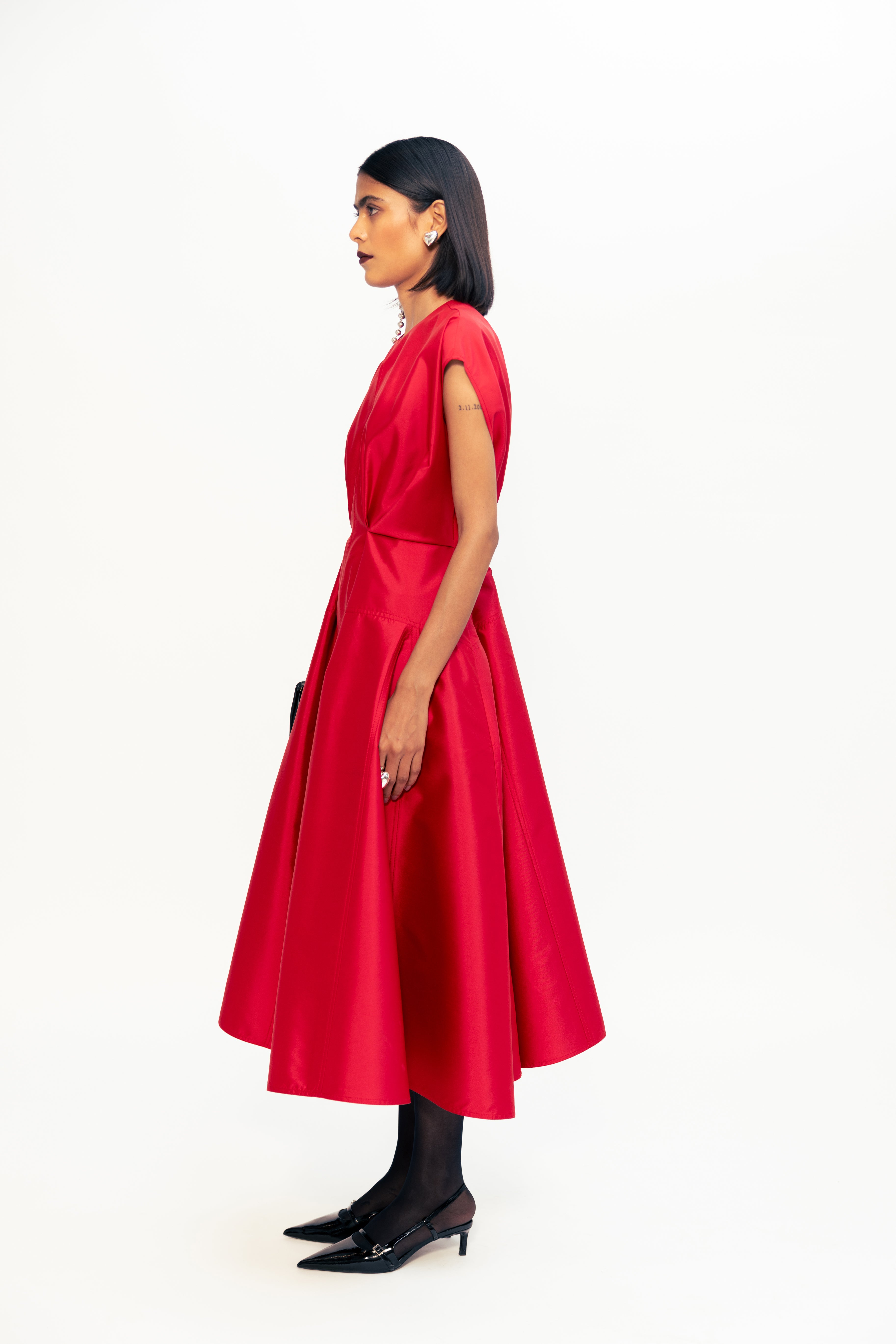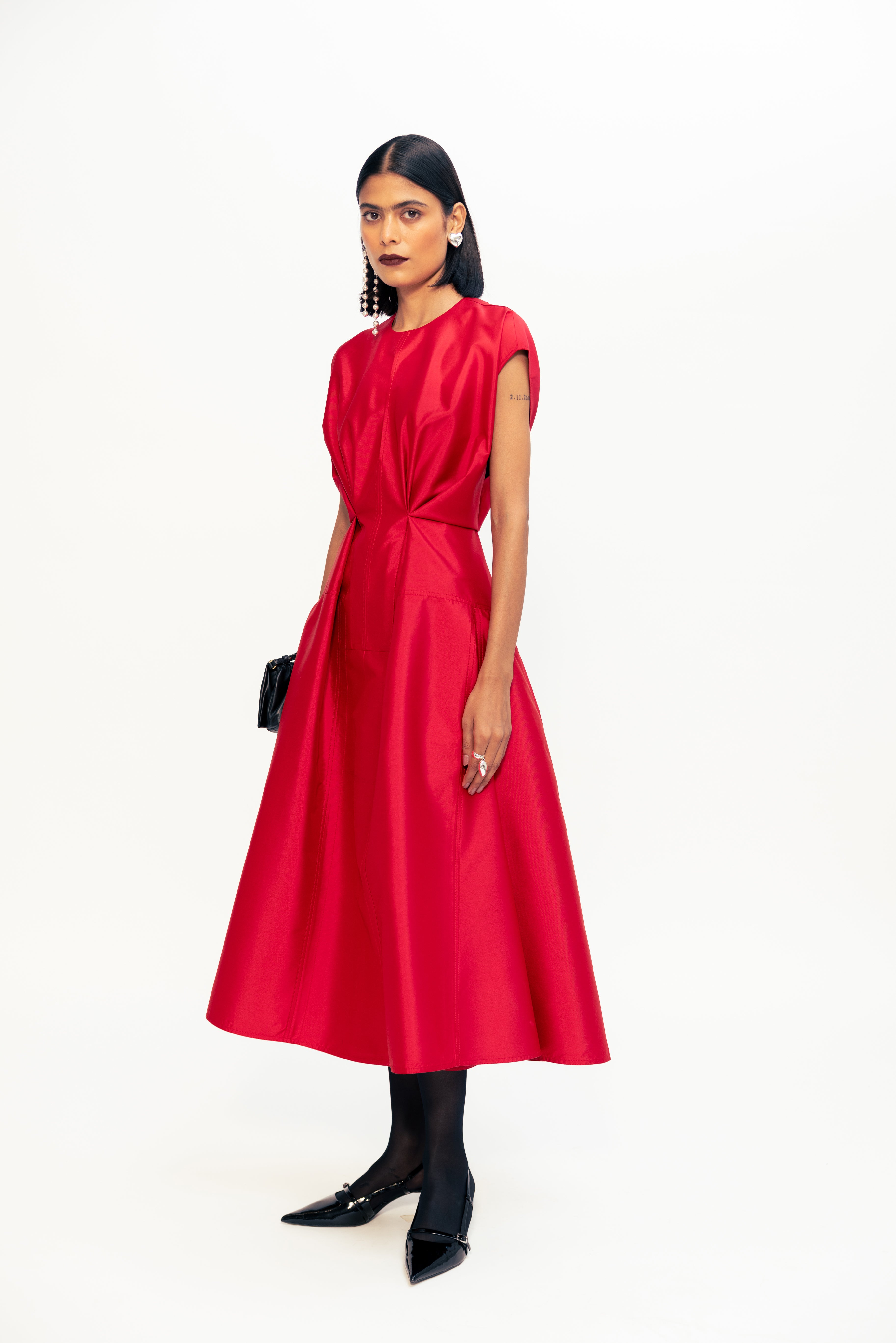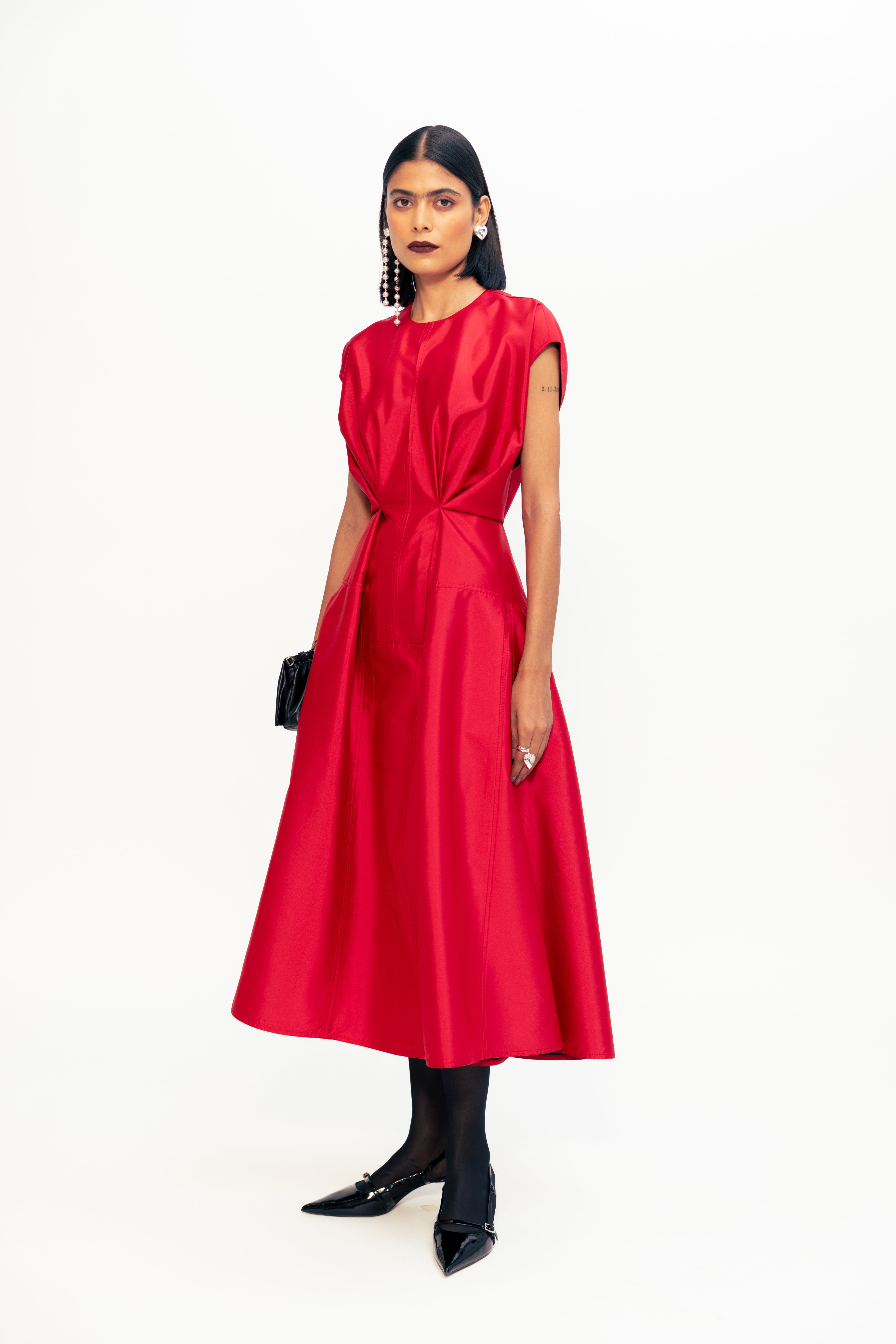 Defined by sharp folds and a sculpted waistline, this piece blends ease with architectural precision. The shoulder structure adds quiet strength, while subtle draping draws the eye inward, enhancing the silhouette without excess. Clean, uninterrupted lines bring focus to form, making it a refined yet powerful wardrobe standout.