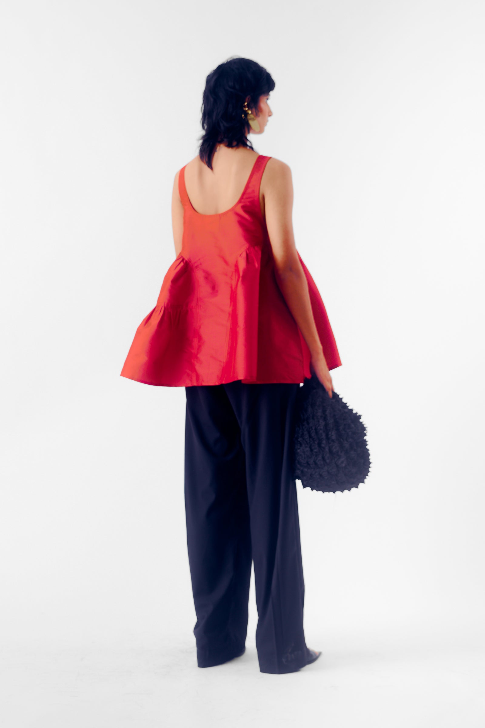 This scooped-neck sleeveless peplum taffeta top with a structured, flared hem that adds a touch of elegance and volume.