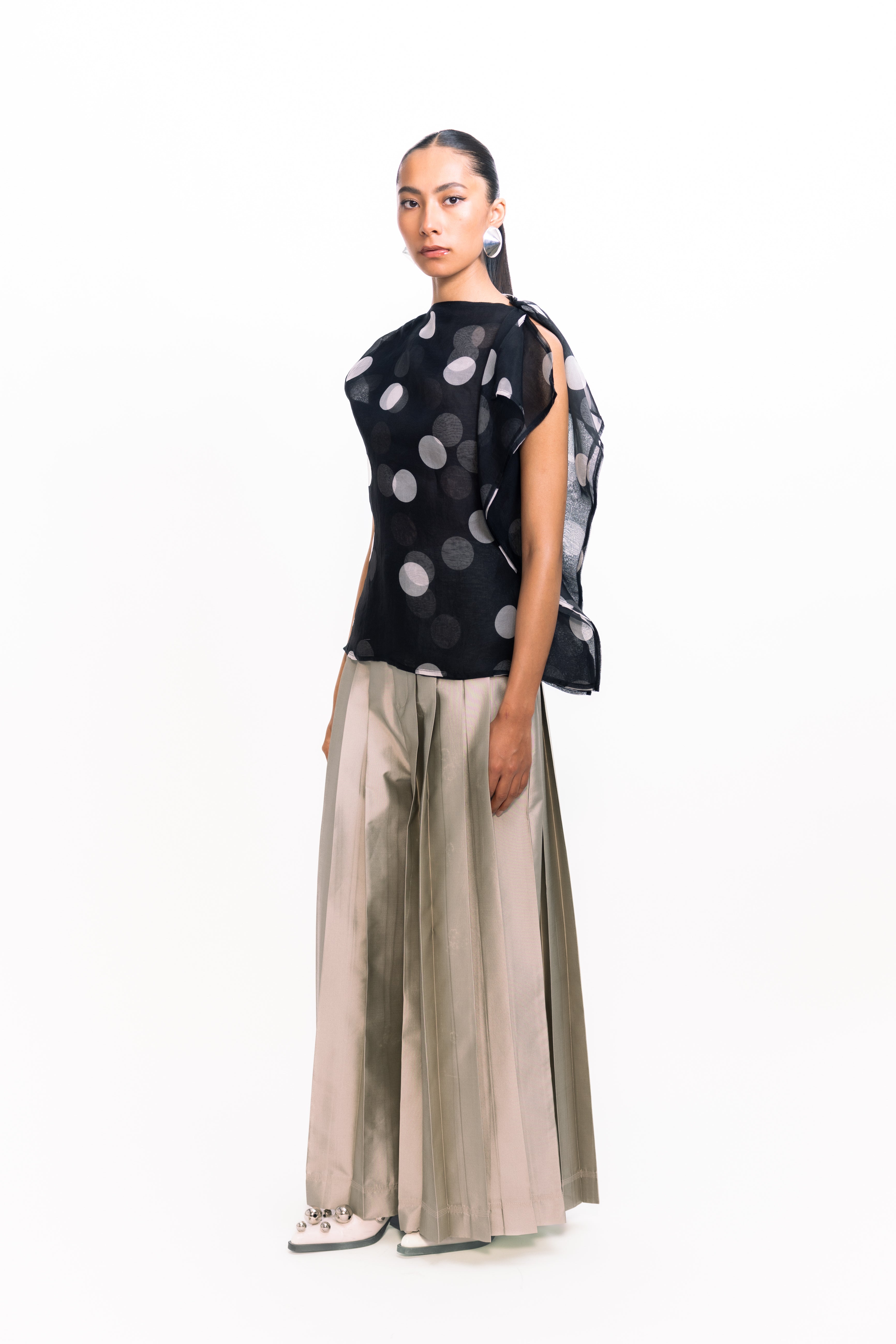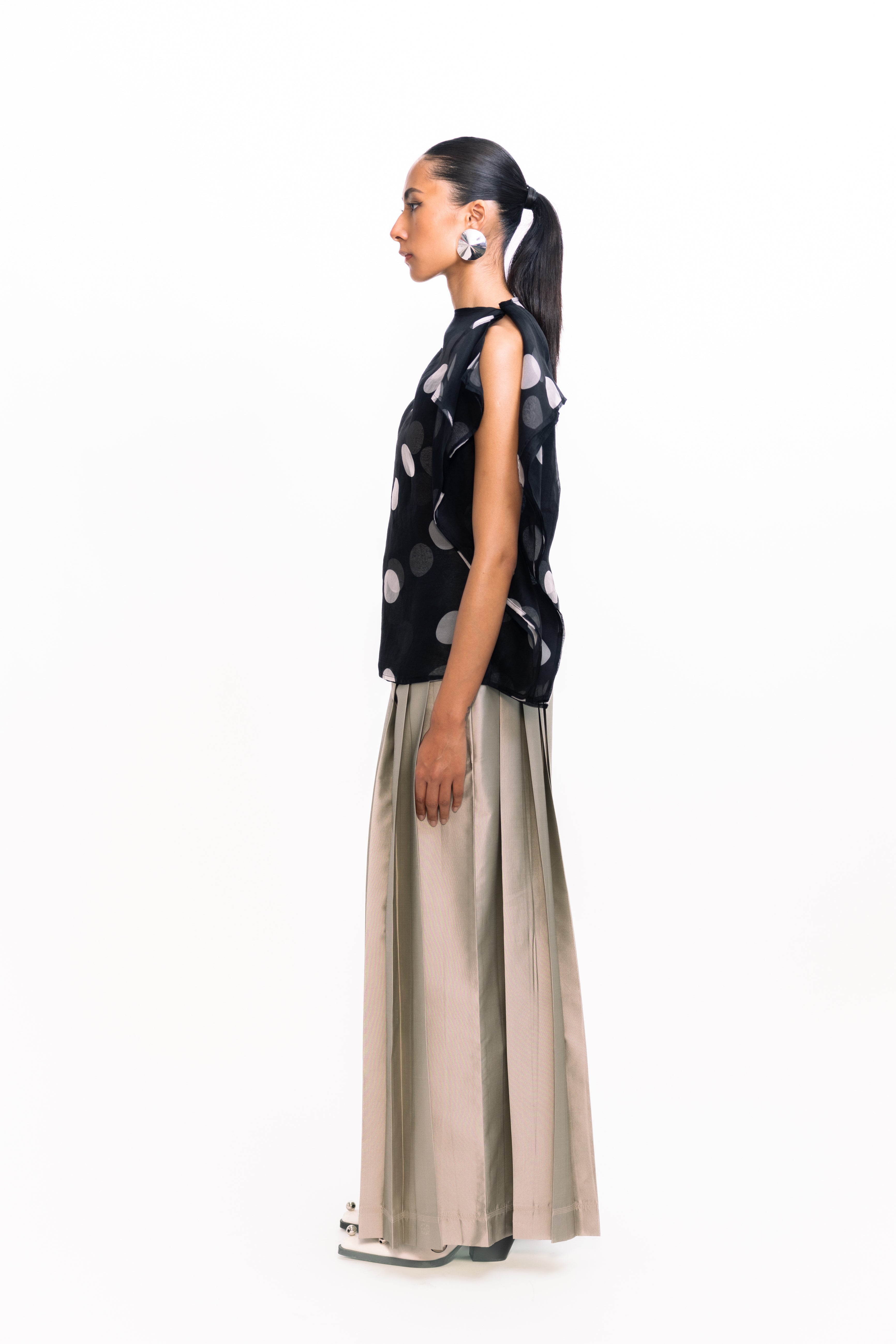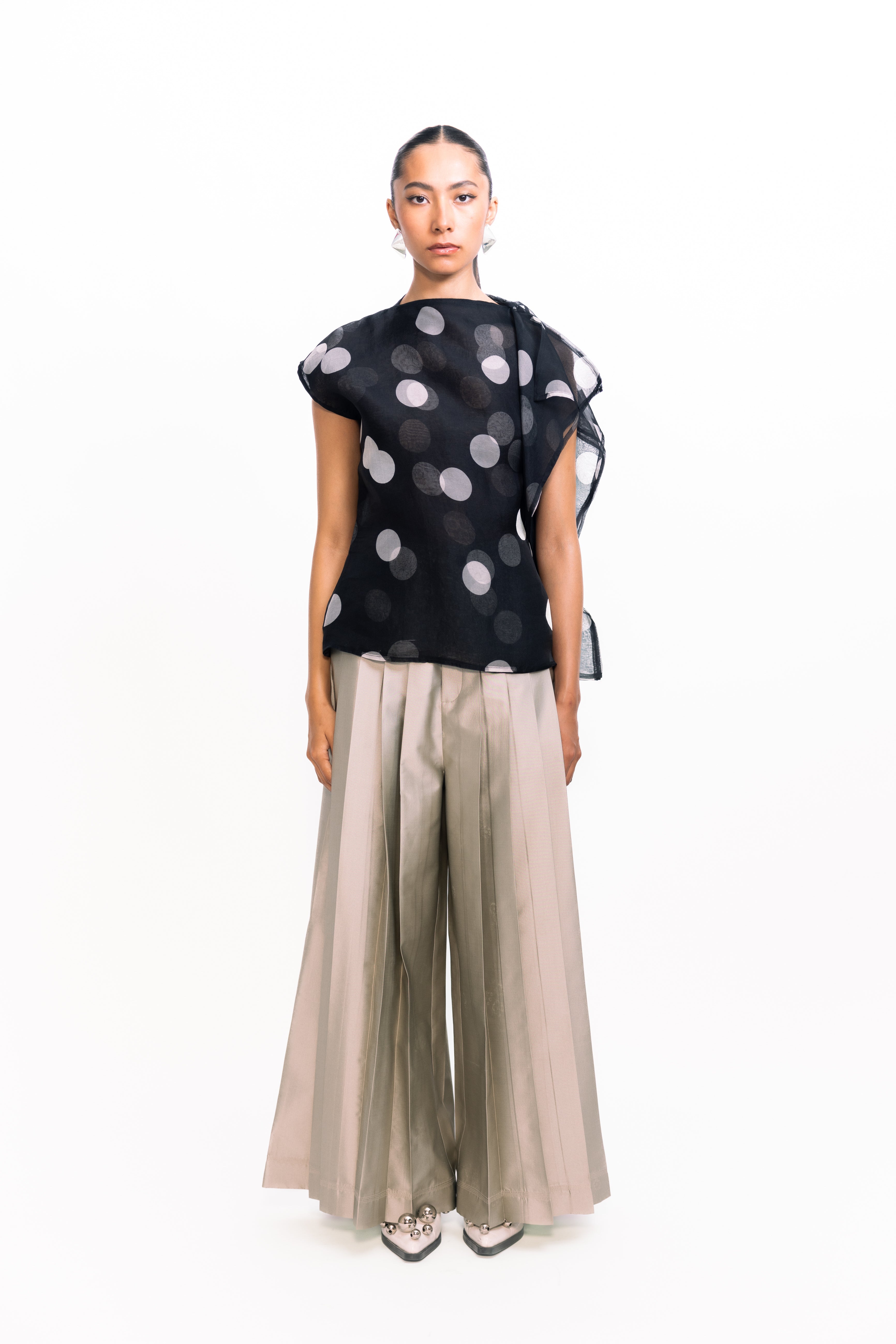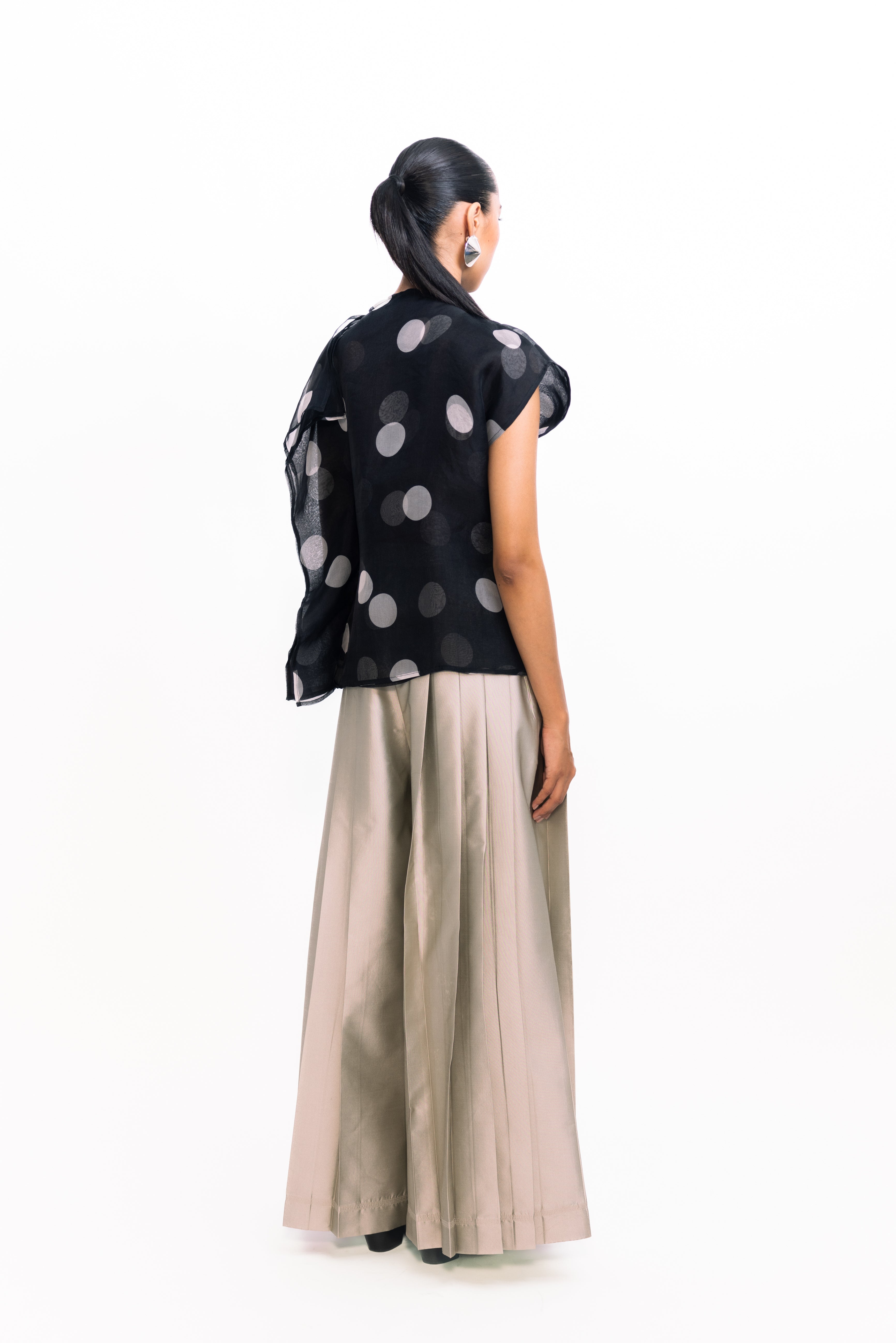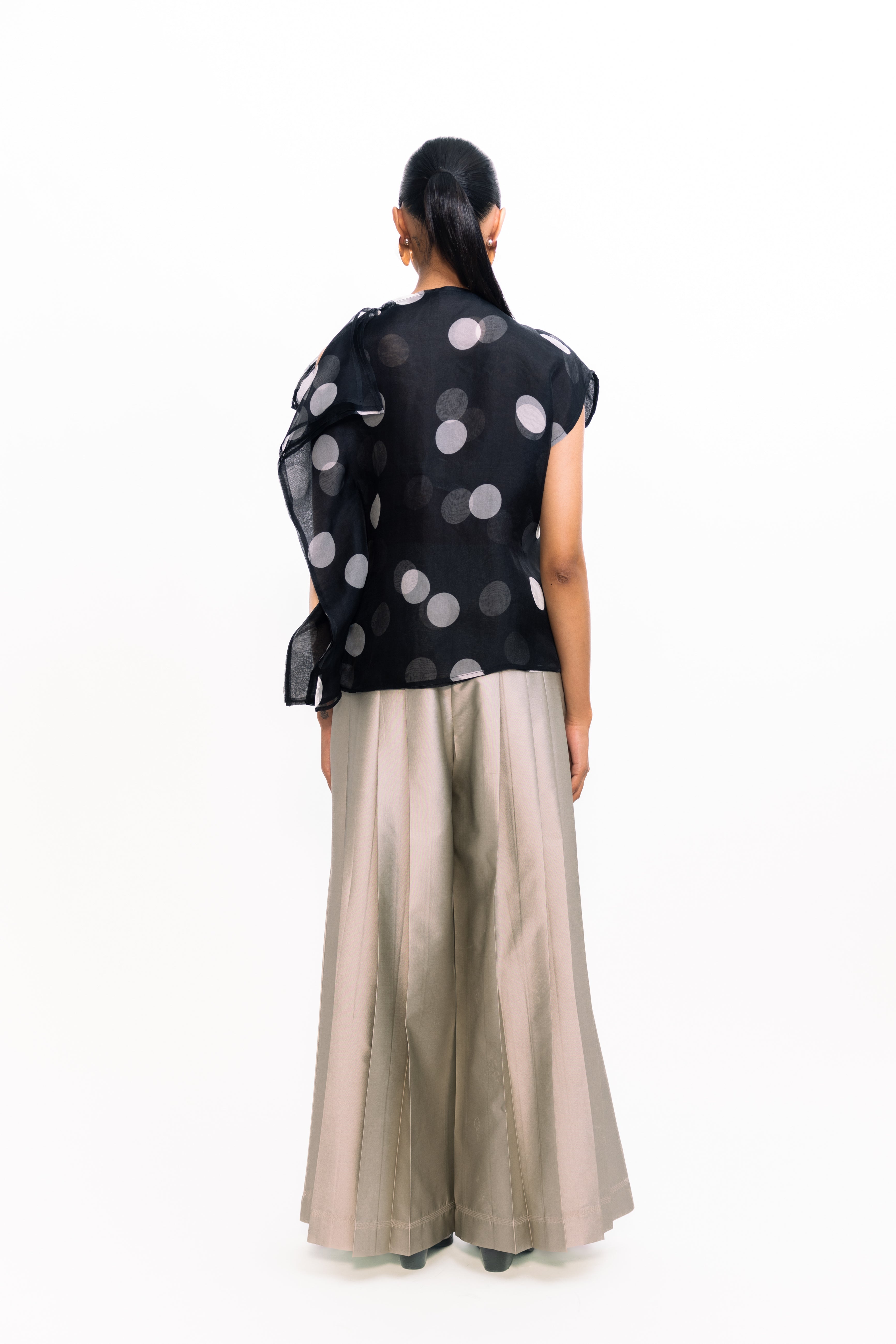 This draped, layered organza top exudes ethereal elegance. Sheer, weightless layers create soft movement and dimension, while the fluid drape adds a romantic, modern touch. Perfect for evening occasions or as a statement piece over sleek separates
