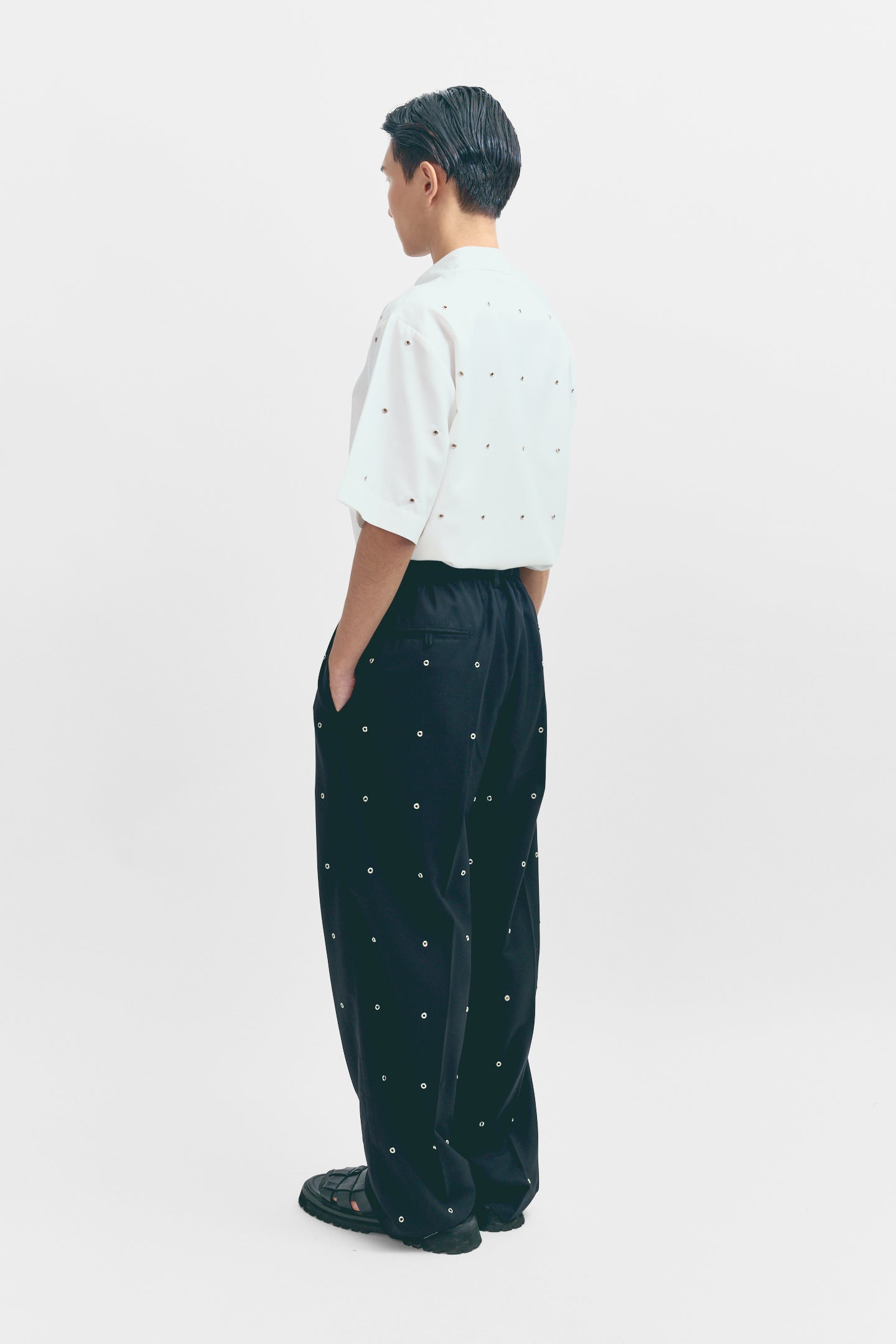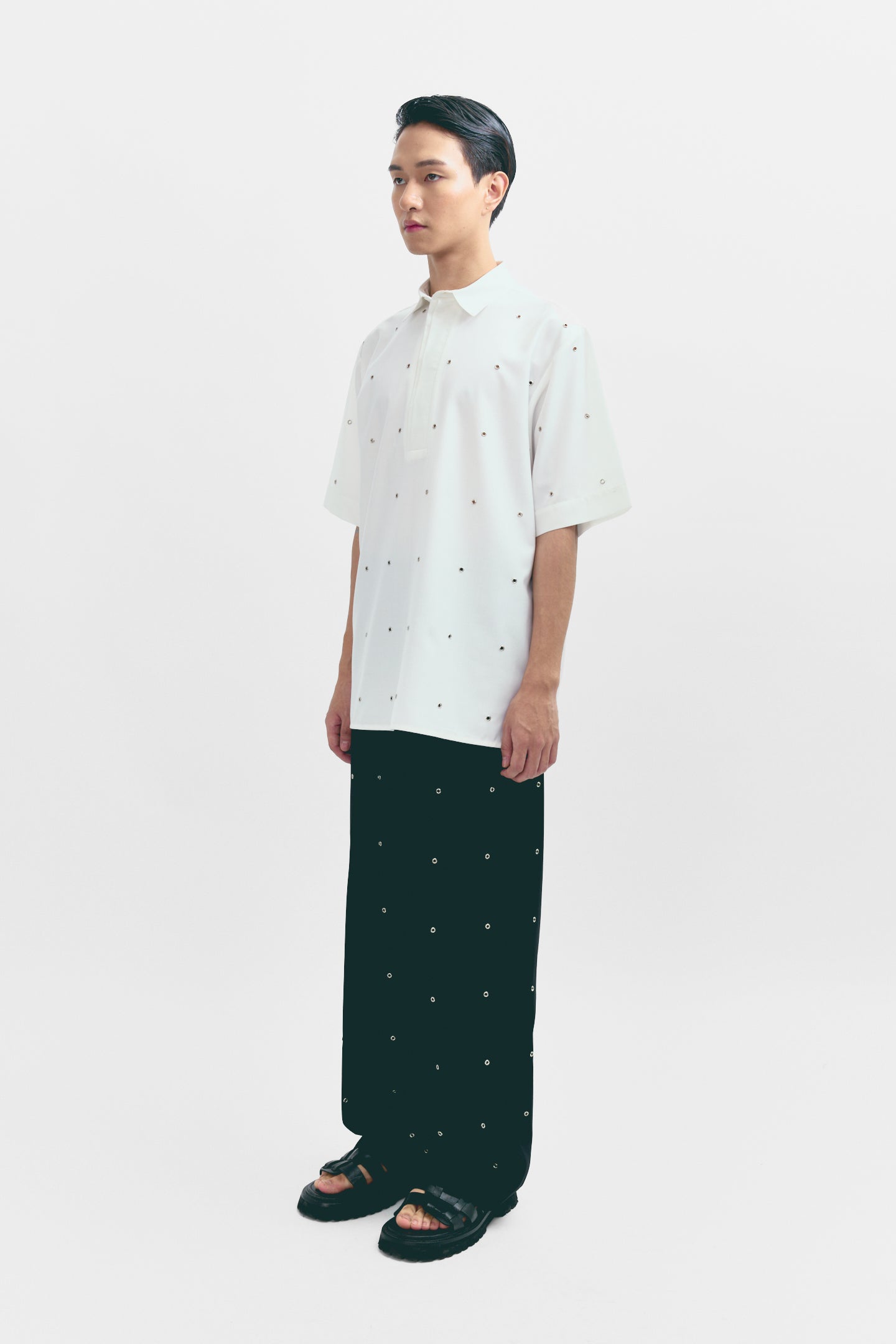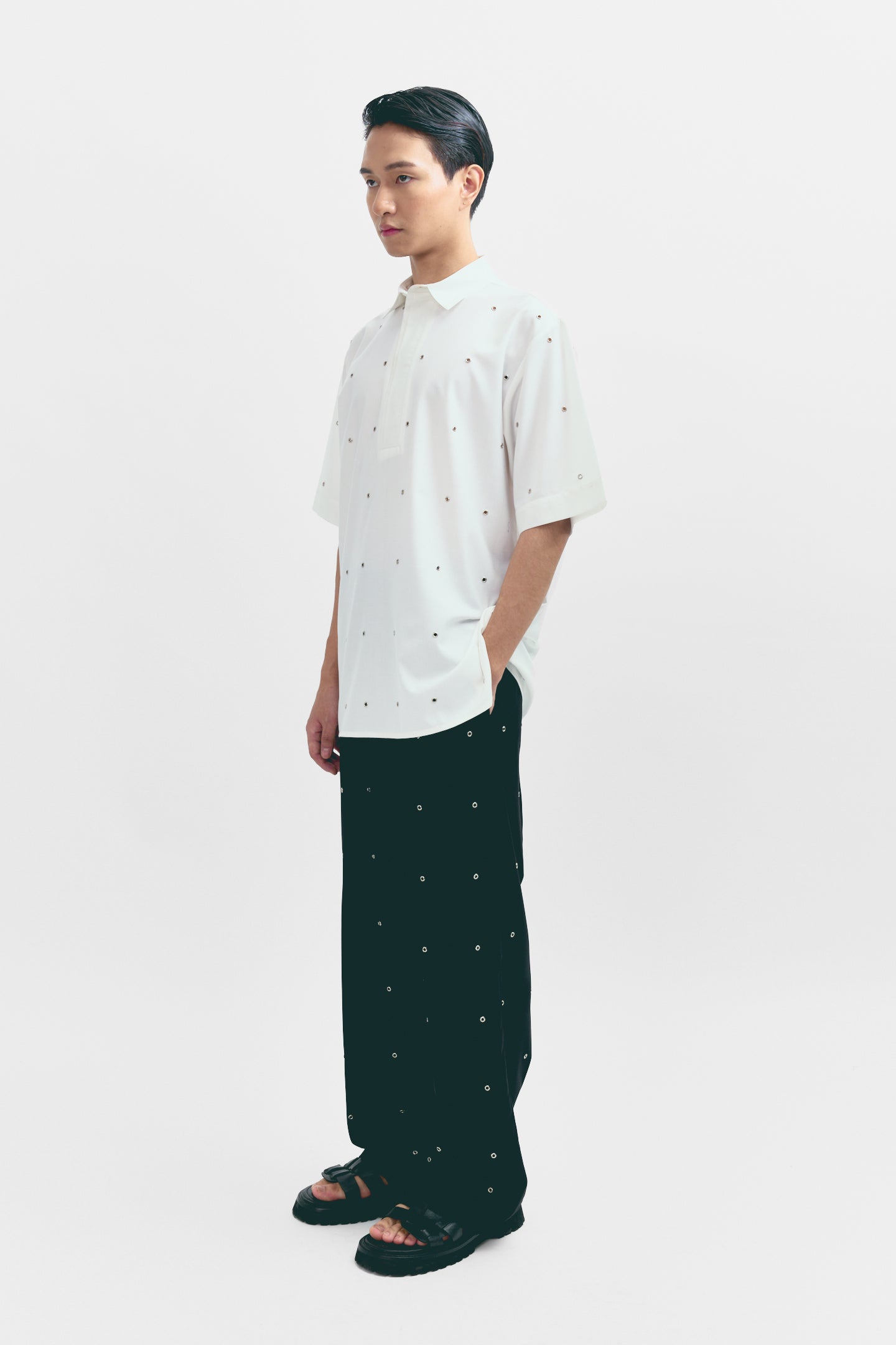 This half-sleeve polo shirt features subtle rivet detailing for a rugged, modern update to a timeless style. Made from soft, breathable fabric, it combines comfort with a touch of edge. A versatile piece that works for both casual and smart-casual looks.