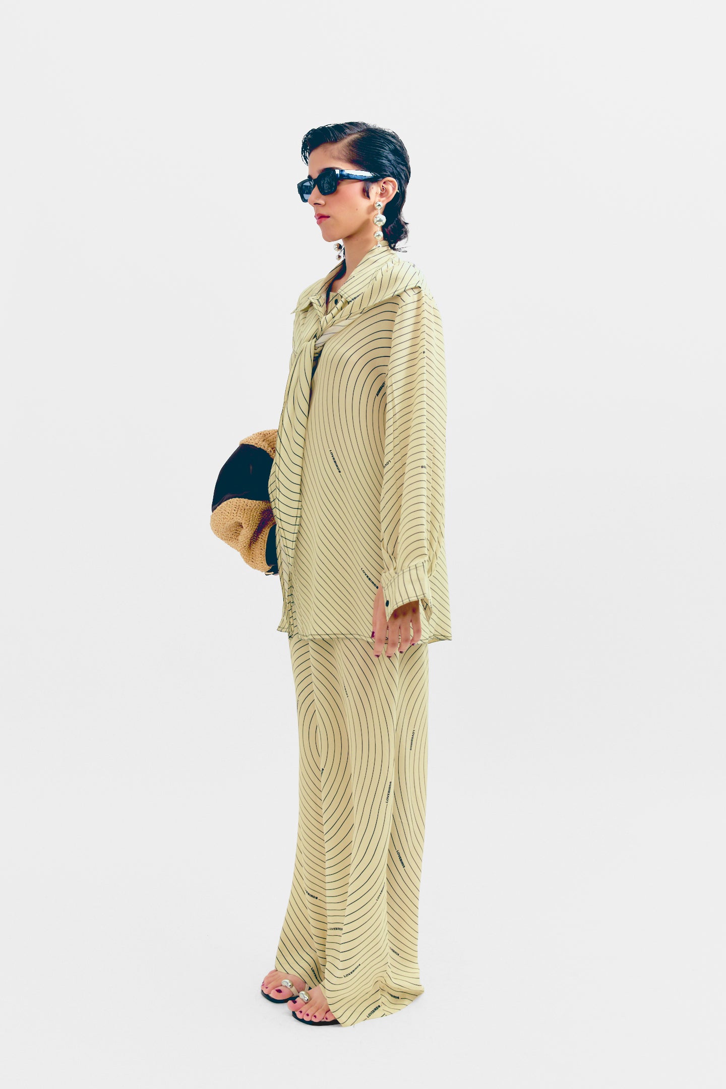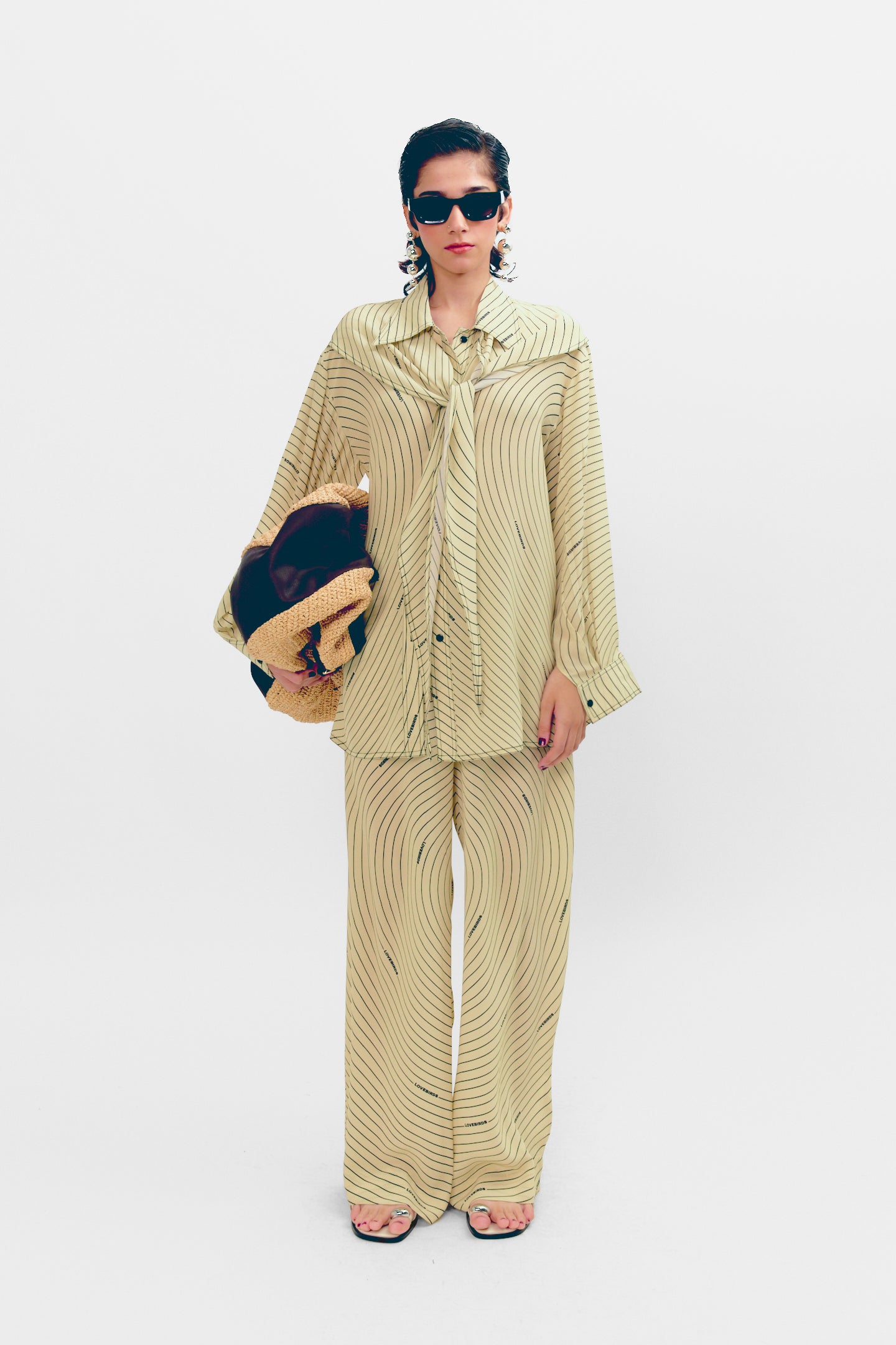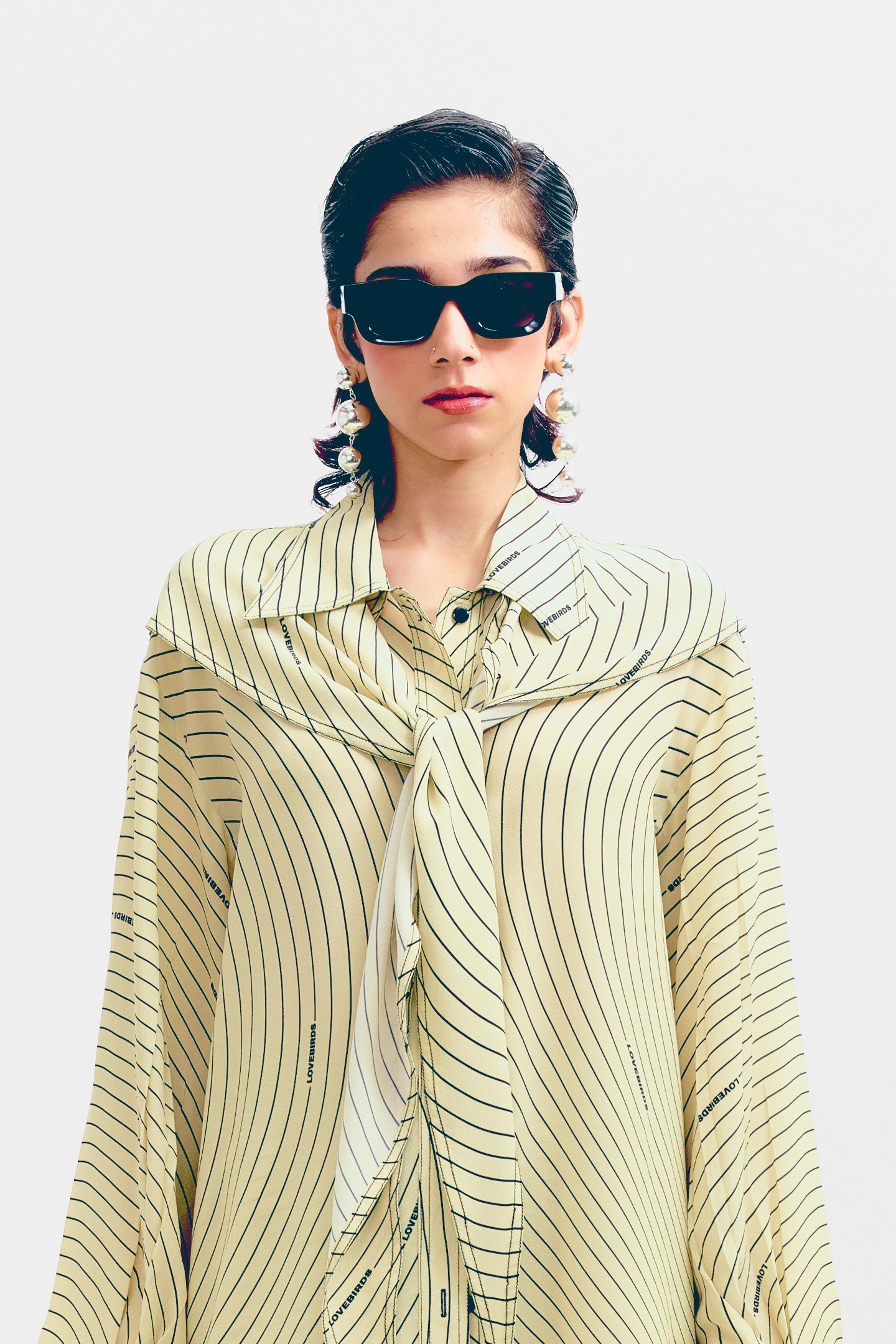 A unique twist on a classic shirt, this piece features an attached triangle scarf detail that adds effortless style and a layered look. Designed with a relaxed fit, it blends structure and softness—perfect for both casual and elevated outfits.