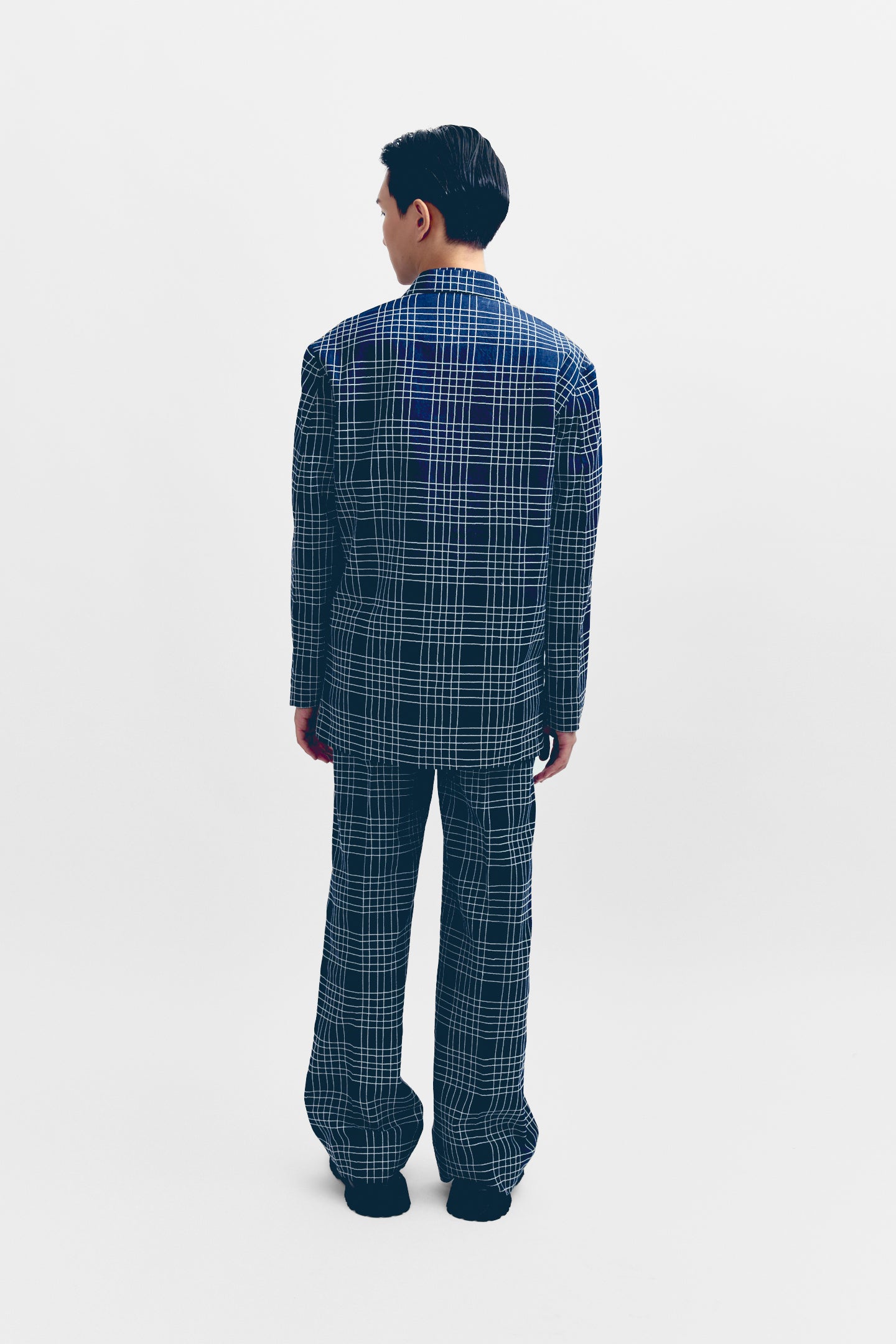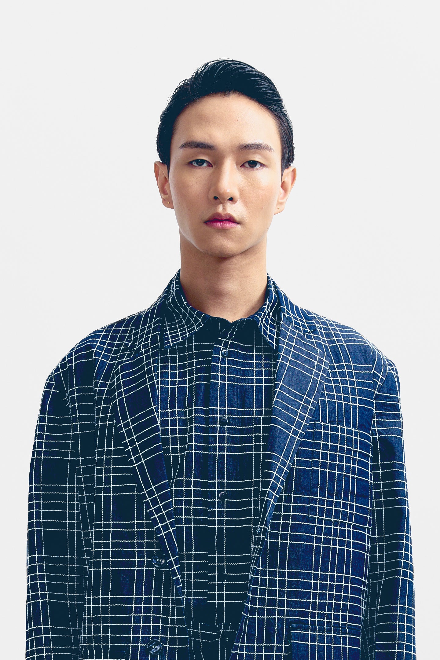 This relaxed-fit men's blazer features a modern twist with top-stitched checkered detailing throughout. Tailored for comfort with a slightly oversized silhouette, it offers a laid-back yet polished look. Perfect for smart-casual dressing, it pairs effortlessly with trousers or denim.
