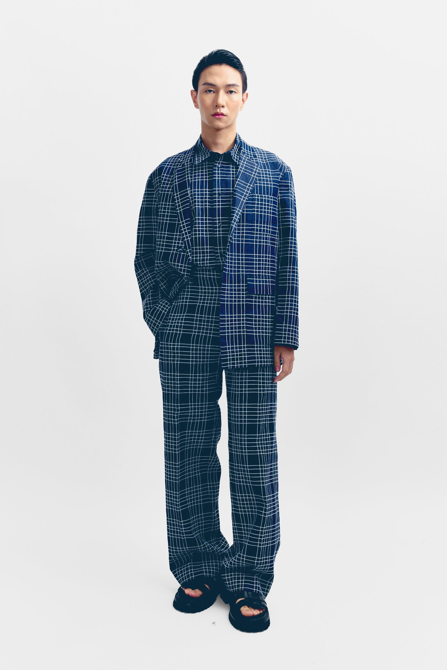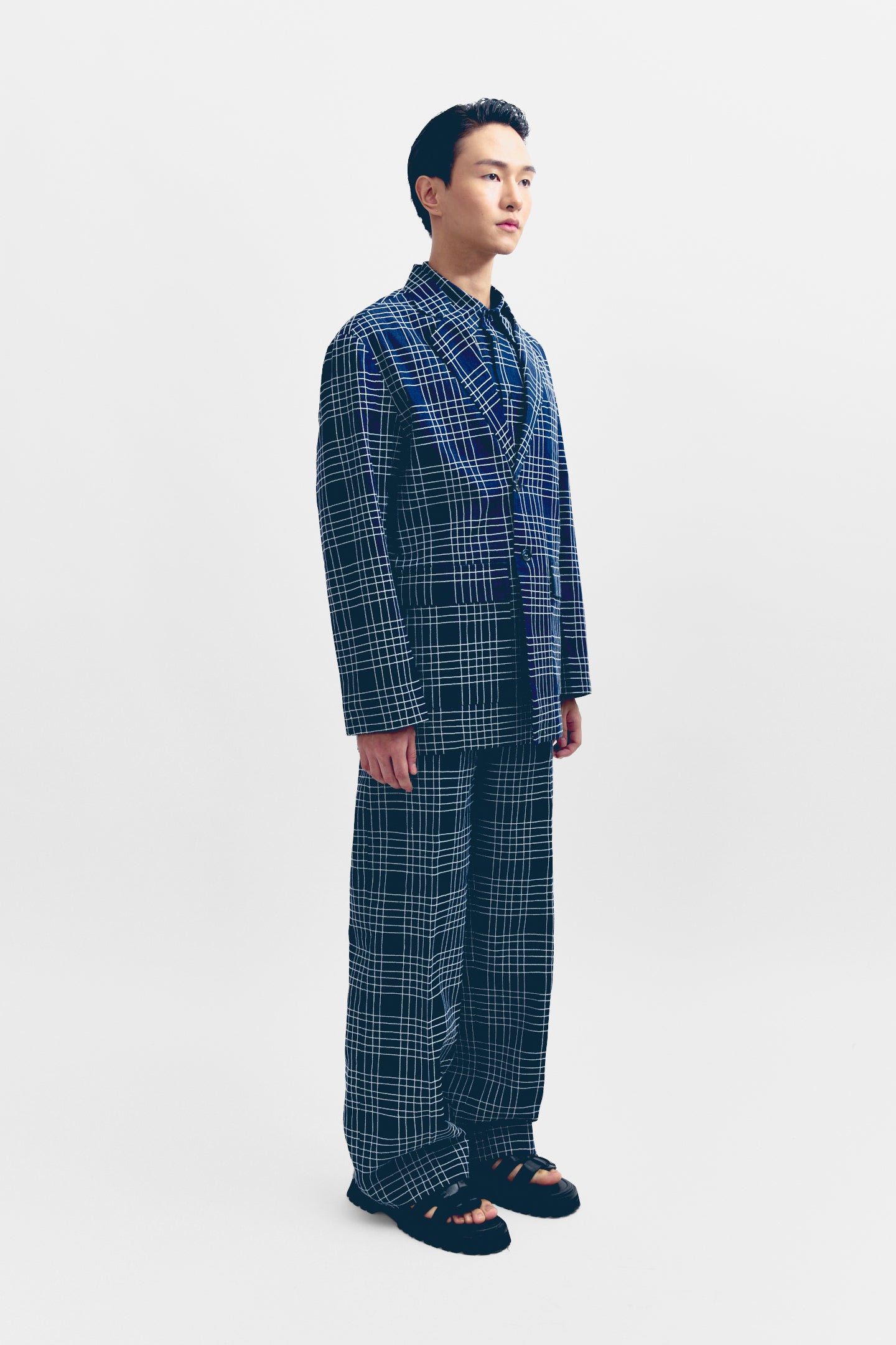 These waistless men's trousers feature a unique top-stitched checkered pattern for a bold, modern look. With a clean, structured silhouette and relaxed fit, they offer a fresh take on classic tailoring. Perfect for making a subtle statement while keeping things minimal and refined.