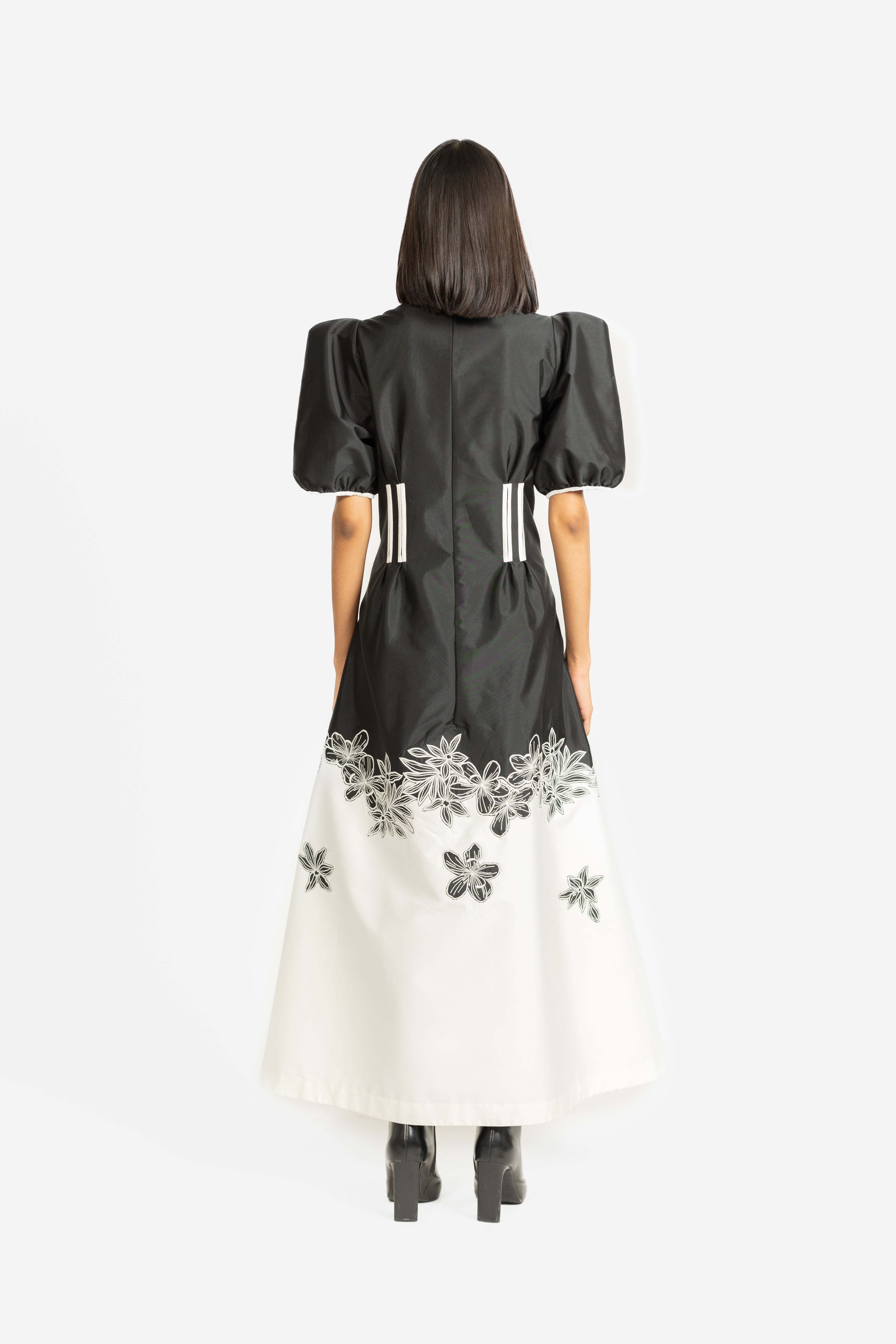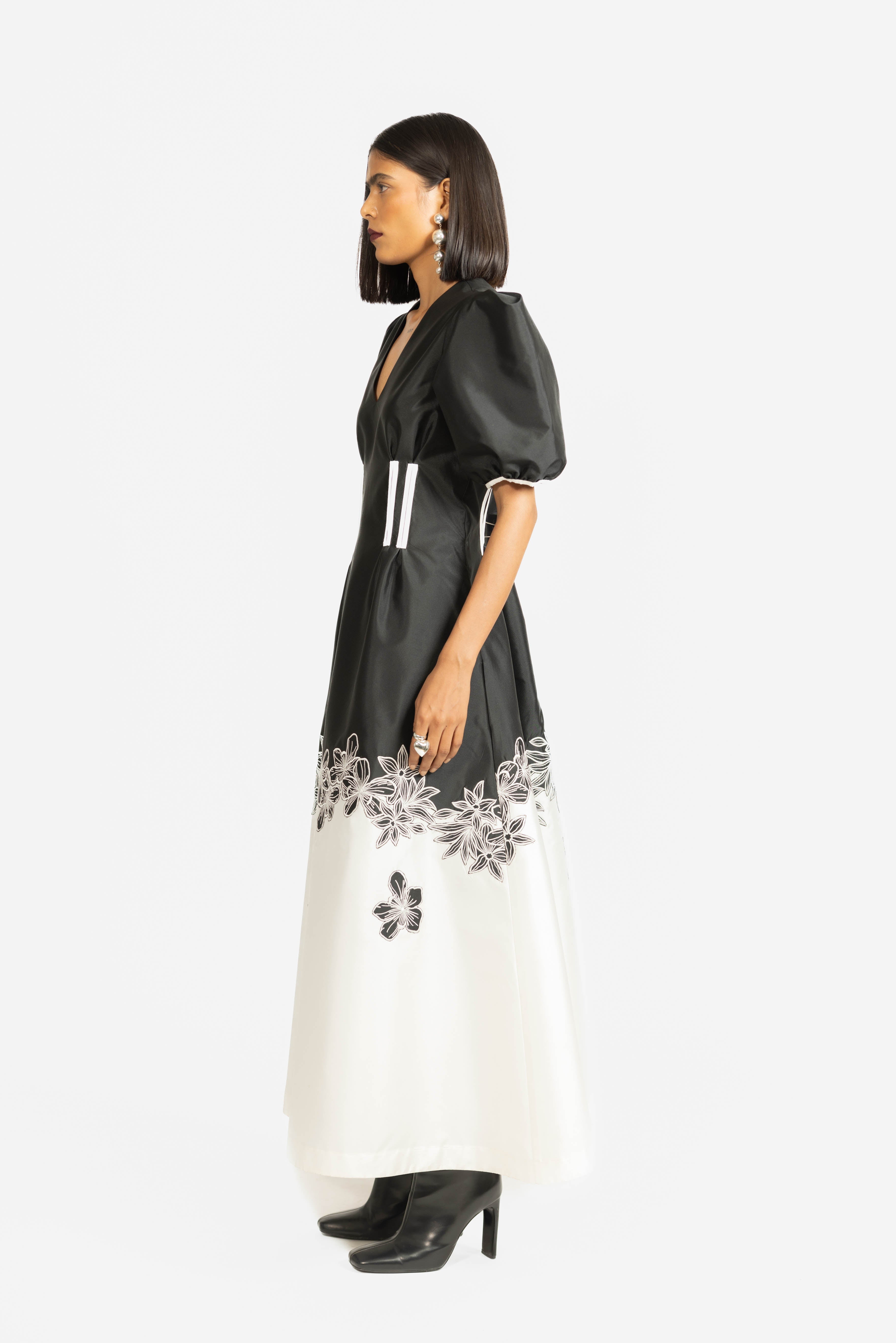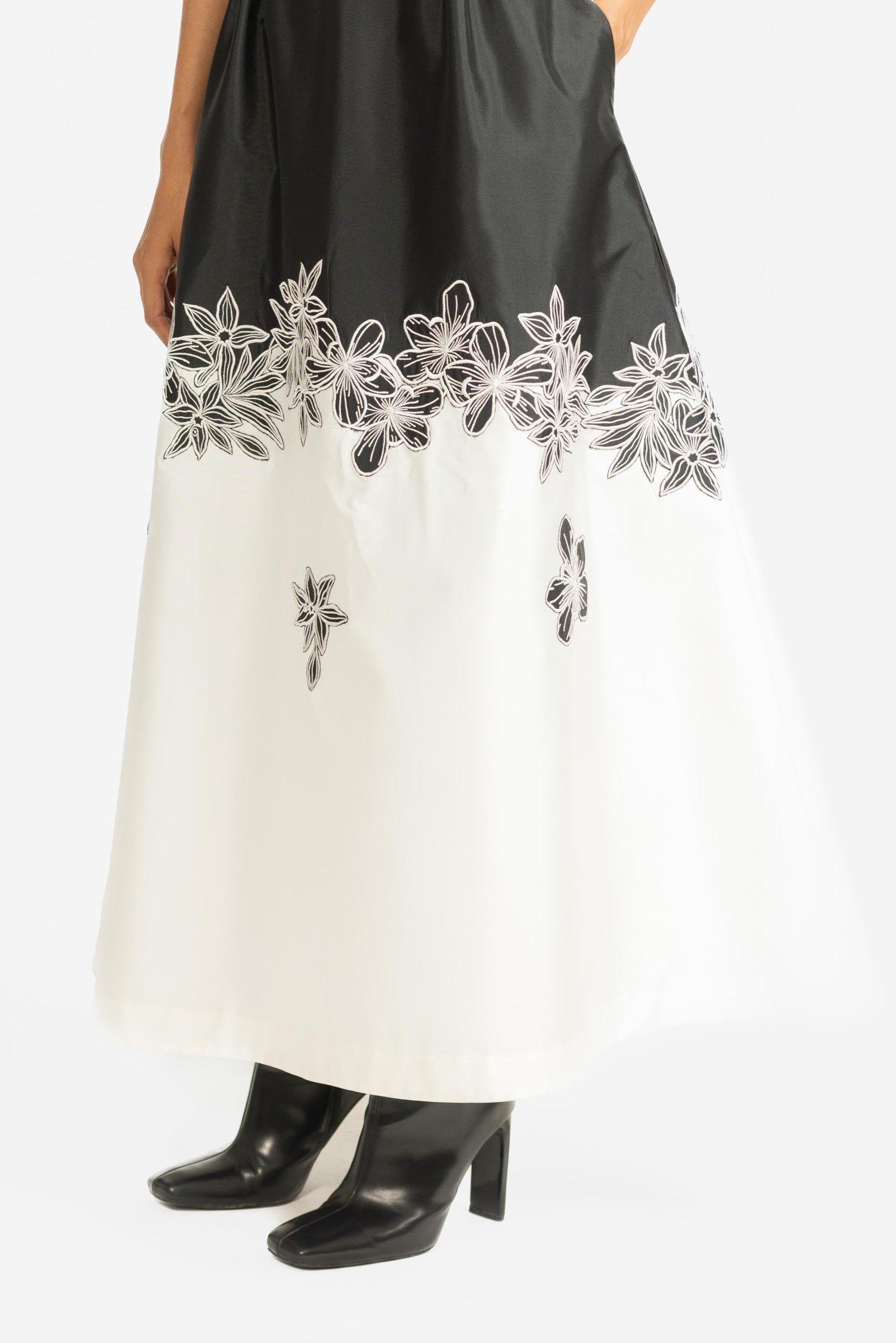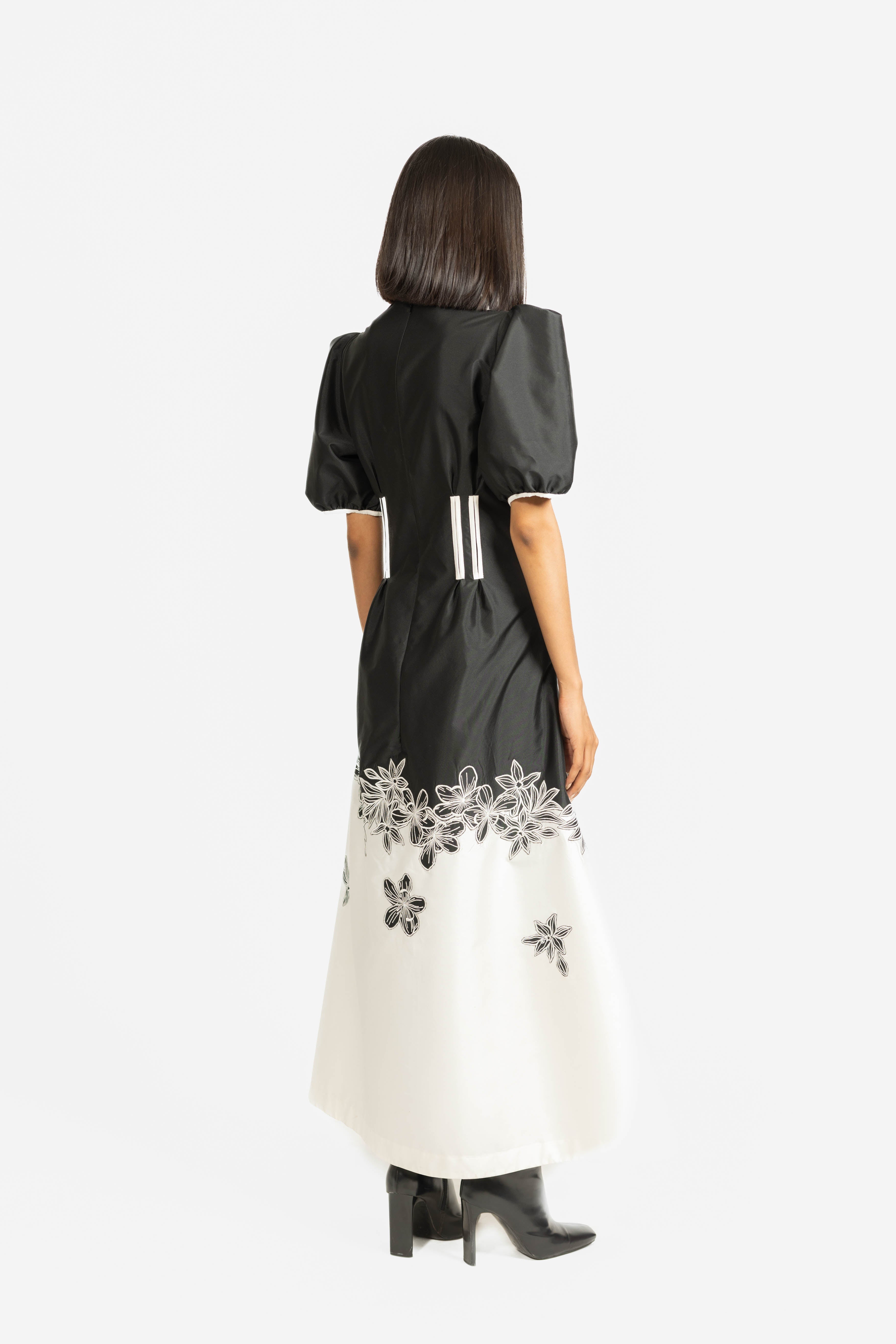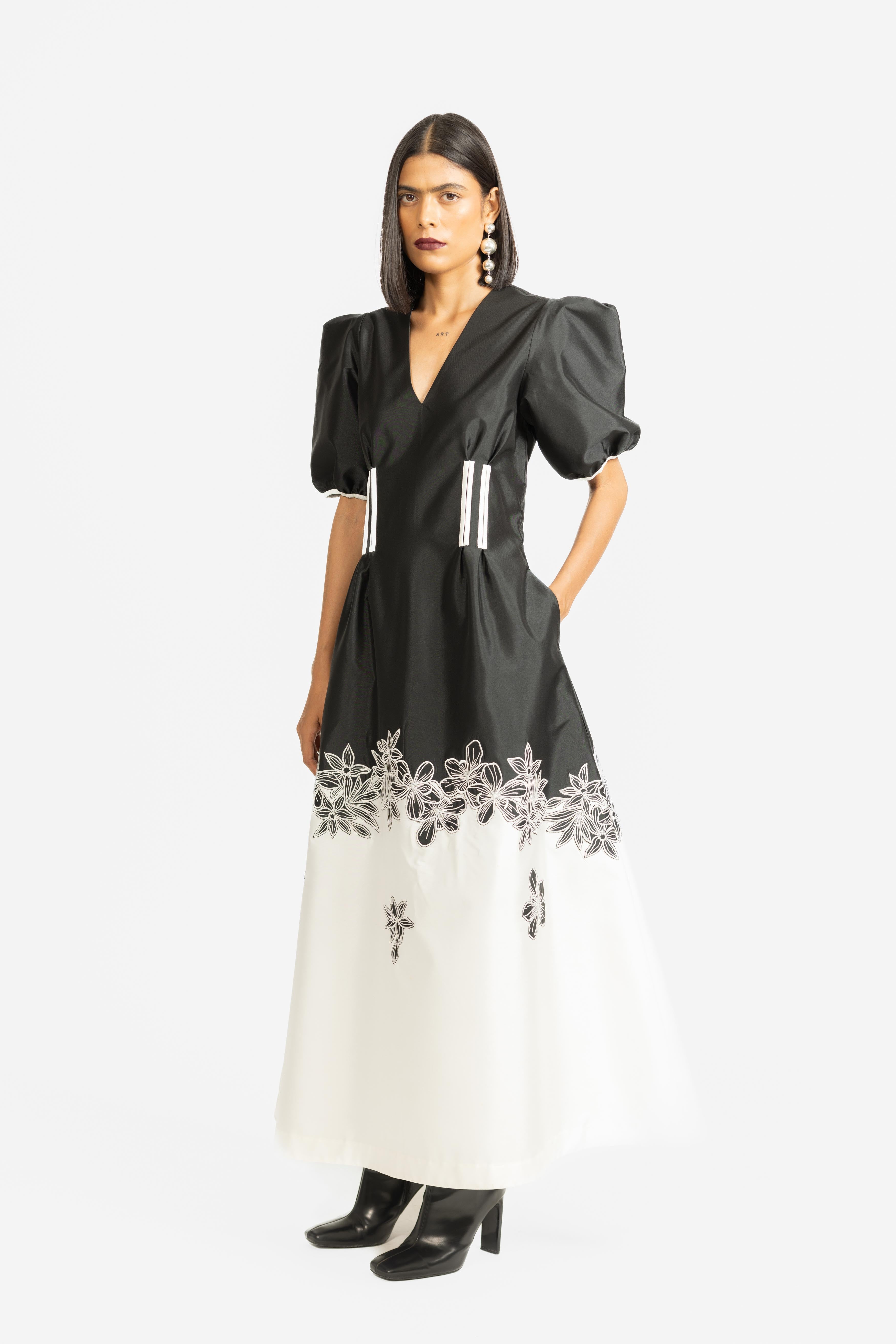 A striking fit-and-flare gown featuring contrast floral embroidery in classic black and white.