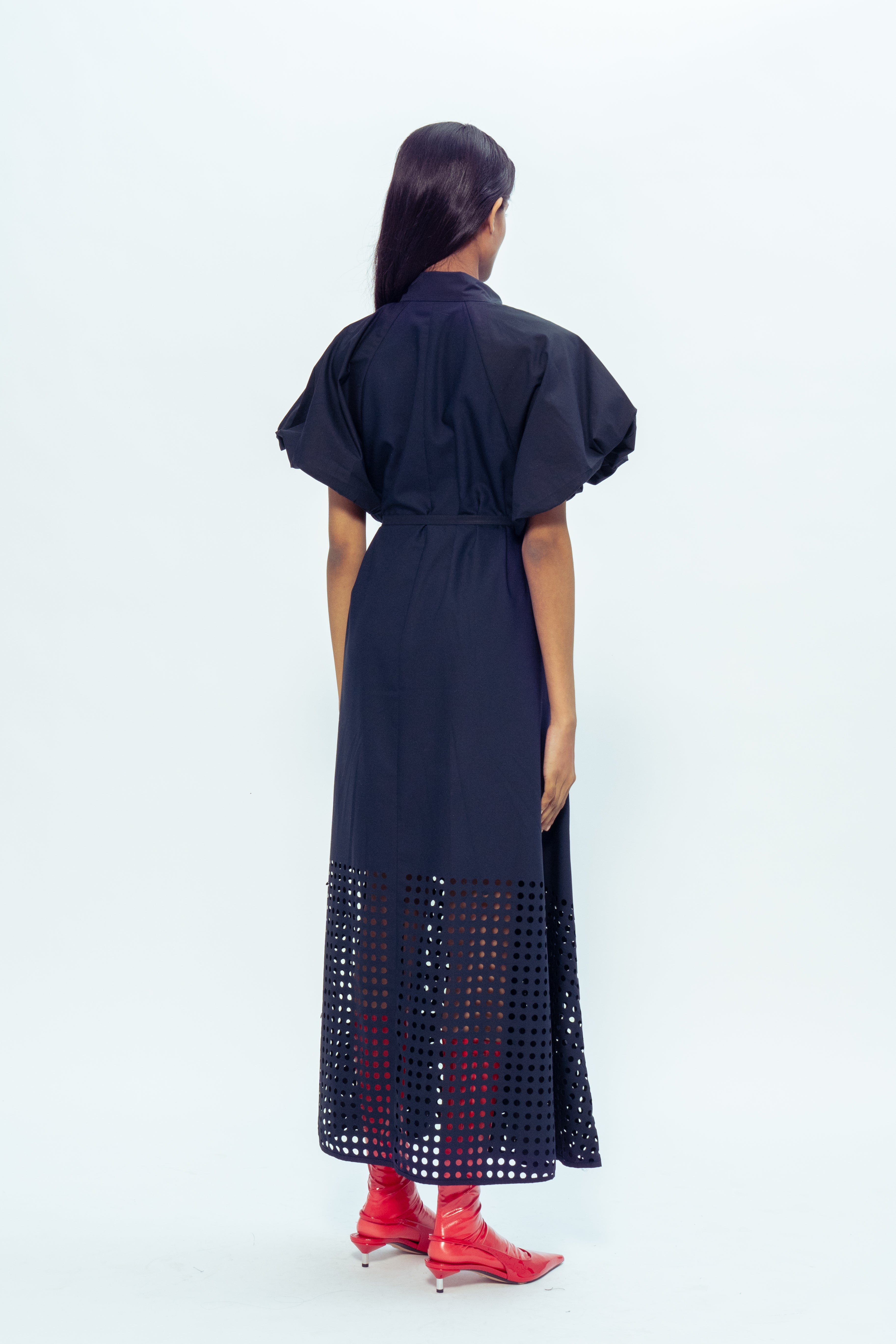 This stylish dress features puff sleeves and delicate laser-cut mesh detailing for a soft, feminine look. The included belt helps define the waist and adds a polished touch. Easy to dress up or down, it’s perfect for daytime outings or evening events.