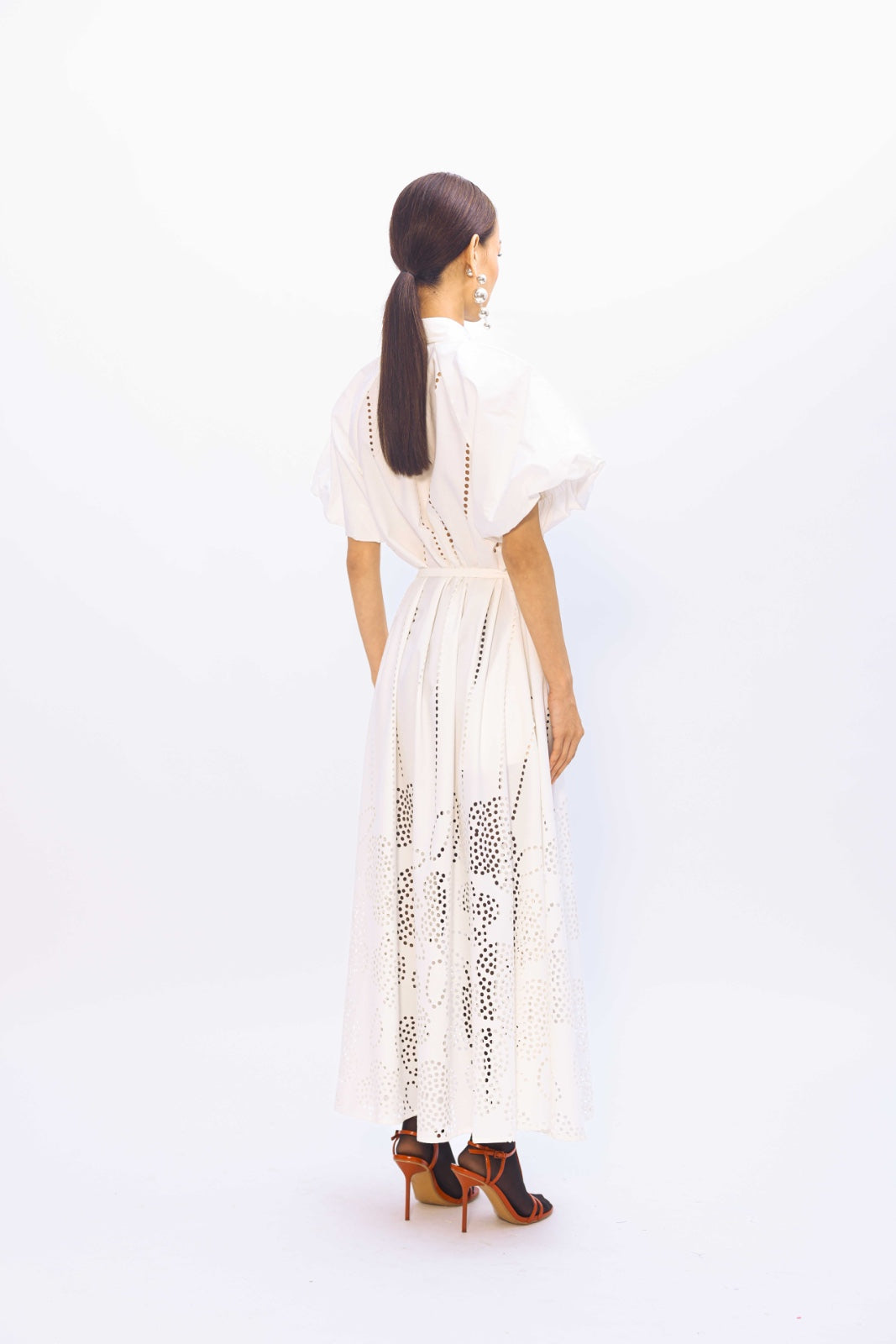 A puff-sleeve shirt dress in ivory, detailed with a laser-cut hem and finished with a self-tie belt to define the waist. Designed to balance structure and softness, it offers a polished yet effortlessly elegant silhouette.