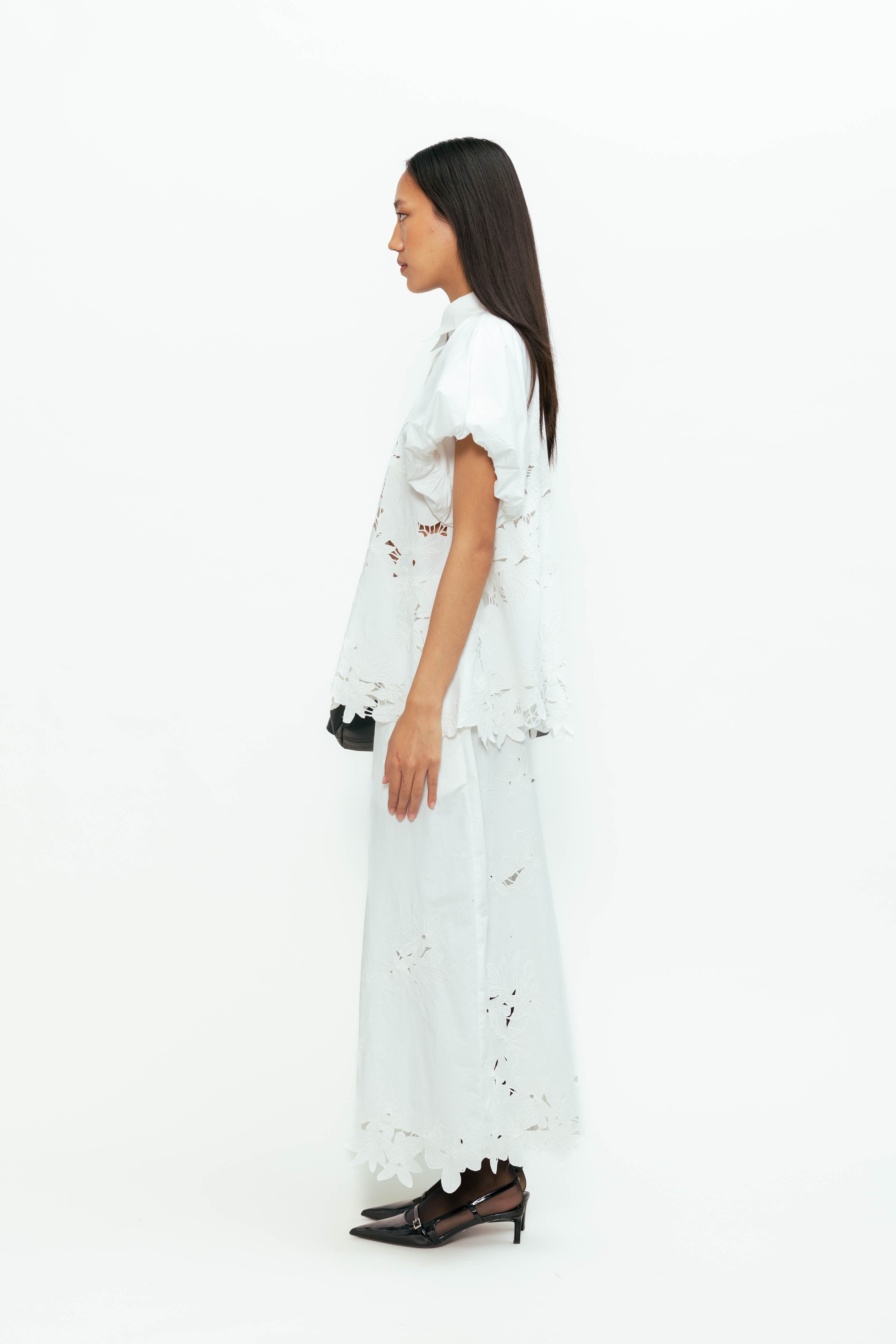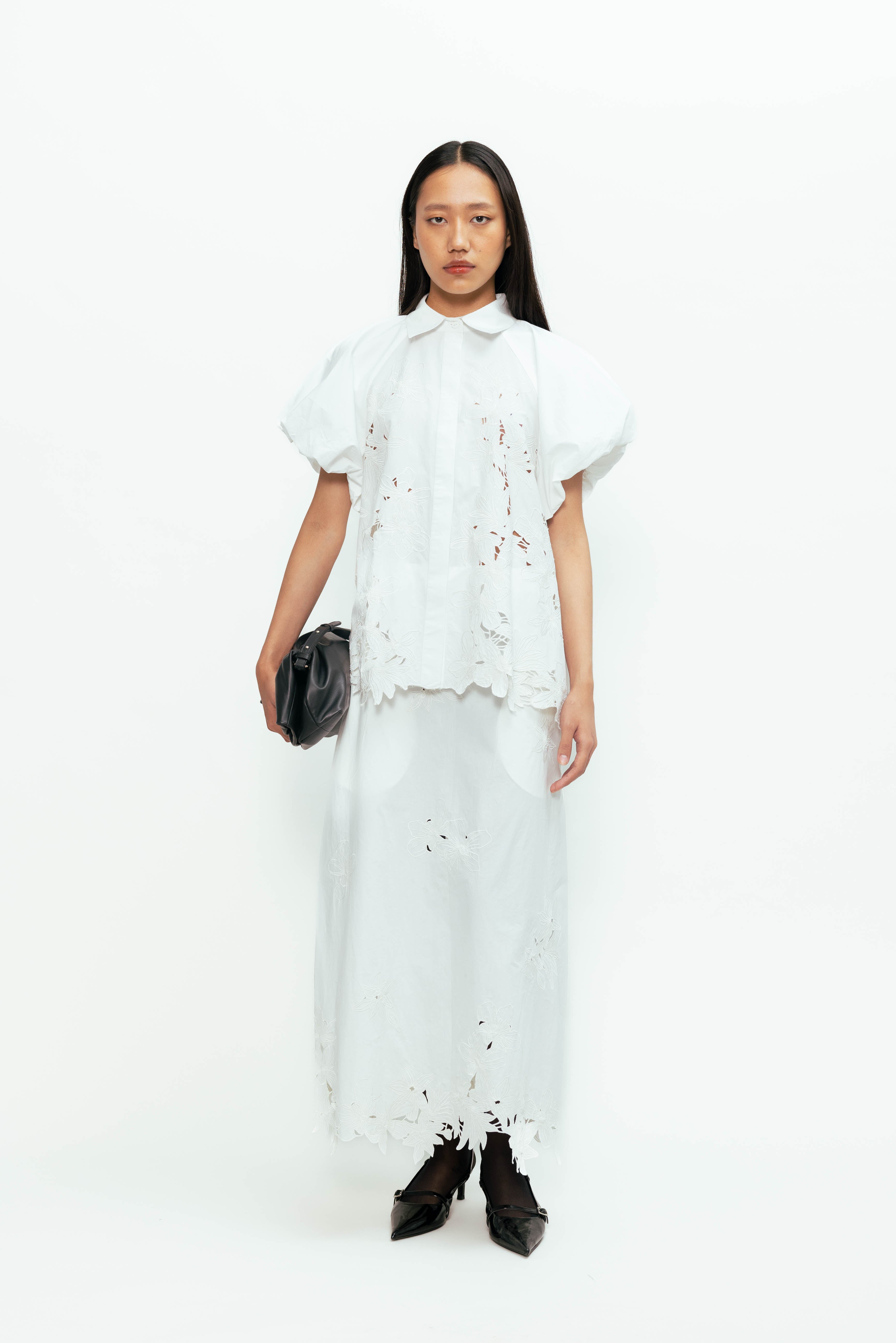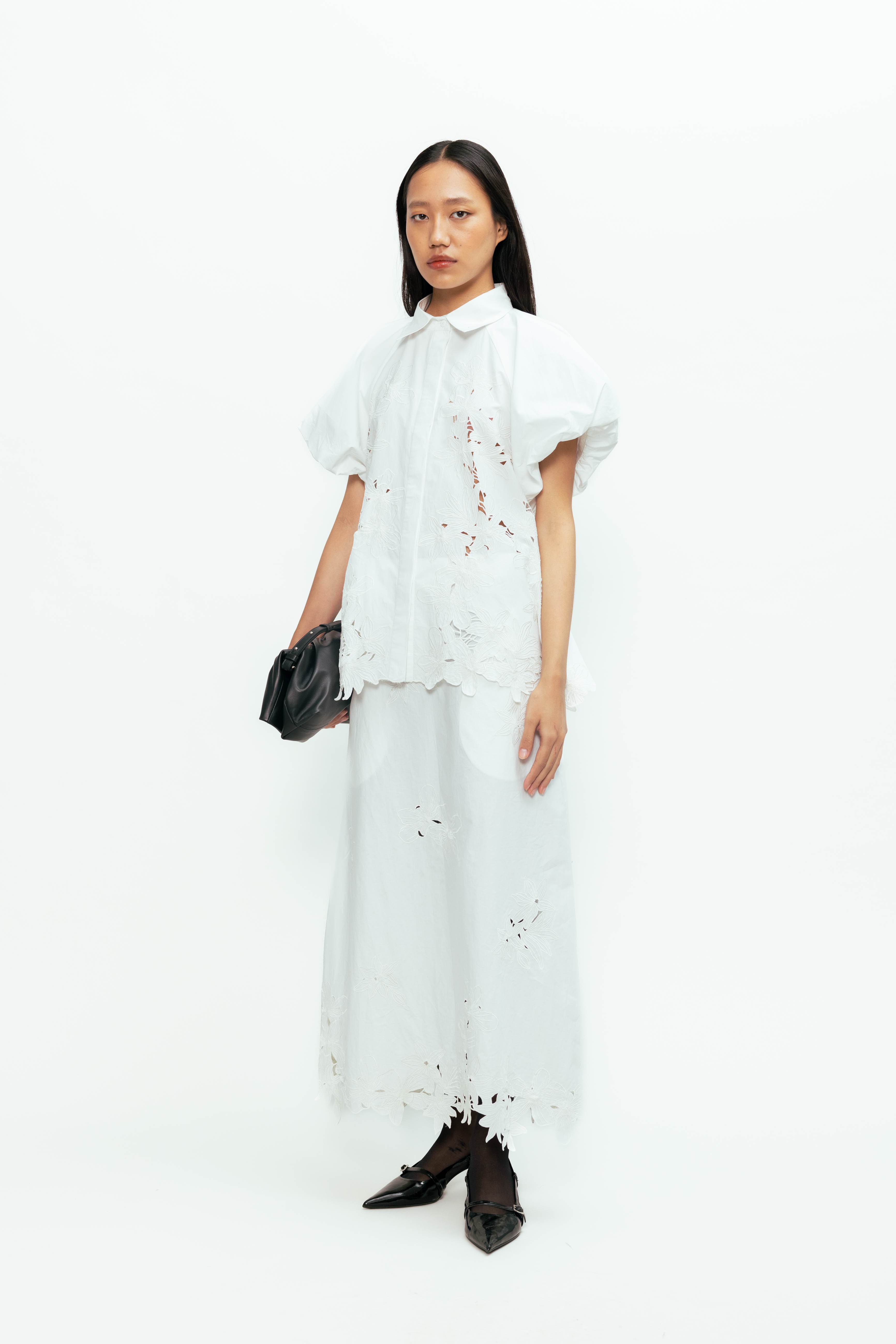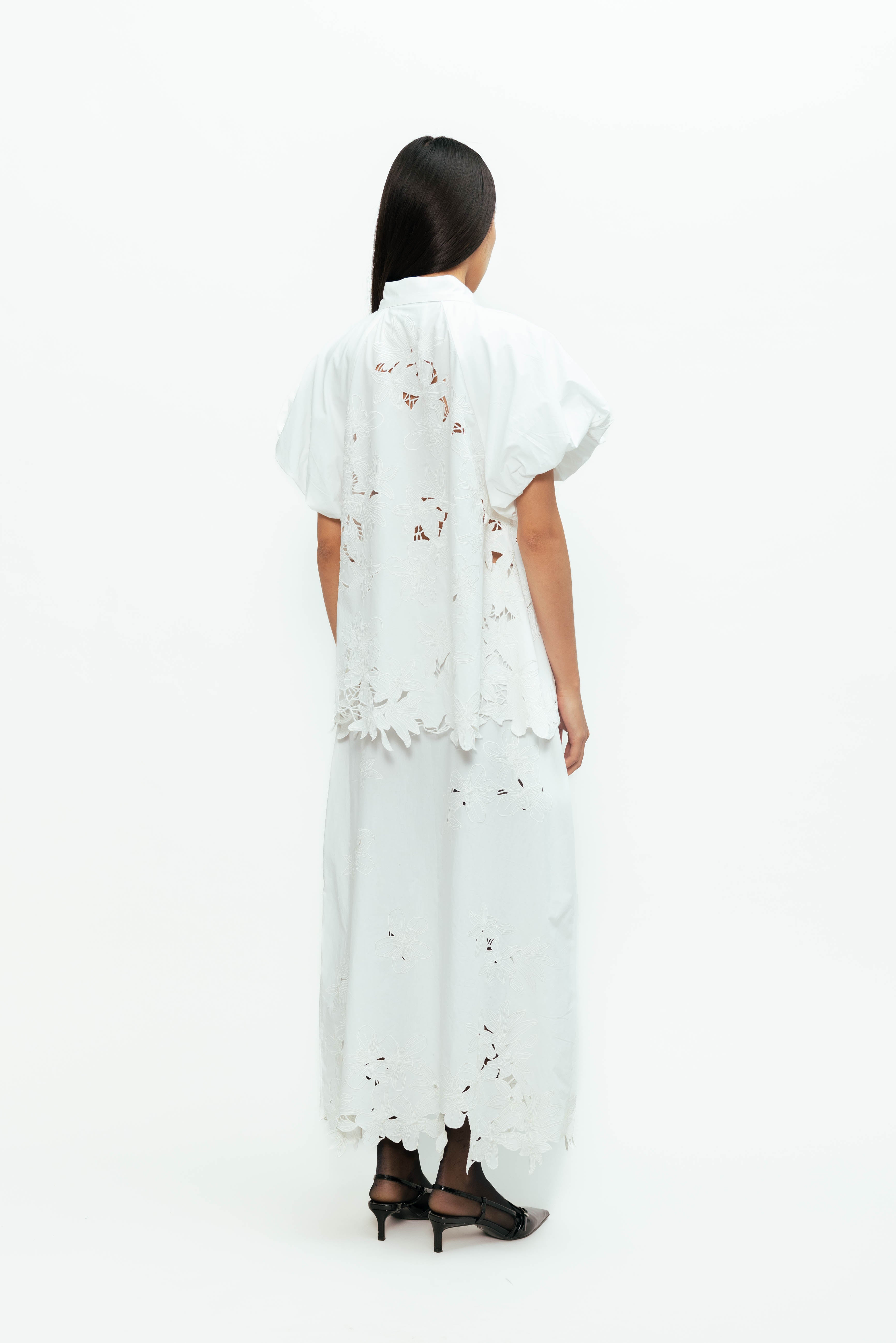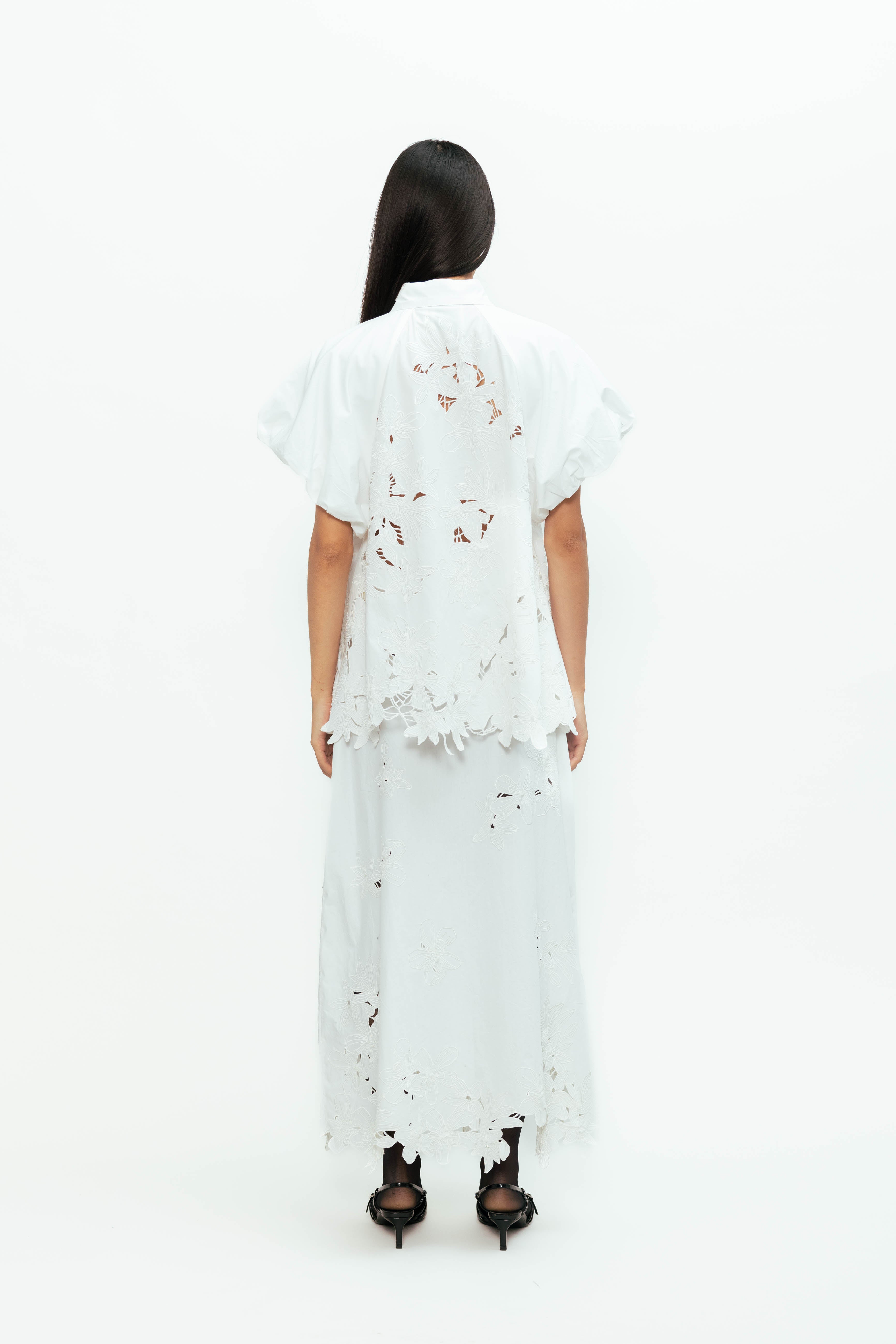 A clean silhouette becomes a canvas for intricate surface play. Cut with precision, this piece balances simplicity with fine detail—delicate cutwork traces floral forms across its structure, offering a quiet contrast between clarity and complexity. Its length brings an easy elegance, while the graphic yet soft detailing invites a closer look. Light, structured, and thoughtfully constructed, it holds space with subtle strength.
