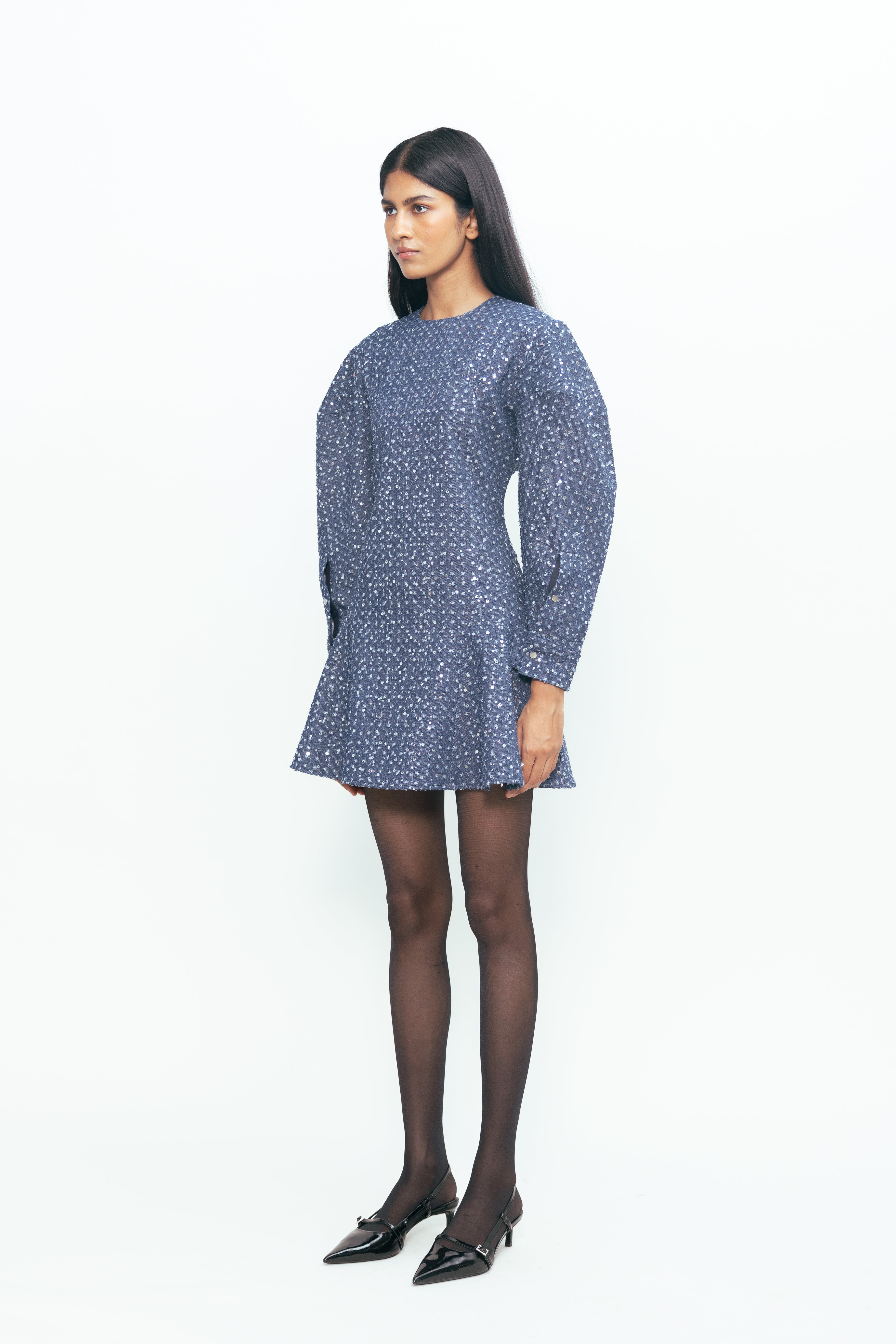A clean A-line silhouette meets a touch of shimmer in this modern mini. Sequins are lightly scattered across the surface, adding just enough shine to elevate the look without losing its easy feel. The grey-blue tone keeps it grounded, while the shape offers comfort and movement. Simple, playful, and polished — all at once.