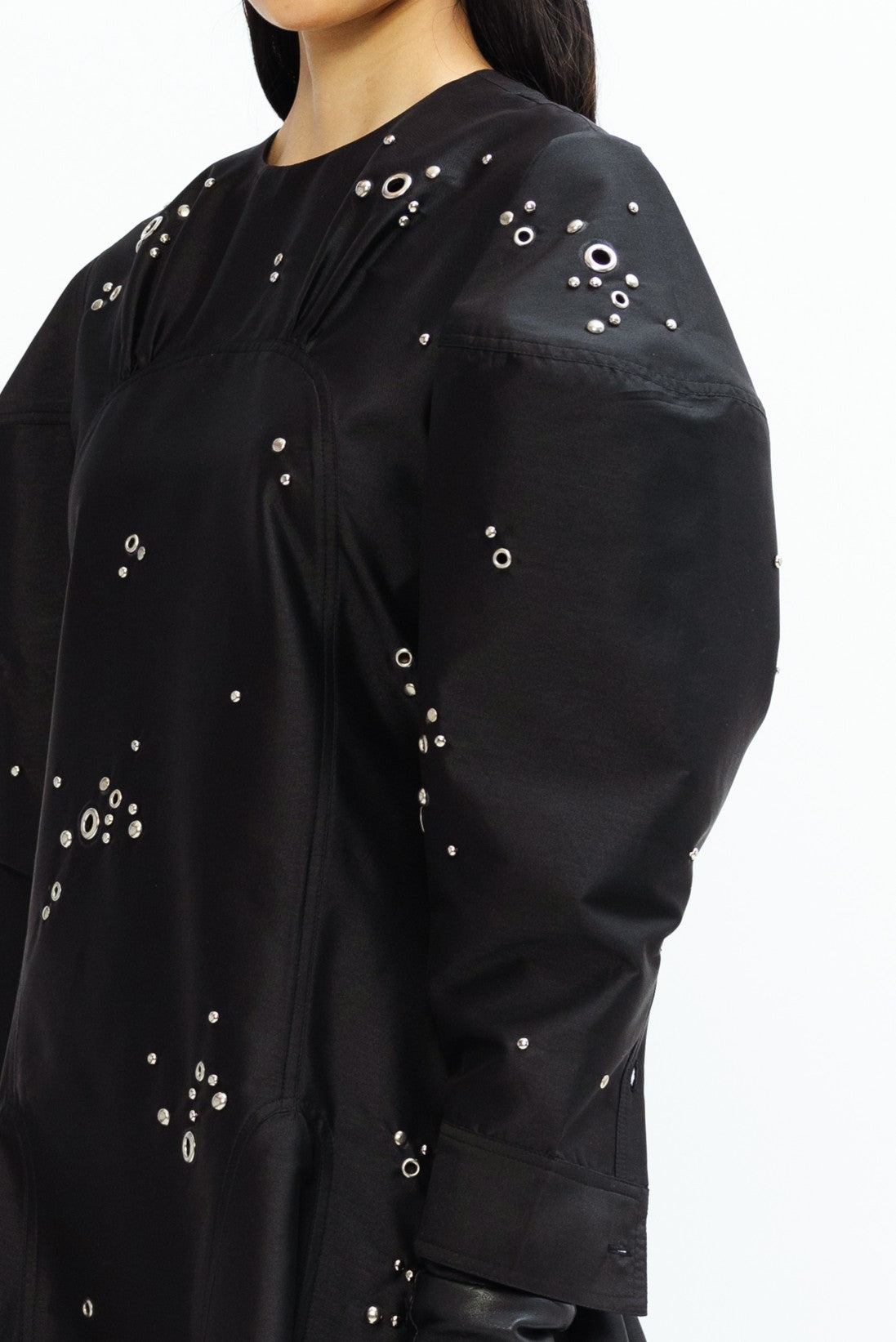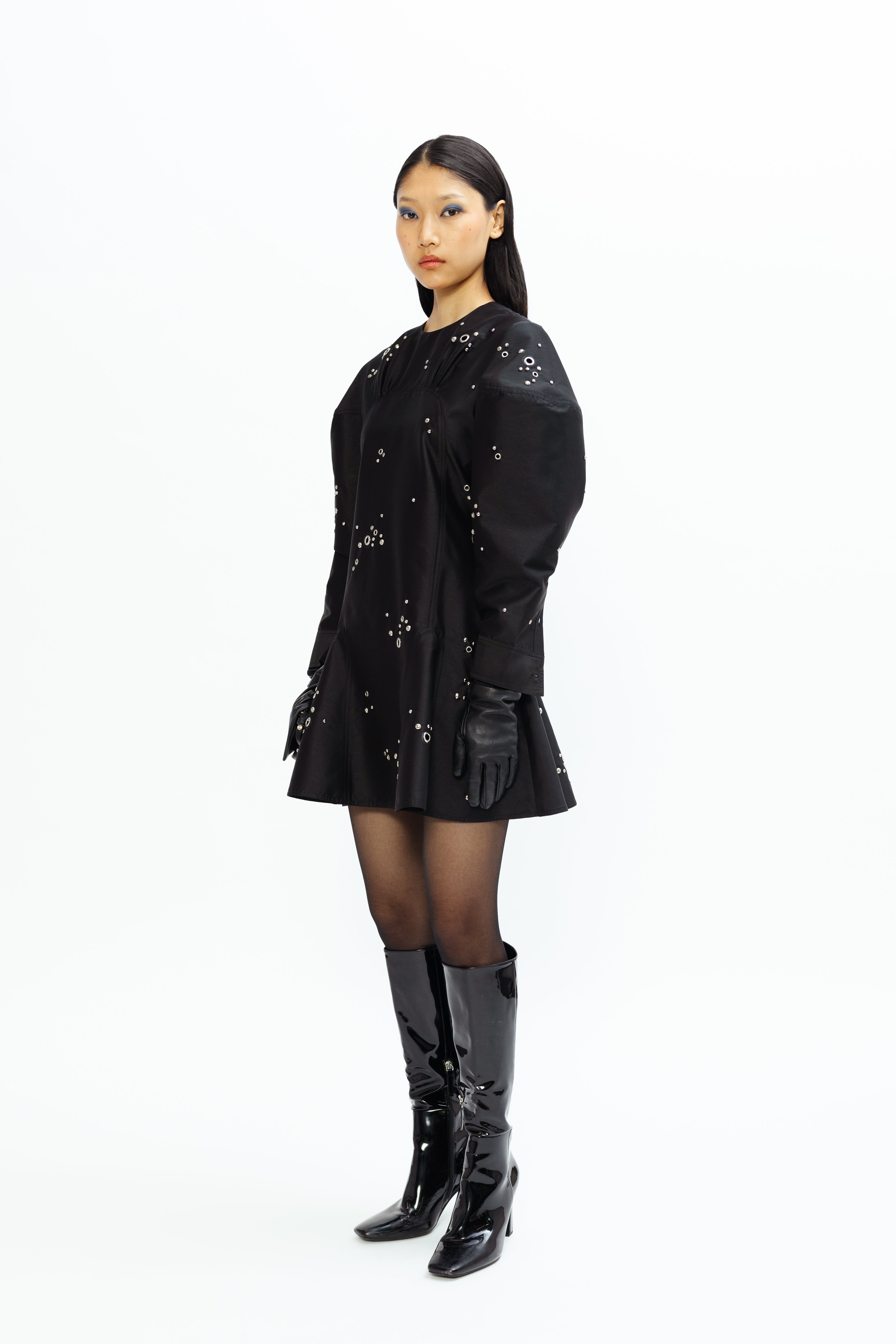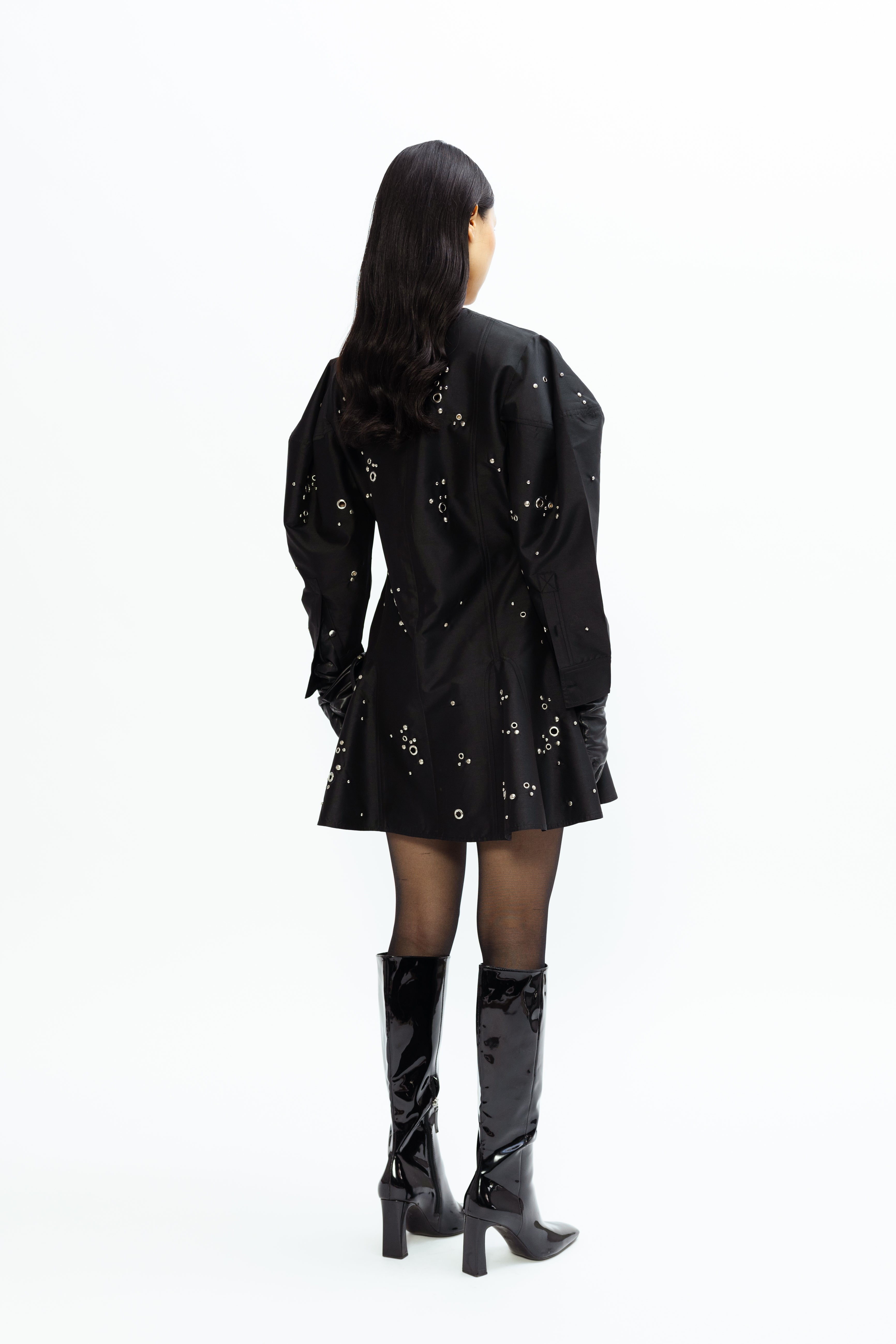 This short, structured A-line dress exudes a modern, edgy appeal with its clean lines and confident silhouette. Adorned with scattered metallic eyelets, it introduces a bold, industrial touch. The fusion of sharp structure and striking embellishments gives the dress a distinctly futuristic and avant-garde vibe.