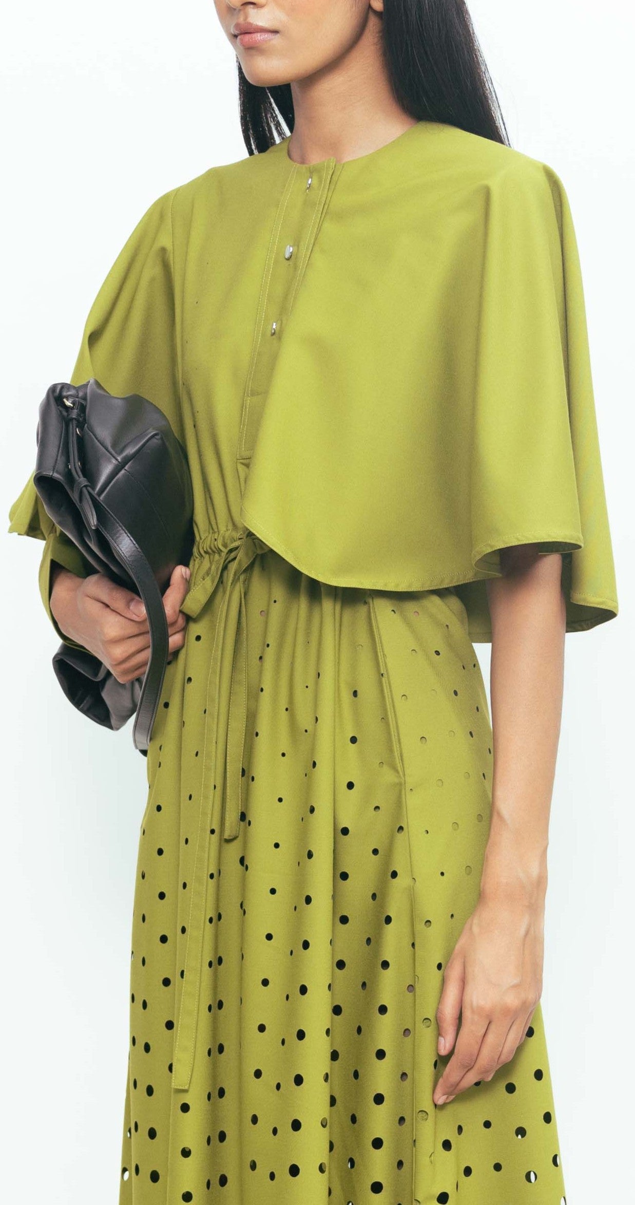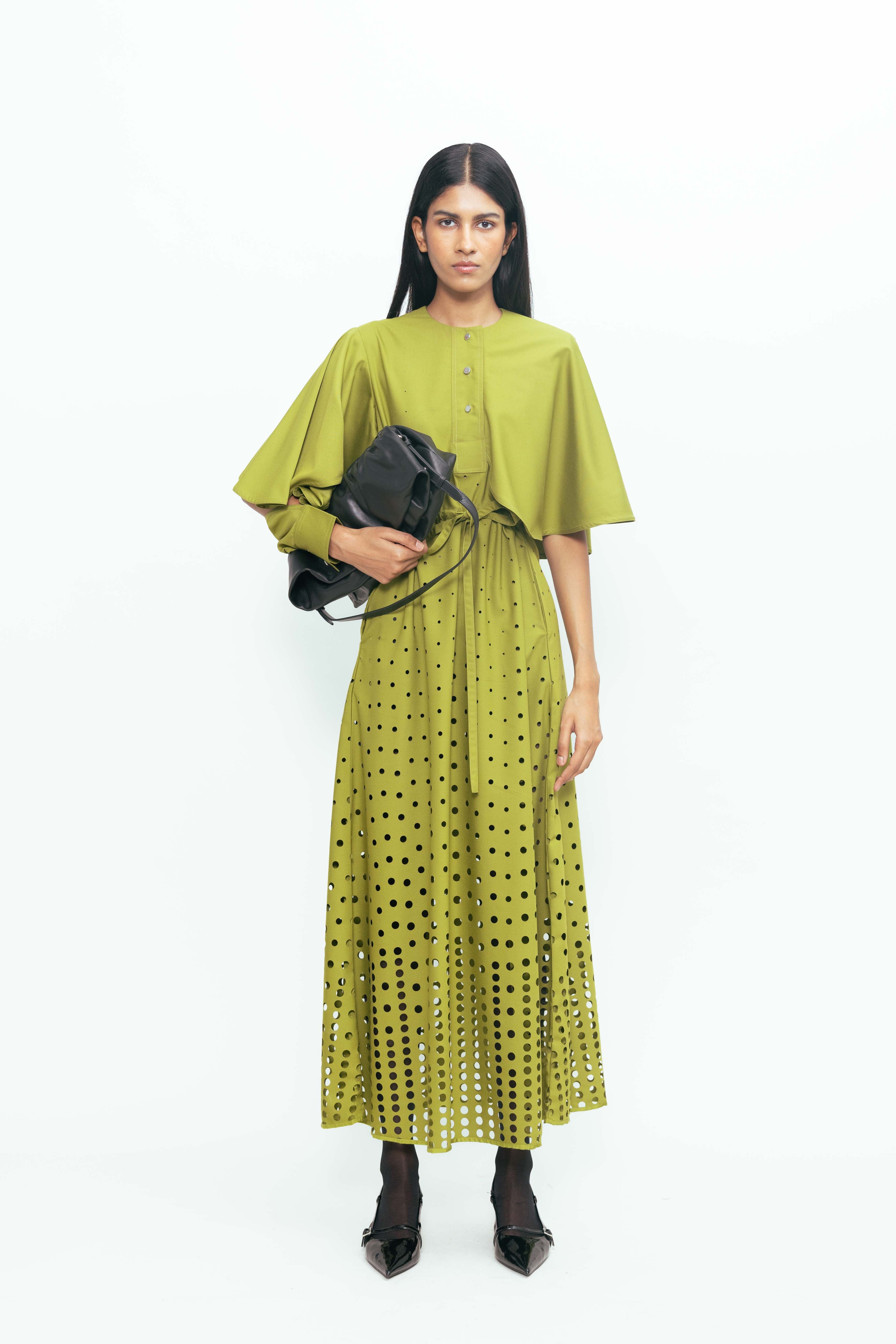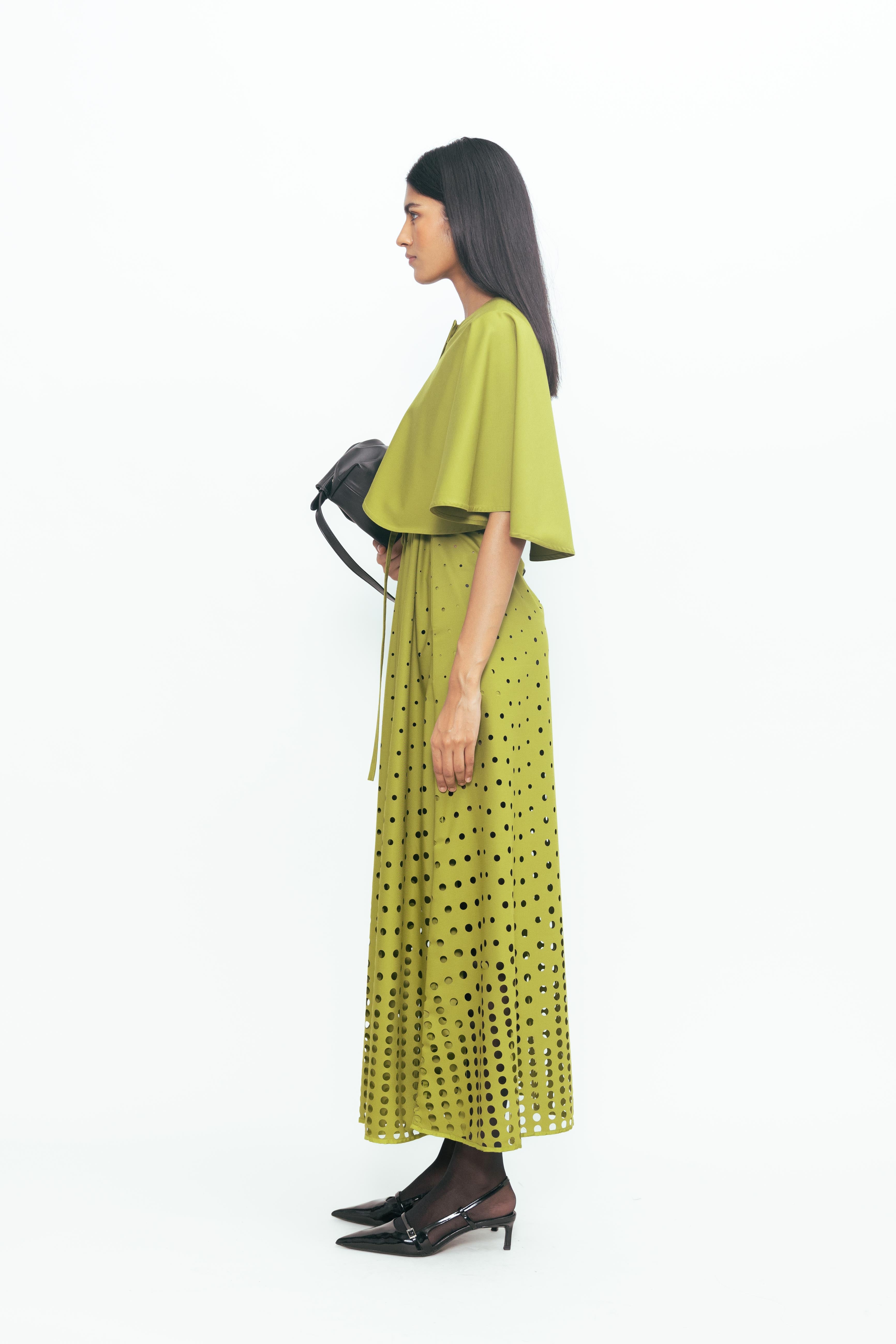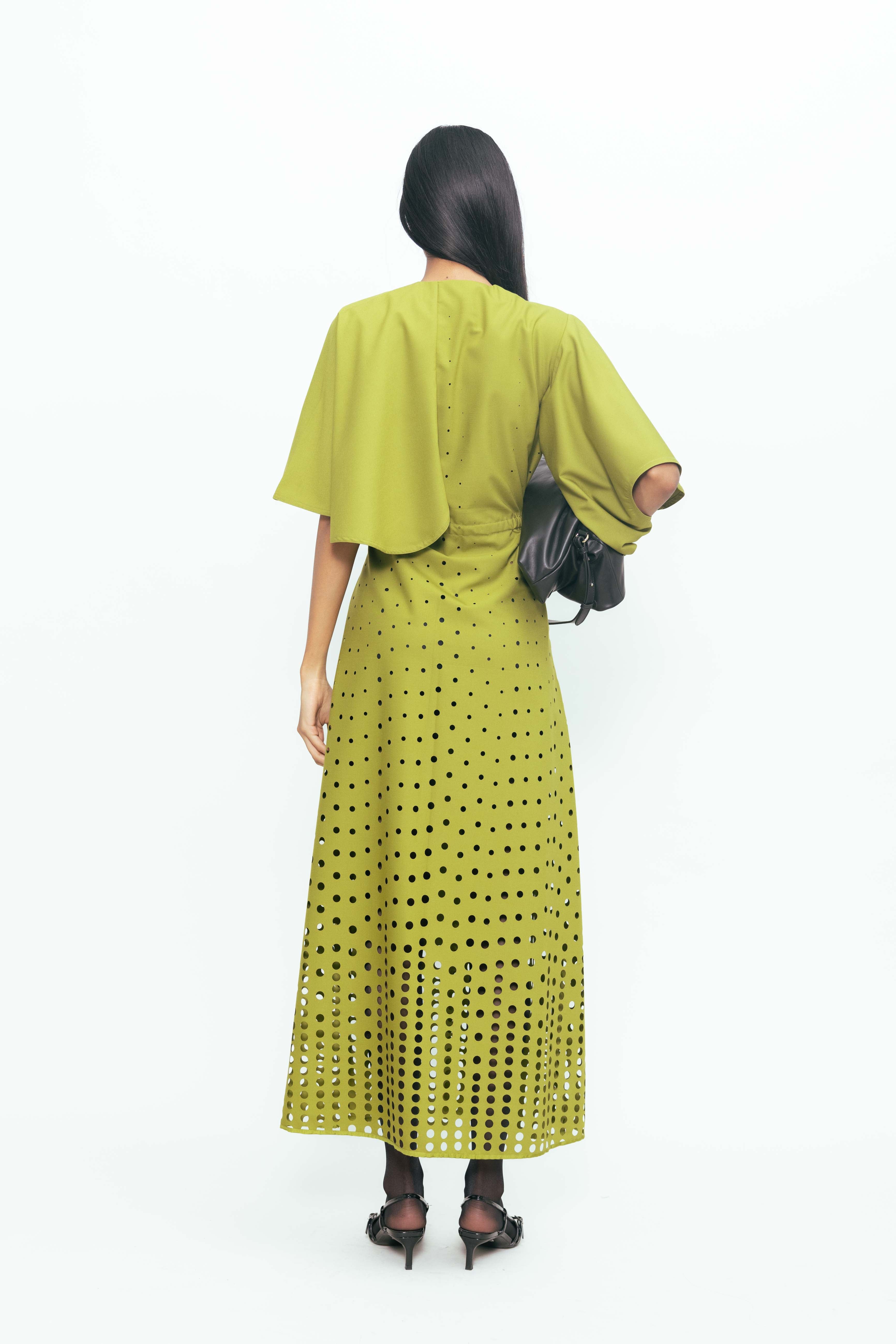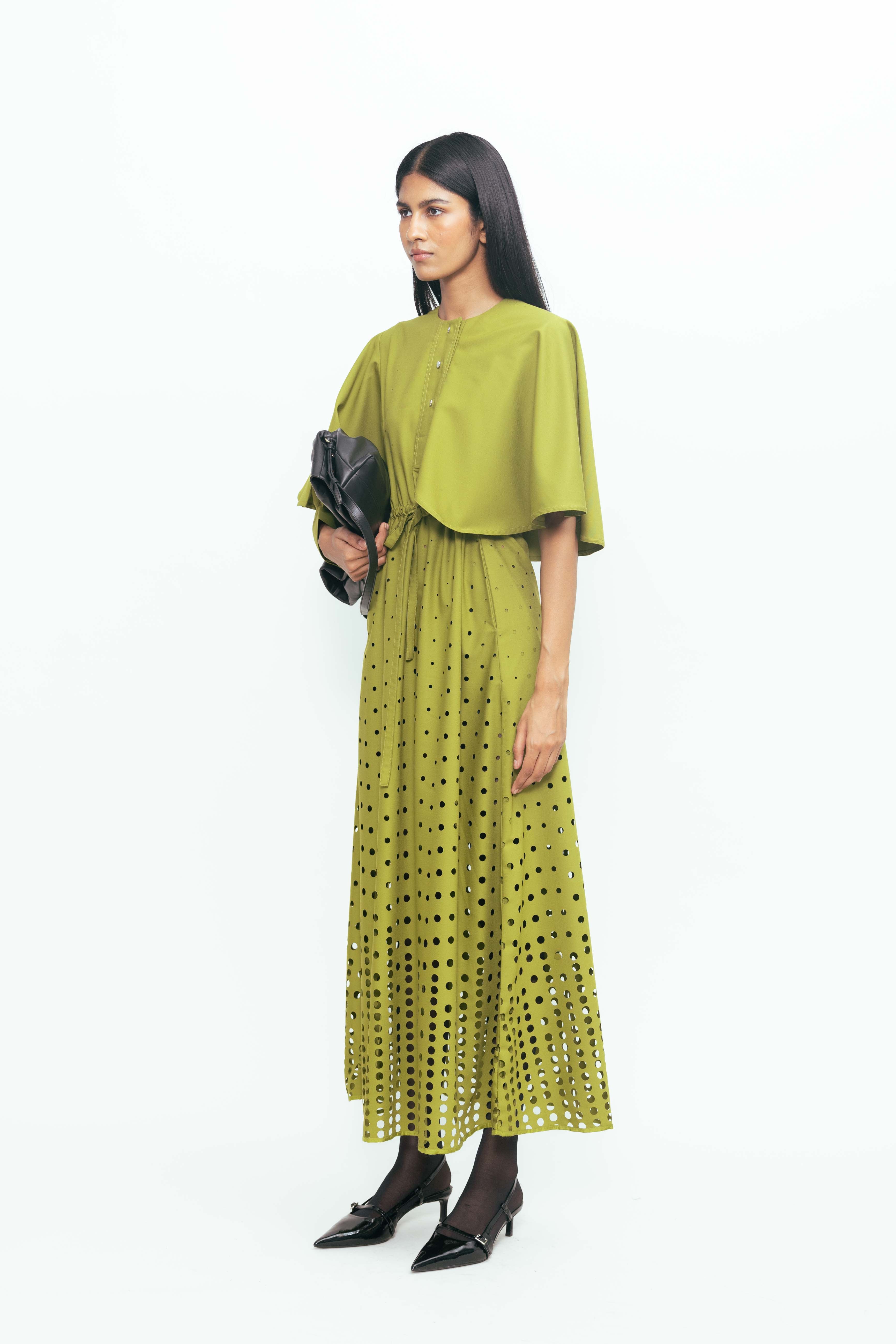 This dress merges clean structure with subtle drama through its dual-sleeve design, offering a layered look that feels both modern and refined. Crafted with precision, its laser-cut mesh panels add texture and breathability, giving the silhouette a light, airy movement. With its sculptural feel and streamlined finish, it’s a confident choice for standout yet effortless dressing.
