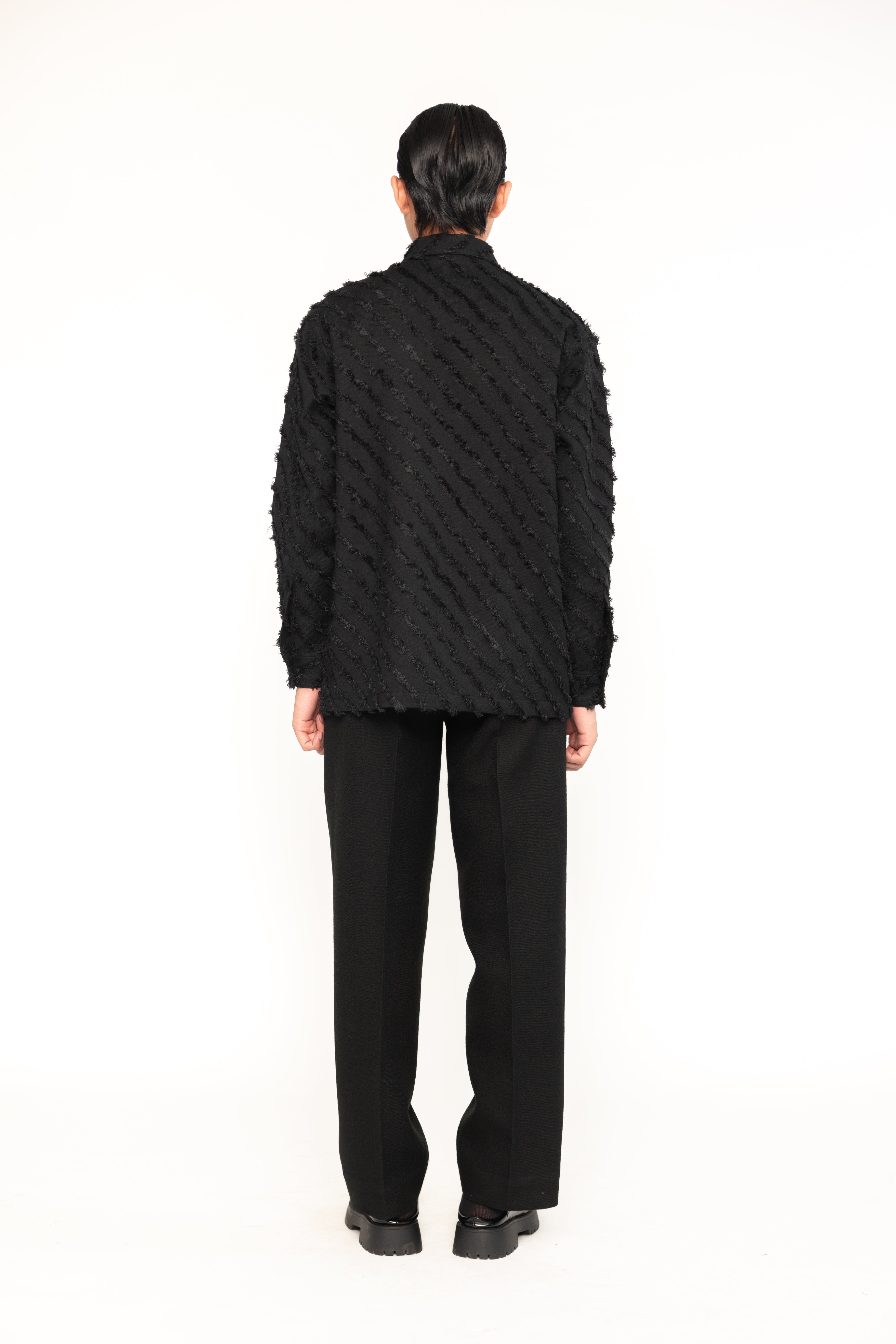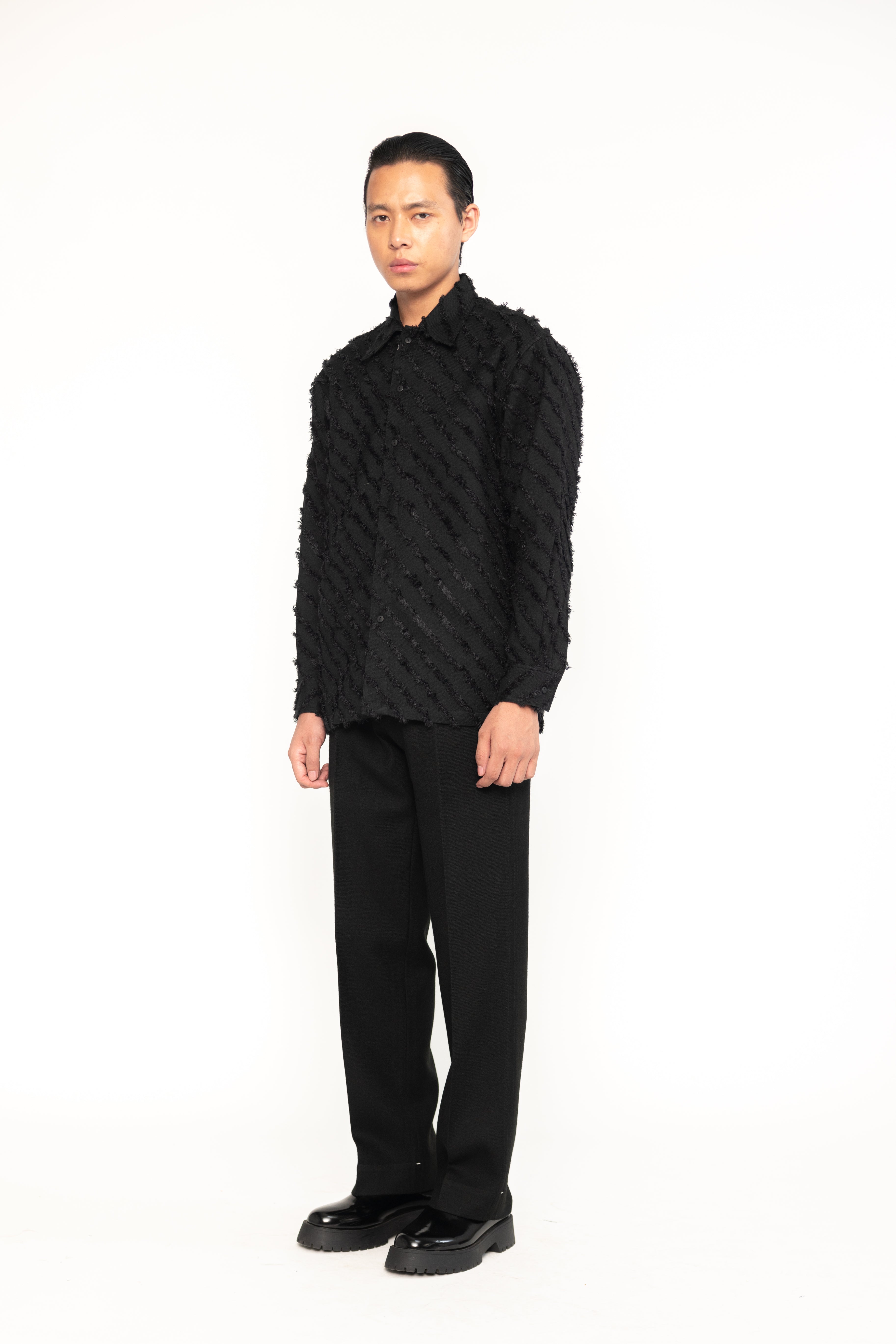This menswear slant stripe extra yarn wool shirt is a warm, stylish shirt featuring diagonal stripe patterns, crafted from premium wool with added yarn for texture and durability. The extra yarn gives it a unique, textured look, while the slant stripes add a modern, dynamic aesthetic, making it versatile for both casual and semi-formal wear. It combines the cozy warmth of wool with a refined, fashion-forward design.