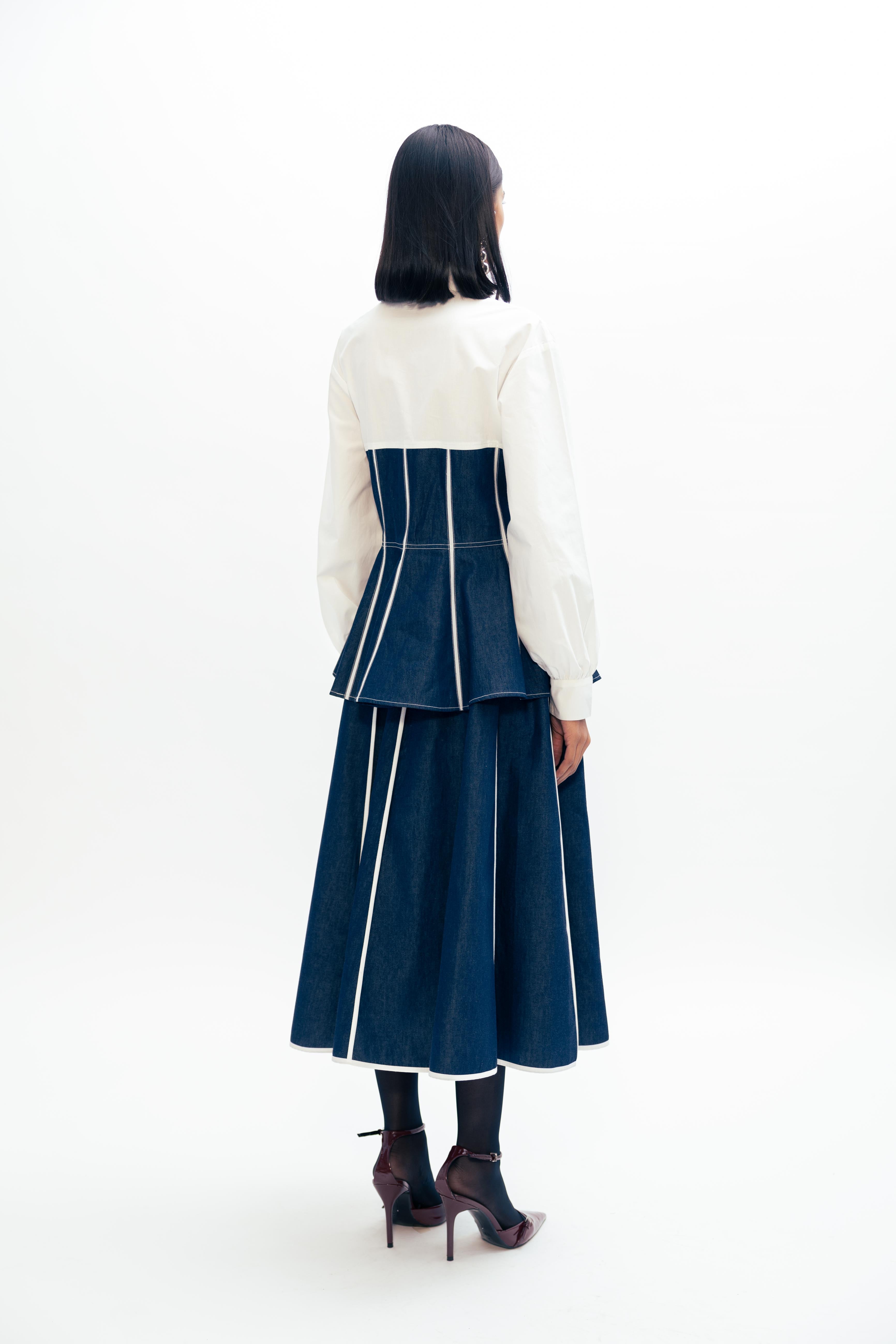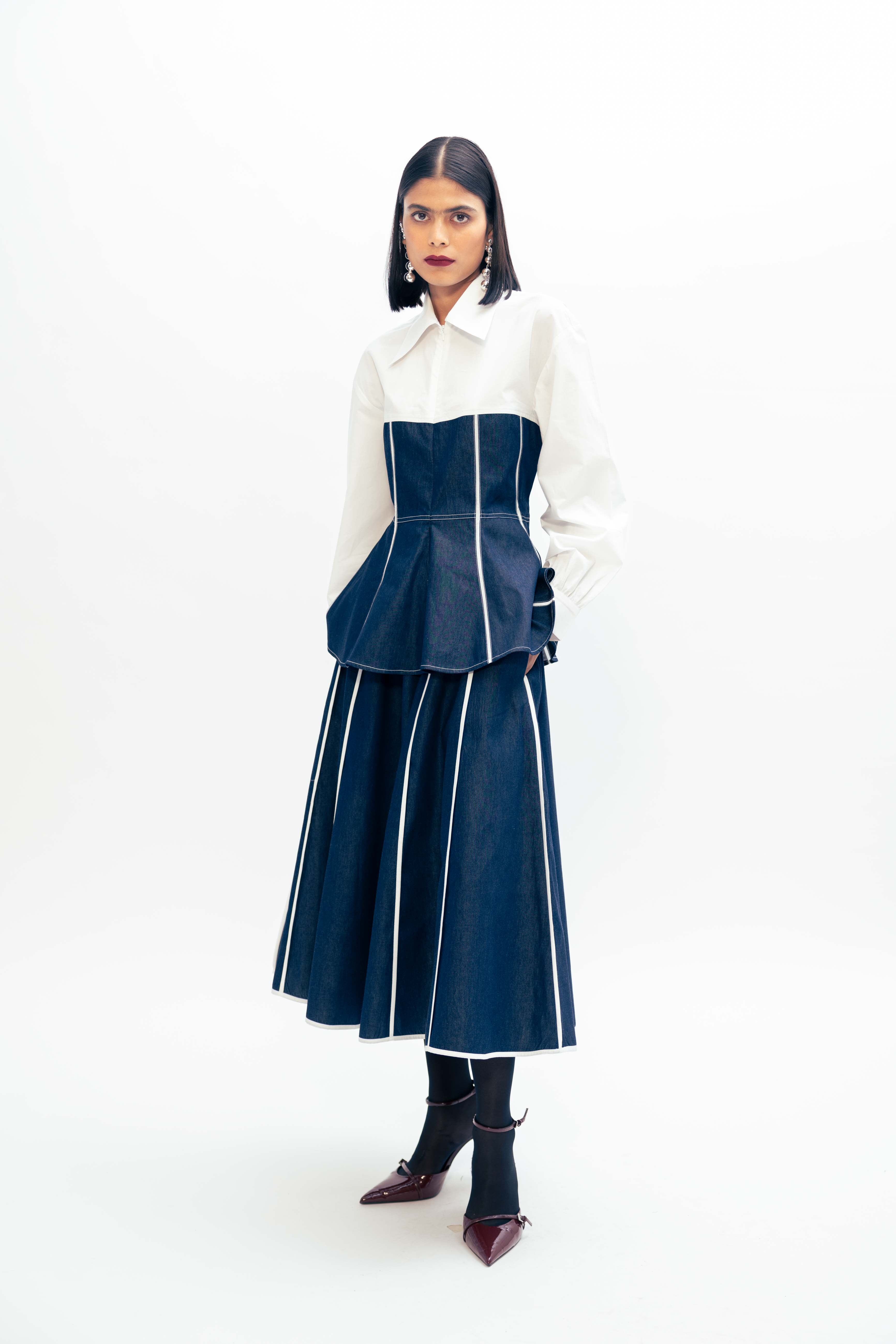A fresh take on a classic silhouette, this set features a flattering peplum waisted top and flare skirt with a modern fit-blocking design. The structured upper body contrasts with the soft flare of the peplum, added with the ease of the flared midi skirt creating a balanced, feminine look. Ideal for a smart, polished outfit.