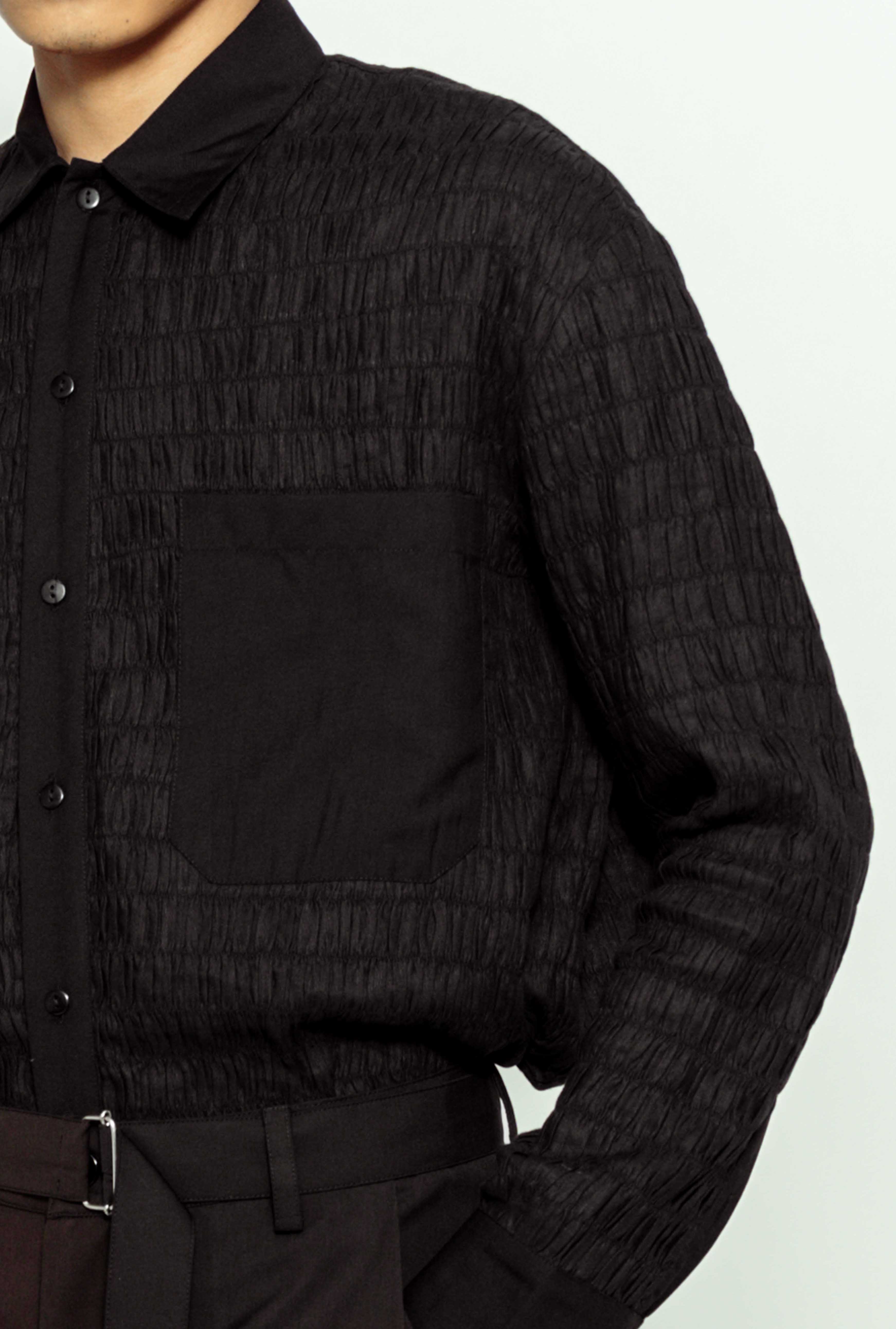 This men's handloom linen full-sleeve shirt with shirring detail offers textured gathers for a stylish, comfortable, and unique look.