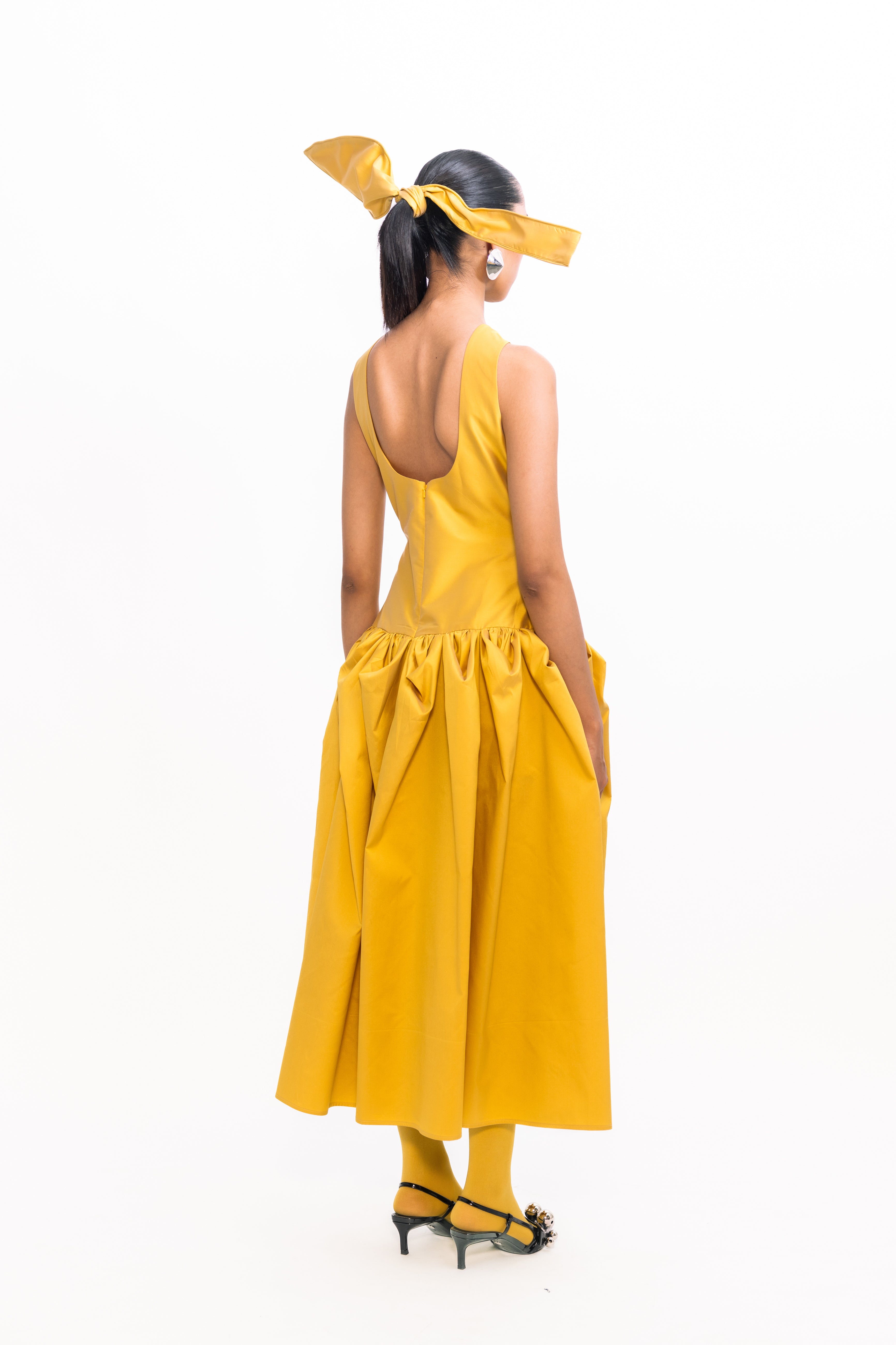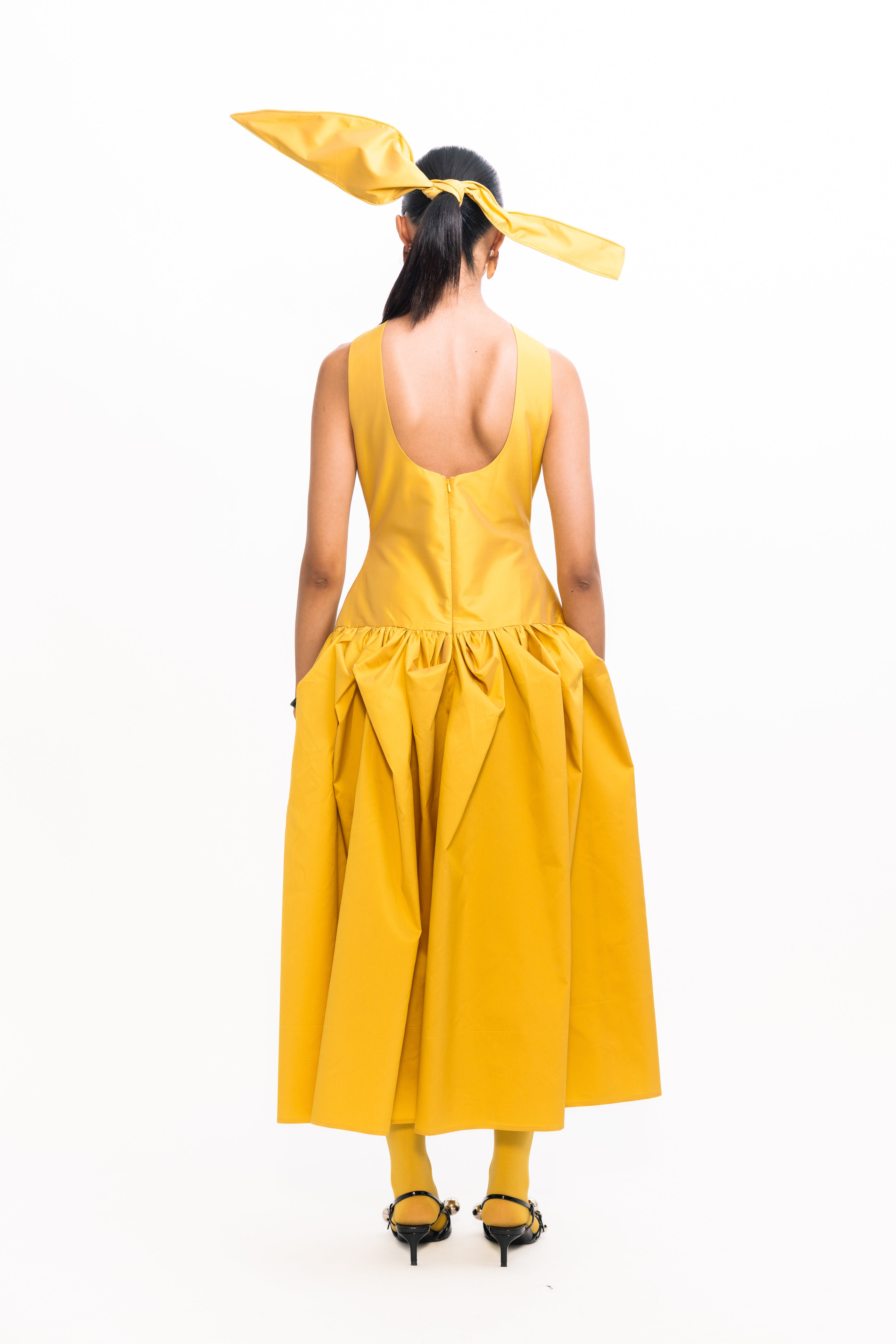 This elegant sleeveless dress features a daring low-back design and a figure-flattering, fitted bodice. Below the waist, soft tulip gathers create graceful draping and a sophisticated silhouette, making it perfect for evening events or special occasions.