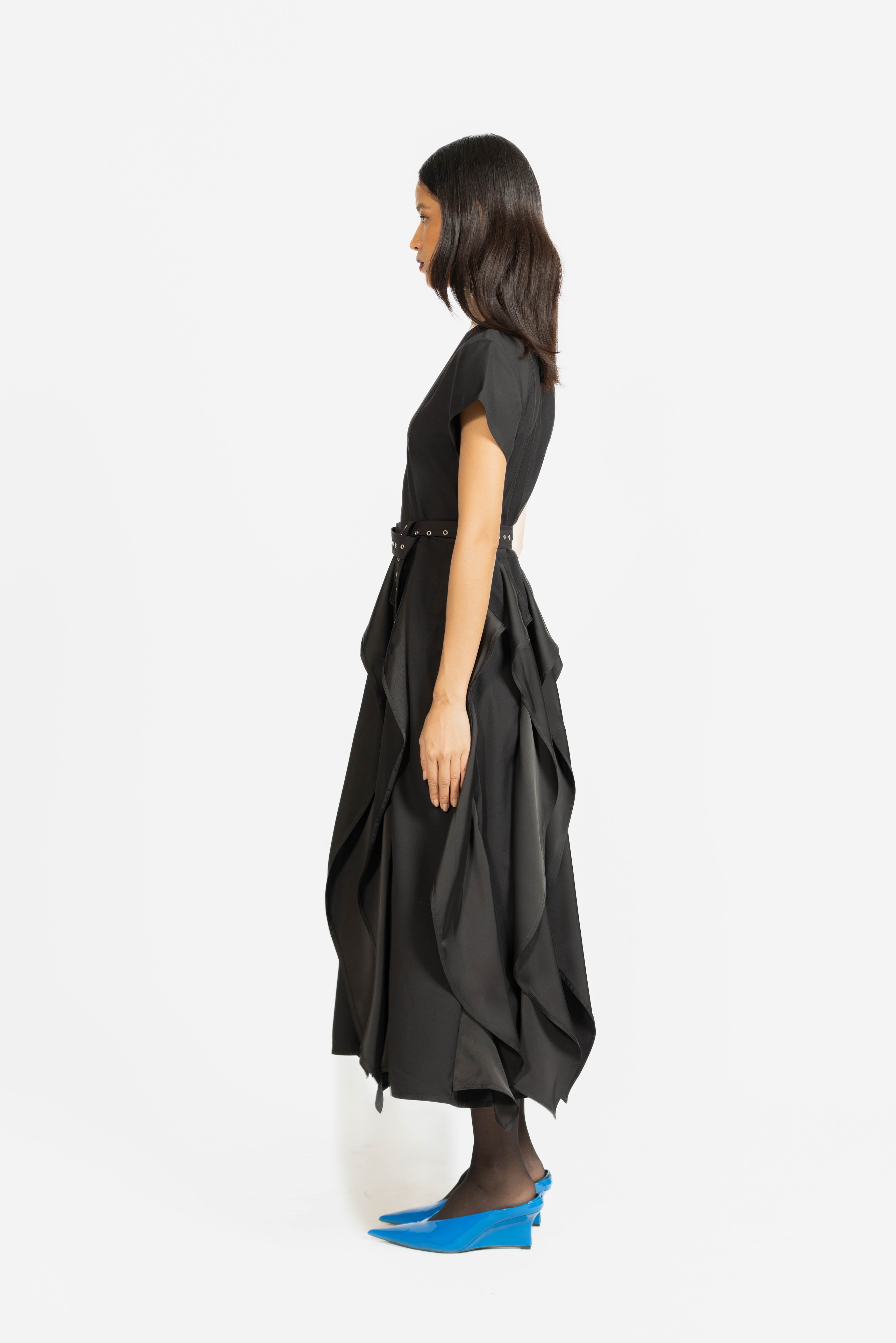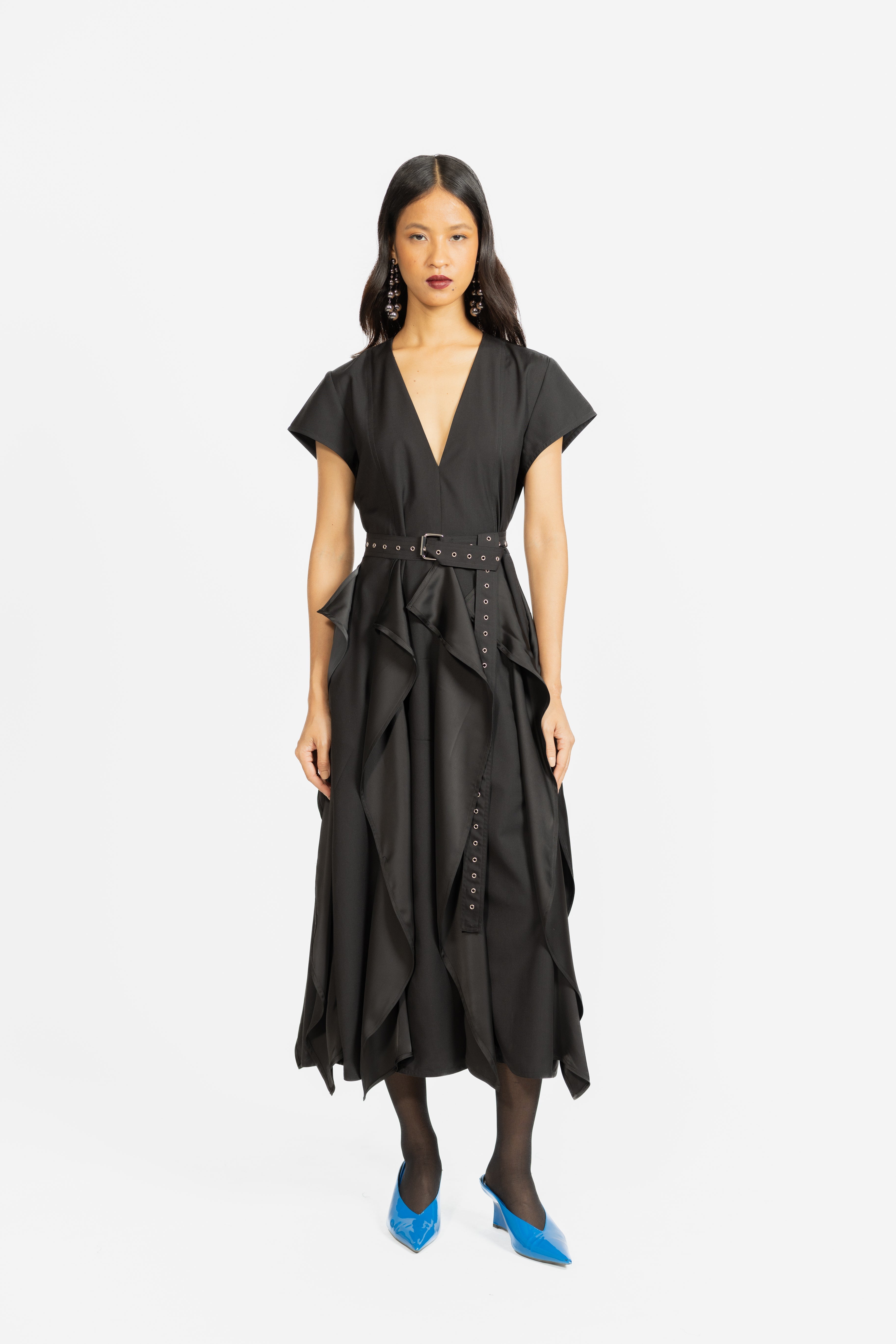 A sophisticated midi dress featuring elegant draping and a cinched waist with a coordinating belt. Designed to flatter the figure, it combines fluid movement with a polished, modern silhouette.