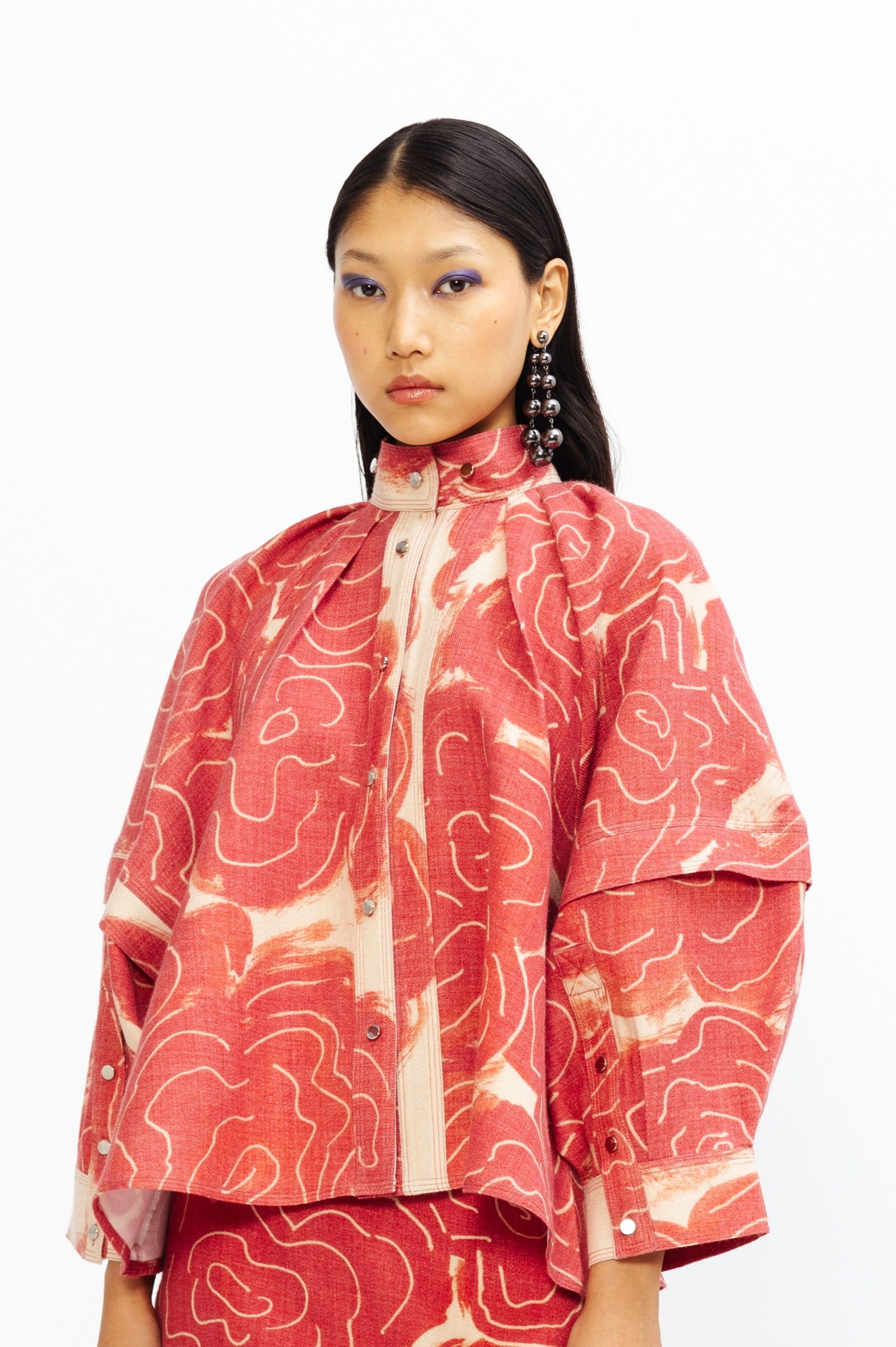 This A-line shirt styled with a skirt offers a sophisticated yet comfortable fit, balancing structure with ease. Designed in an artistic monochrome palette, it exudes a contemporary, high-fashion aesthetic. Perfect for both casual and polished looks, it’s a versatile piece that effortlessly elevates everyday dressing.