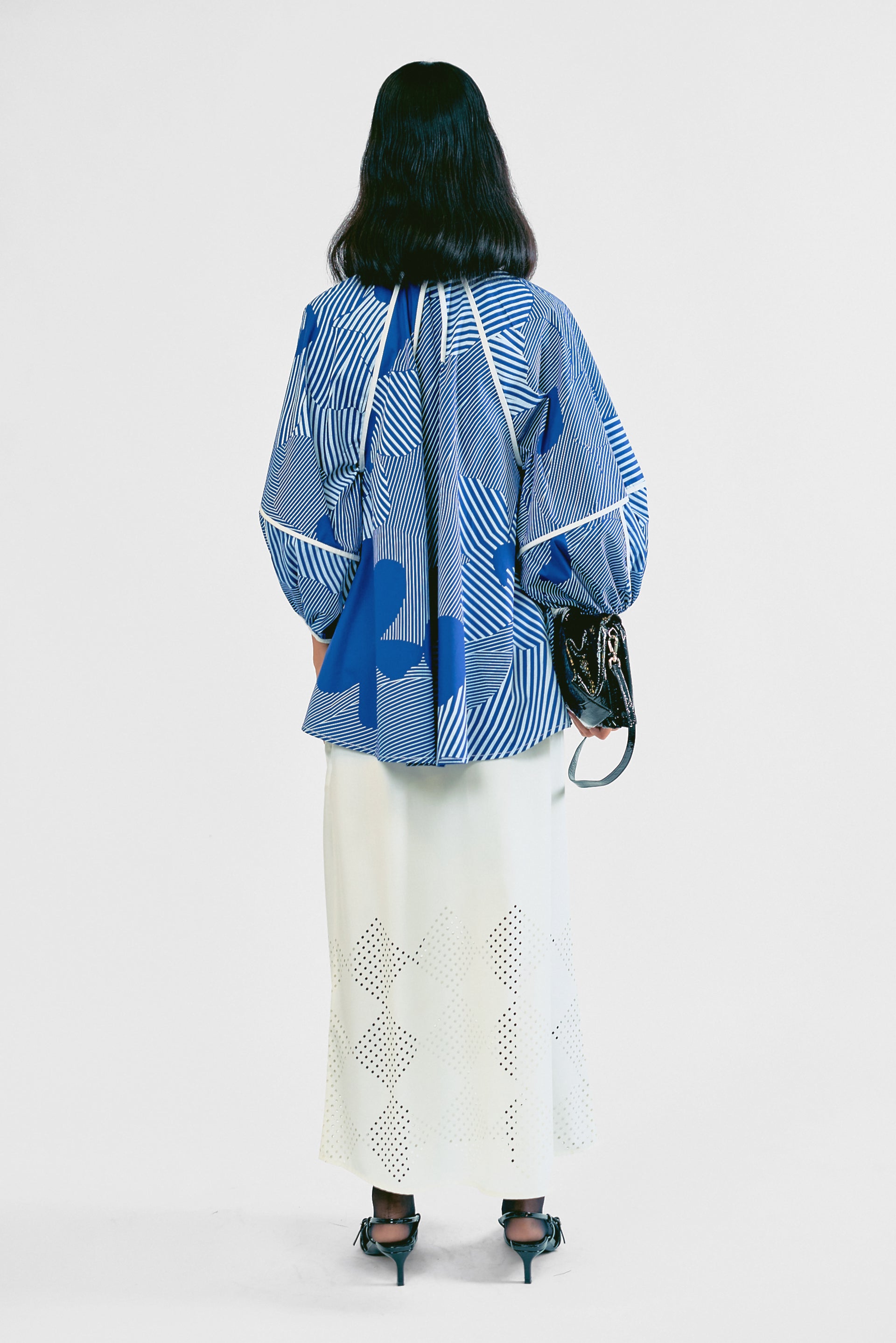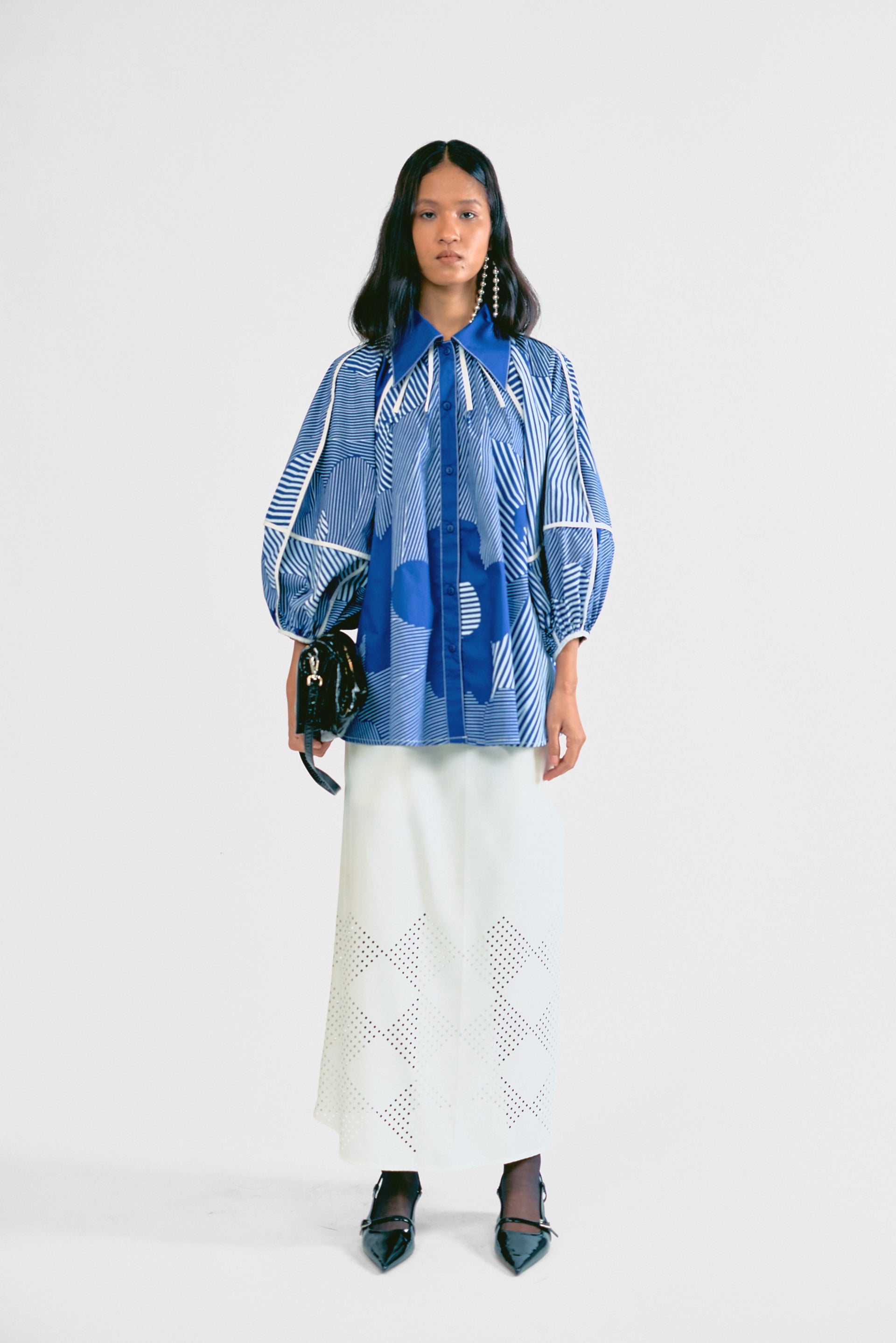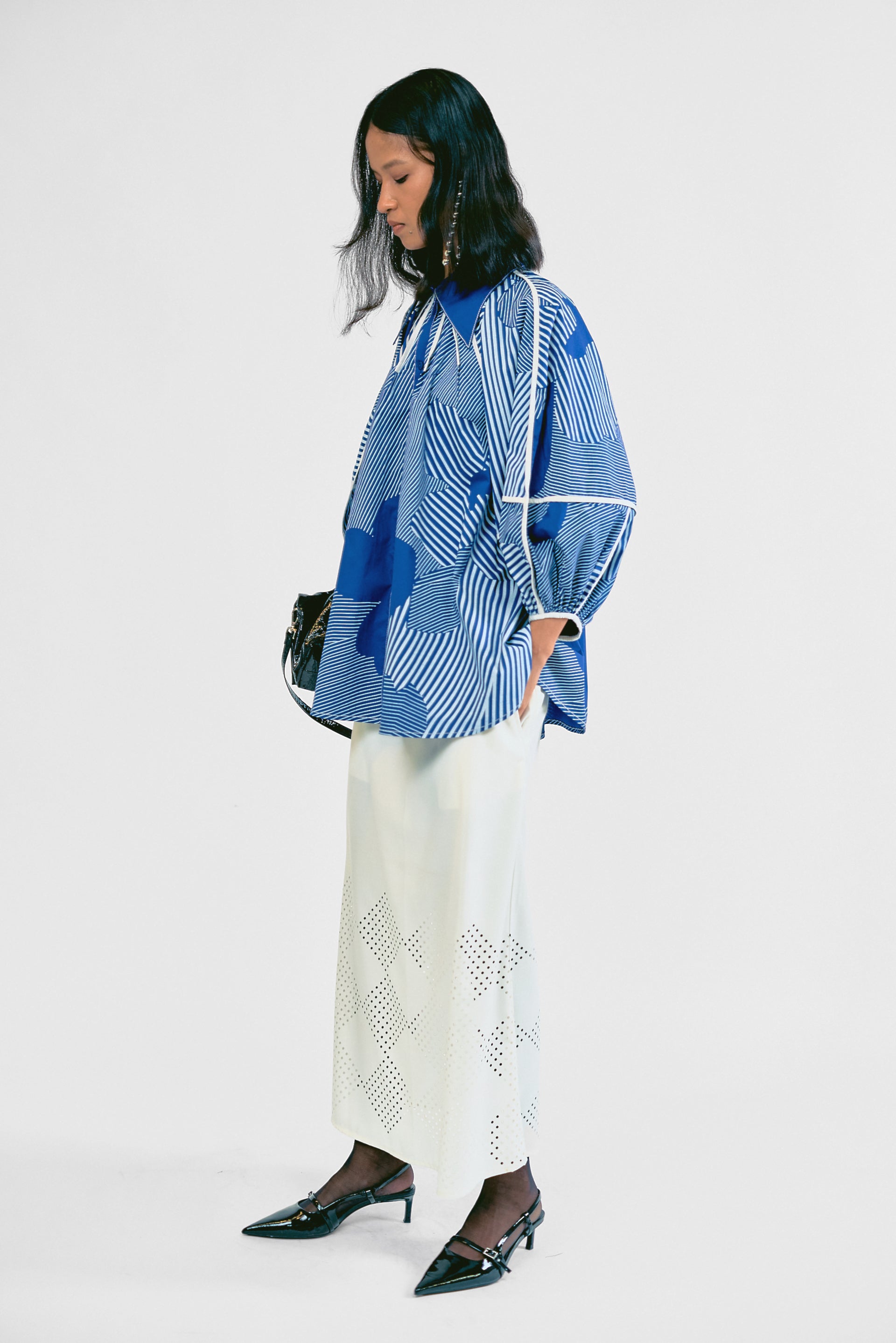 Make a statement with this Leg o’ Mutton Sleeved Shirt, featuring contrasting slot details for a bold, modern touch. The structured sleeves add a dramatic flair, while the refined tailoring ensures a sophisticated, standout look.