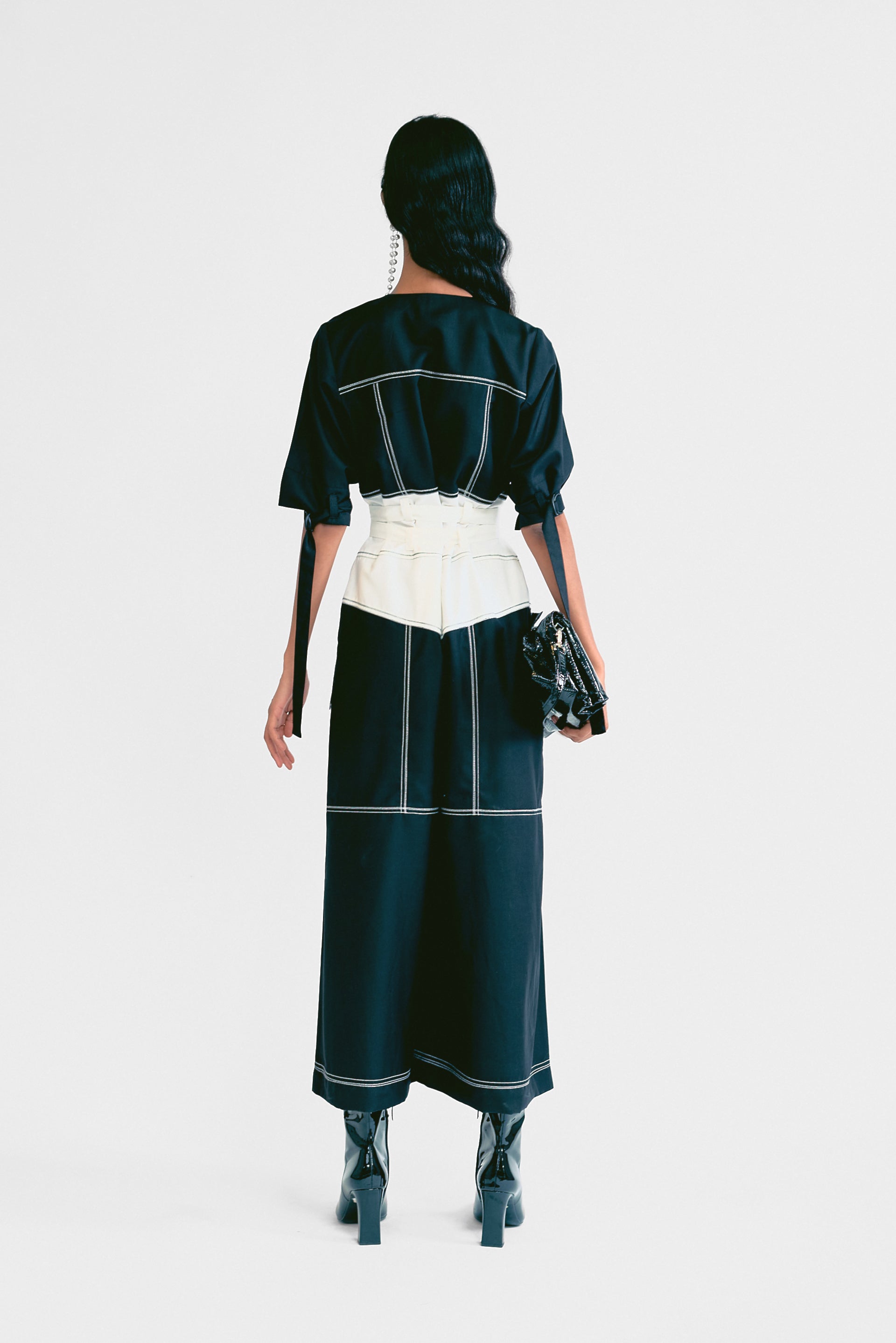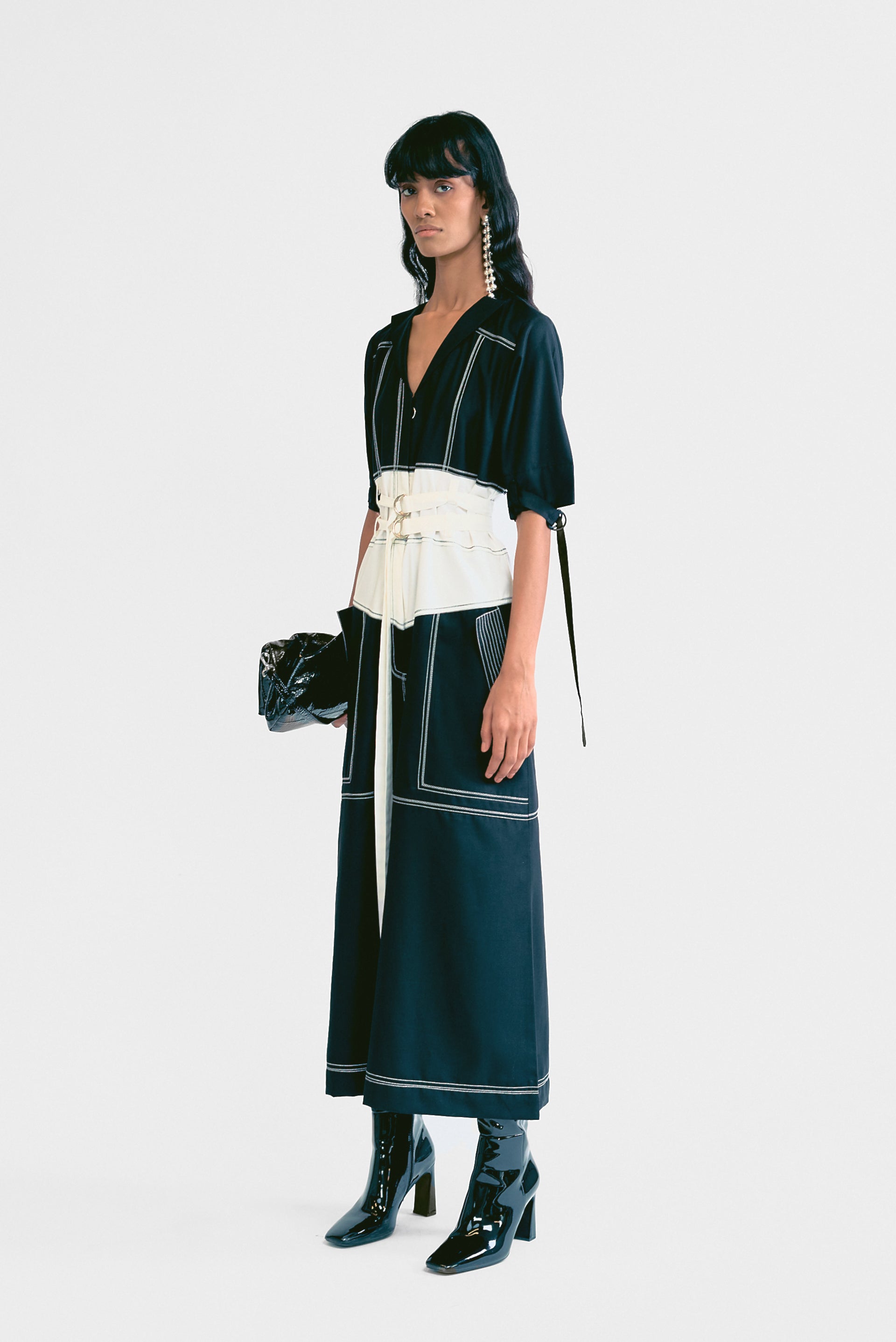 A sleek and modern jumpsuit featuring a contrast double-belt design and intricate top-stitch detailing. Perfect for a bold and sophisticated look.