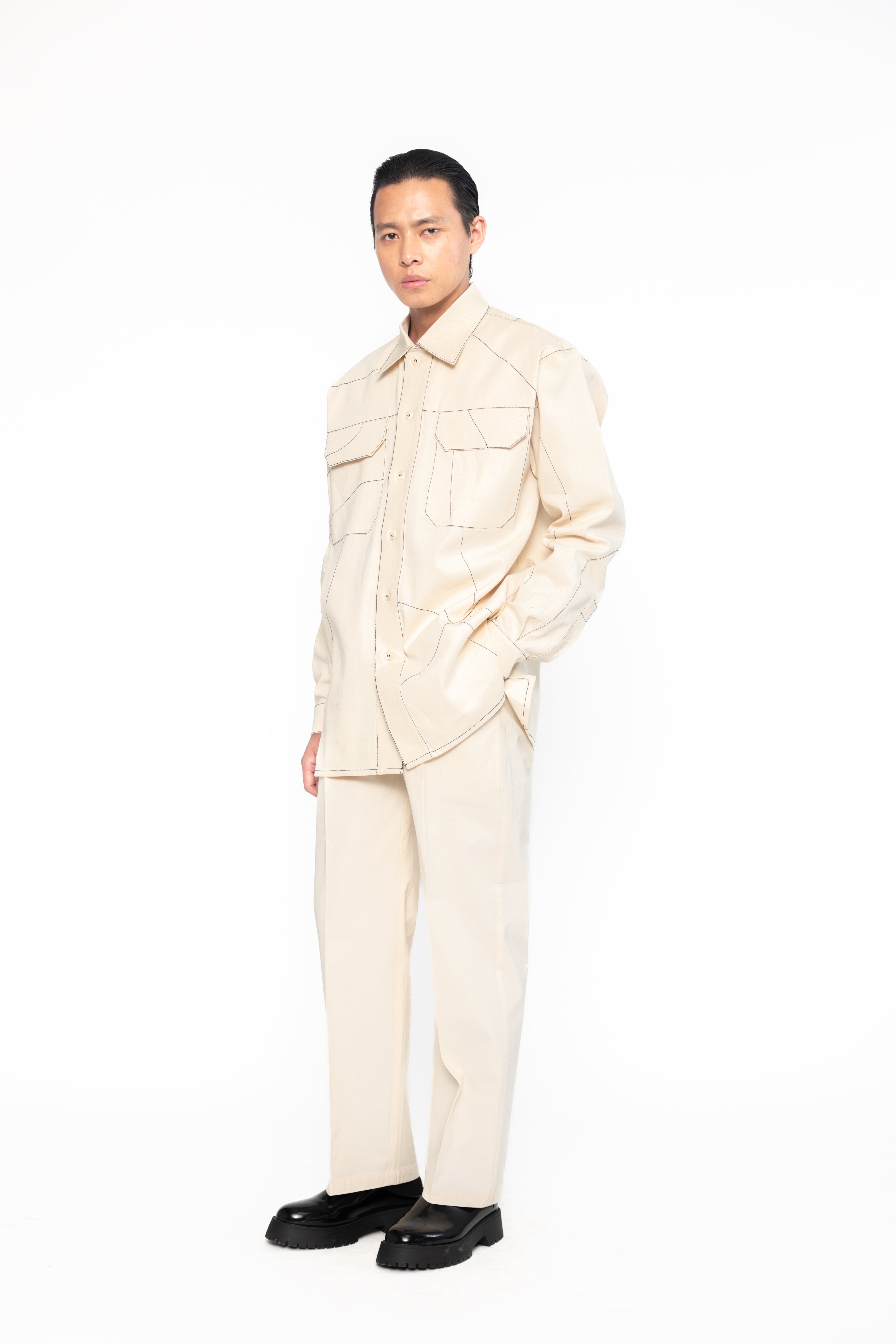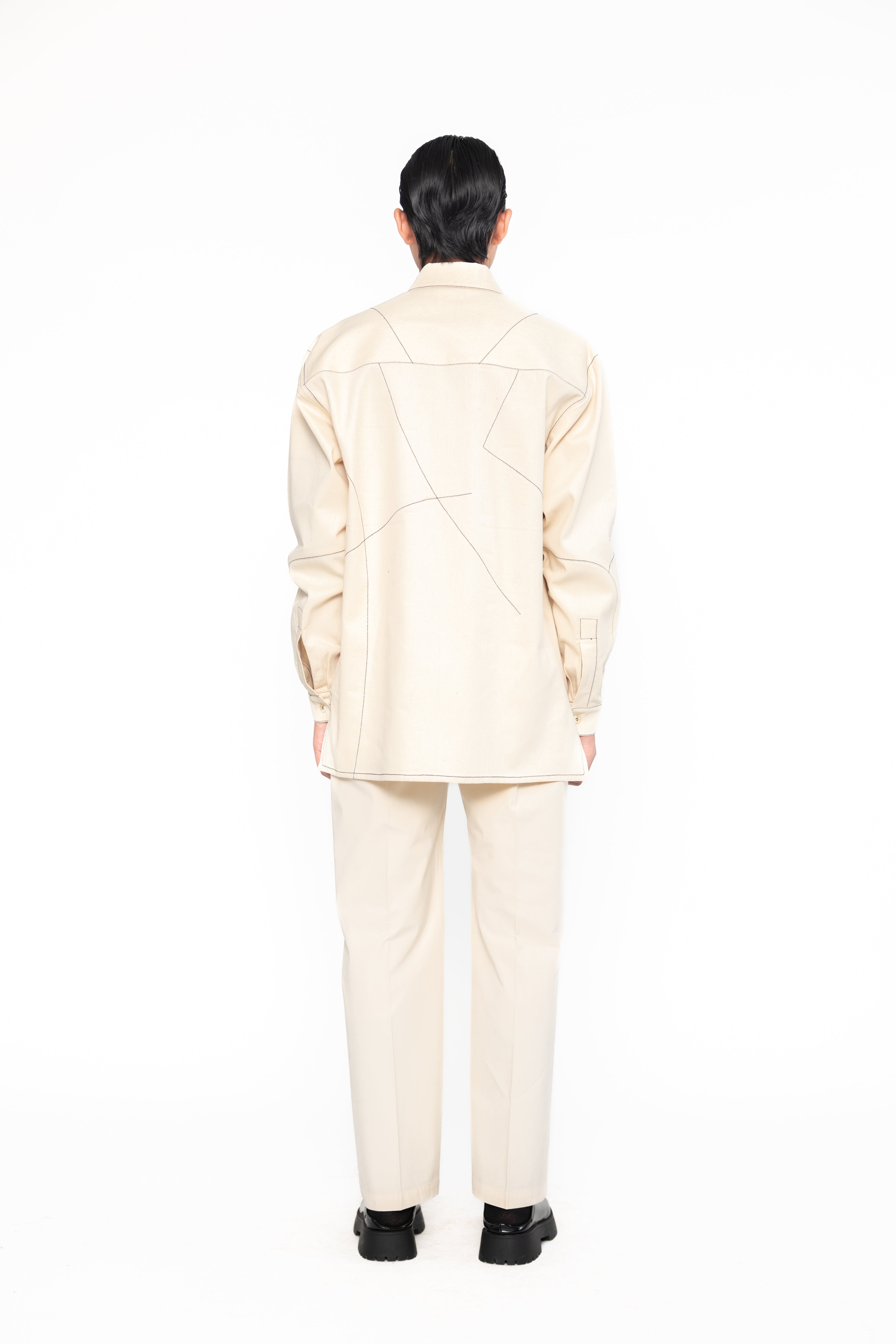 This denim shirt with contrast topstitching and patch pockets features the classic durability of denim, enhanced with bold stitching for added style. The patch pockets provide functionality and a rugged, casual look, making the shirt both practical and fashionable.