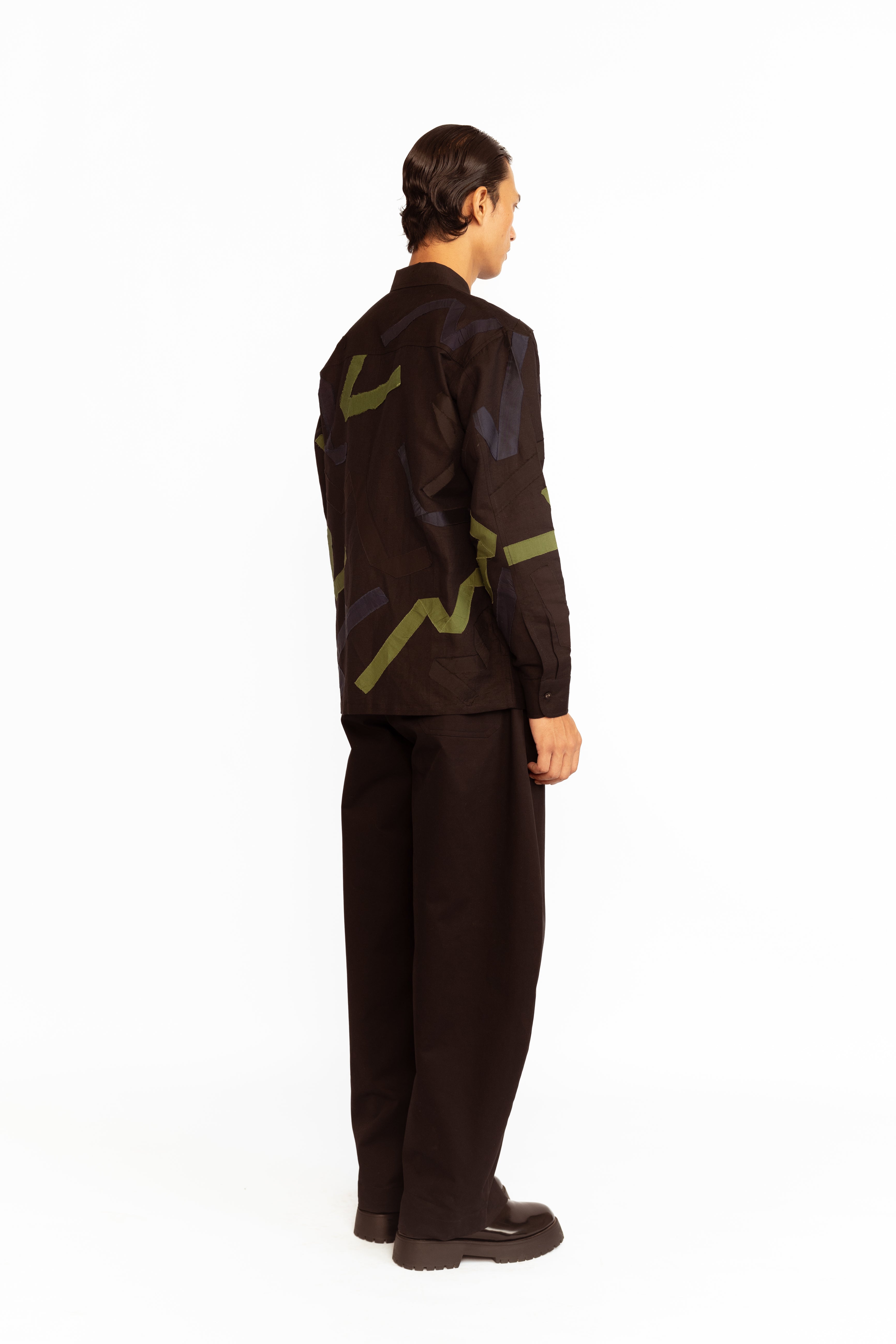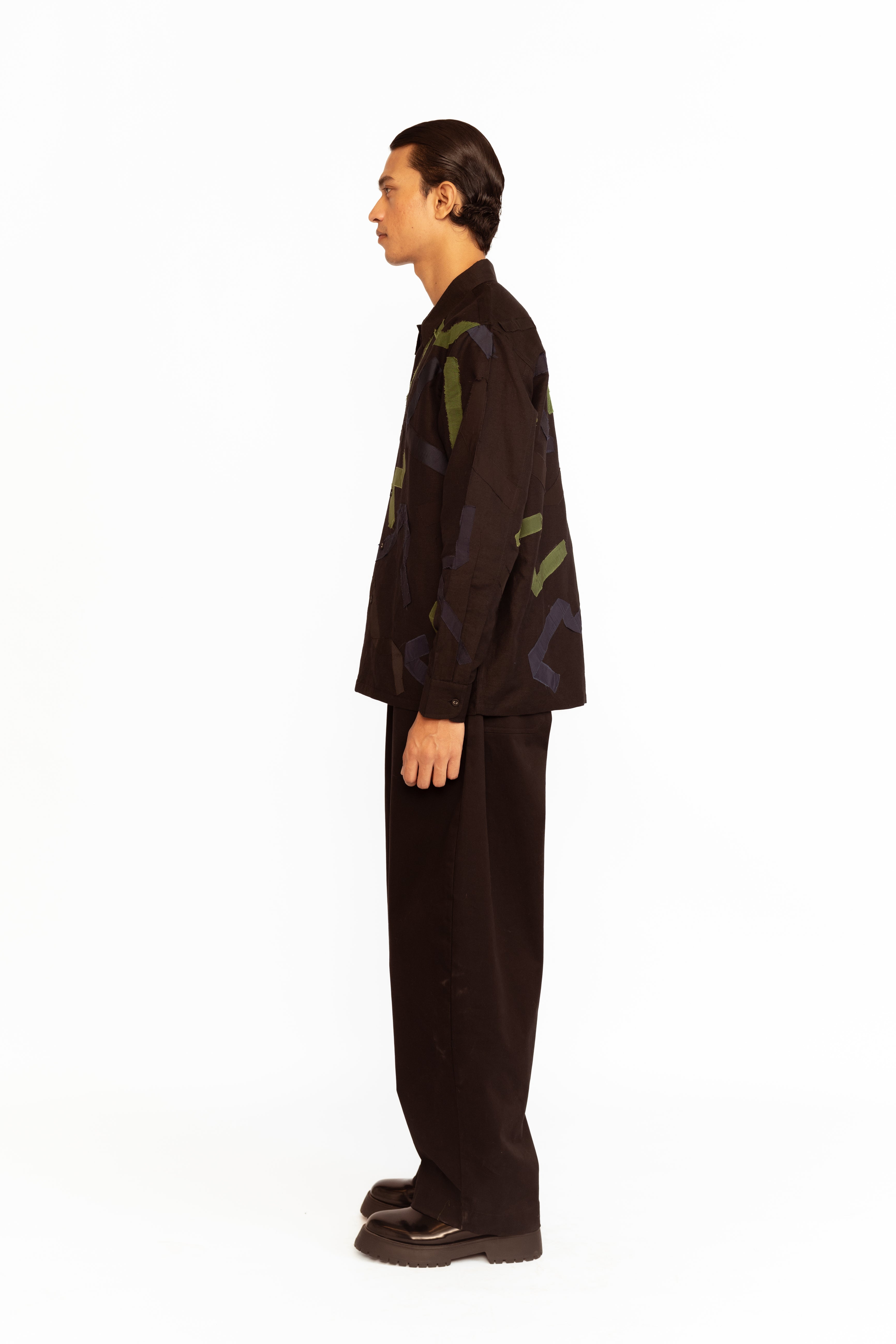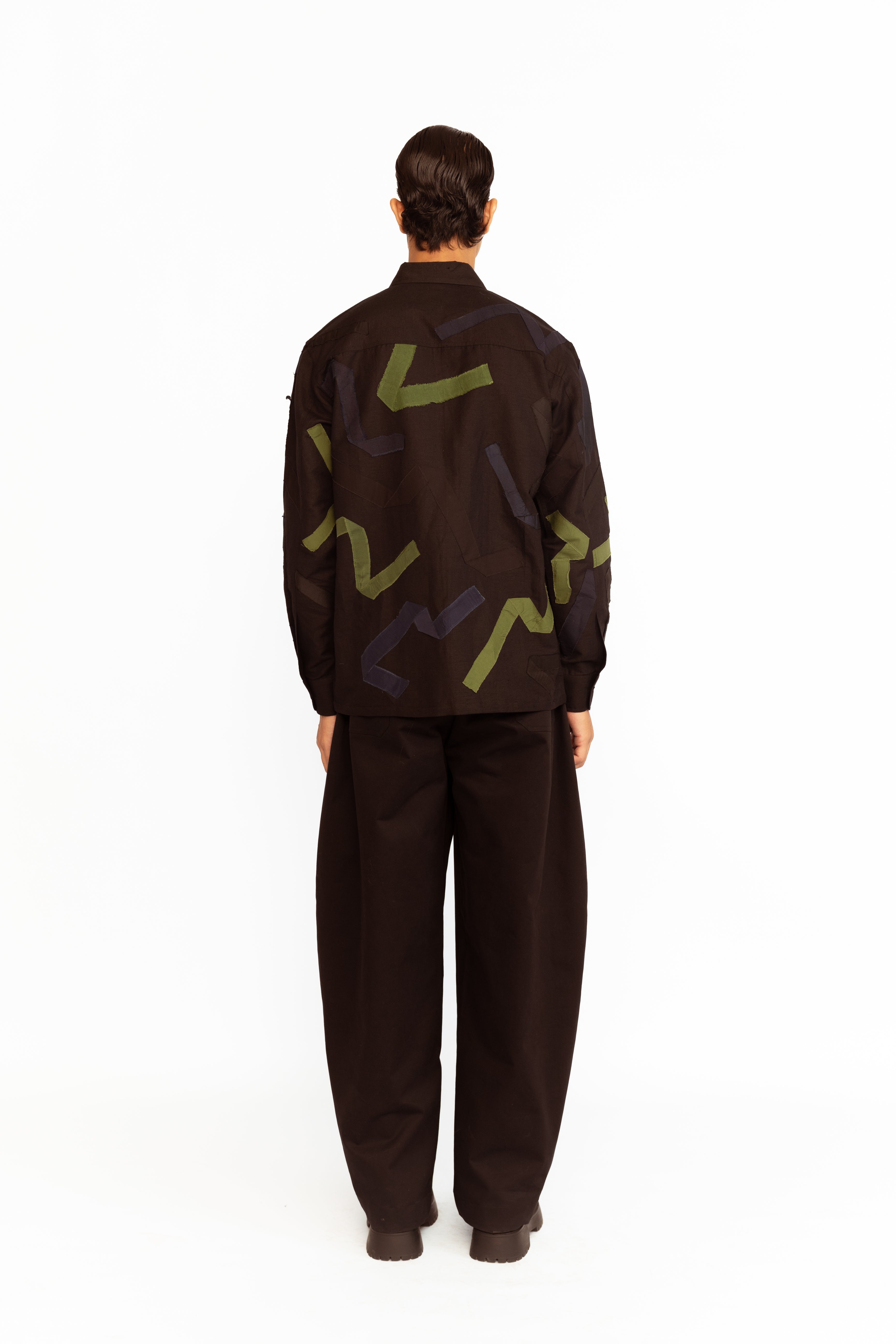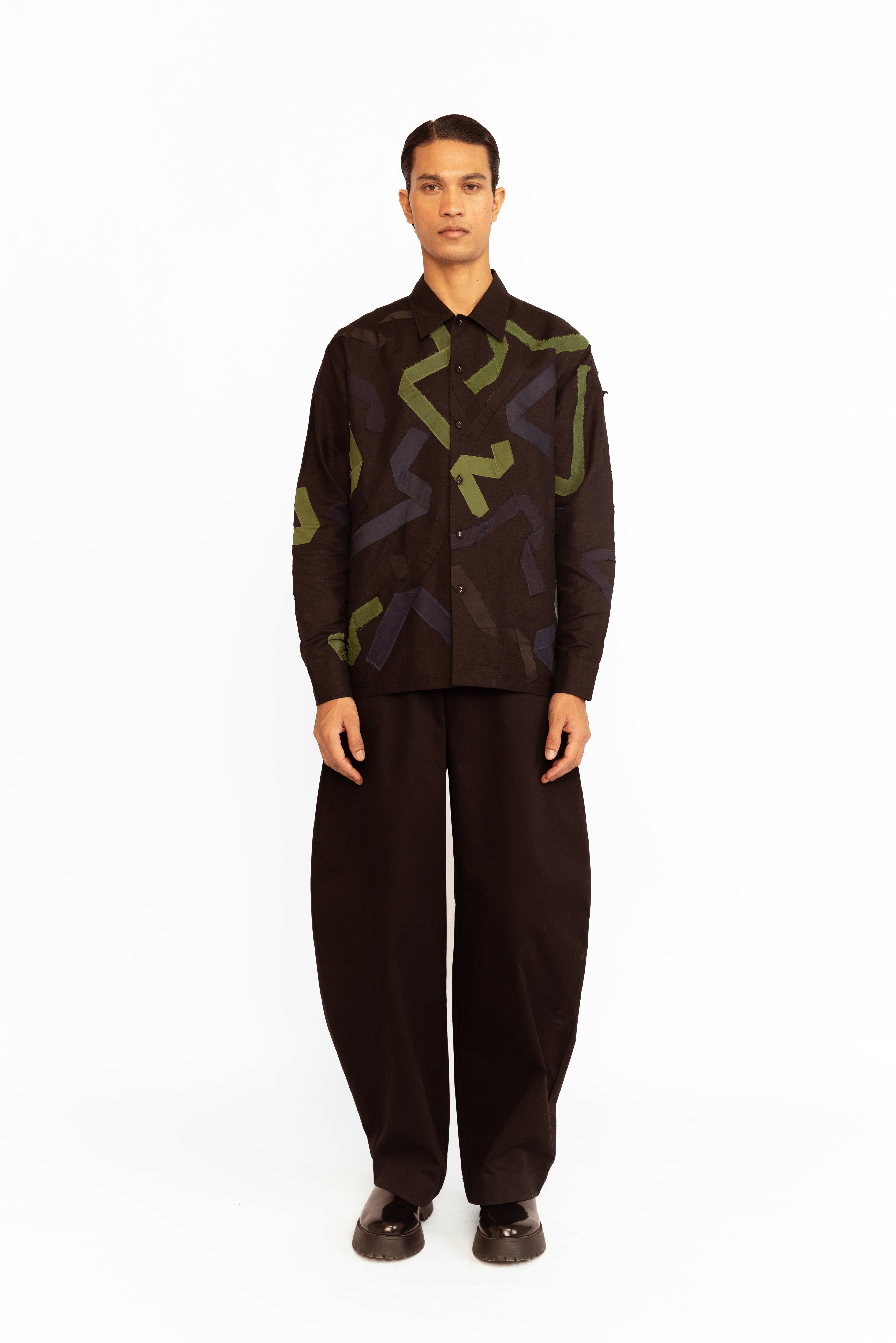 A contemporary twist on a classic silhouette, this oversized shirt features full sleeves and bold multicolour tape patchwork detailing. Effortlessly stylish and versatile, it makes a statement while offering a relaxed, modern fit.
