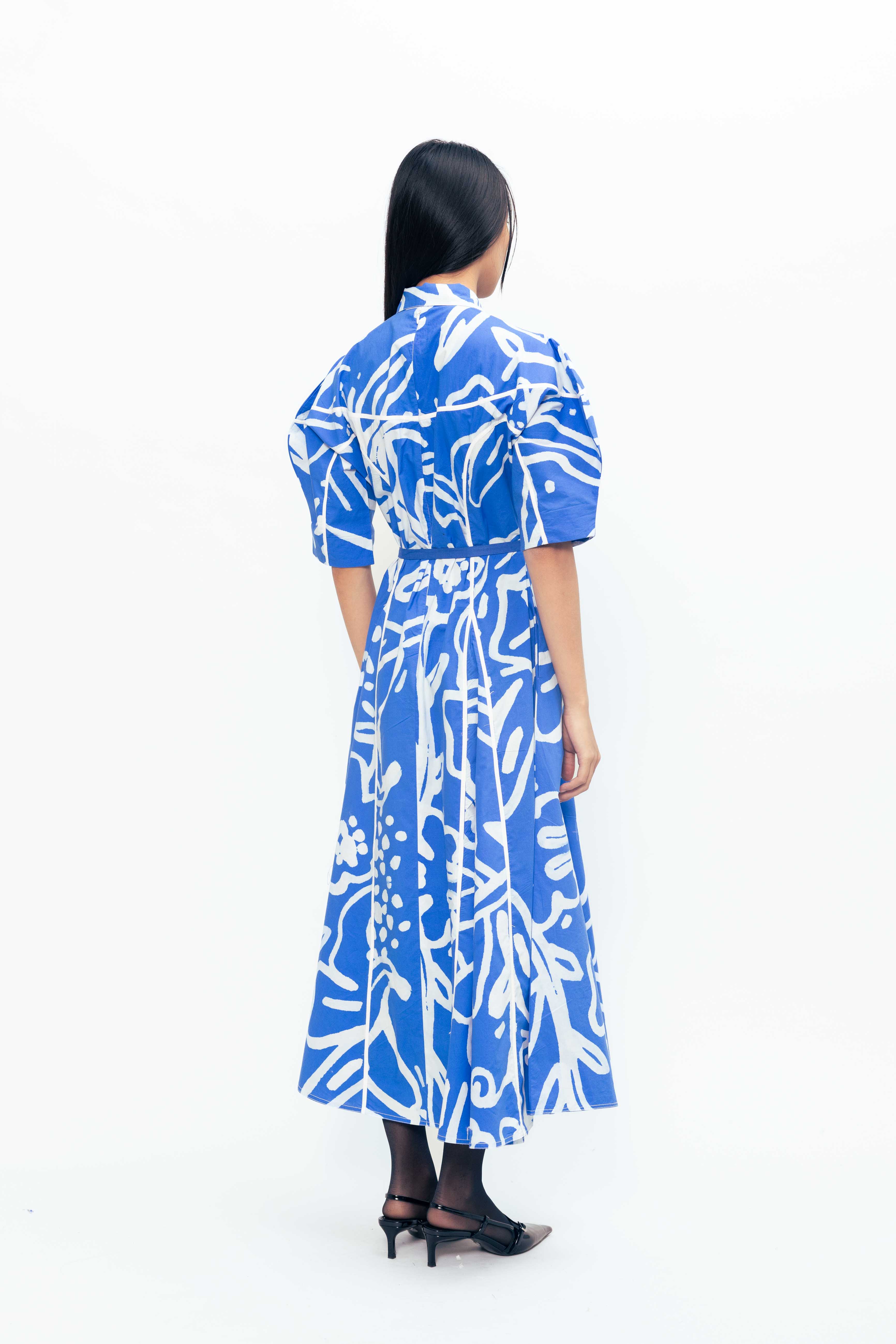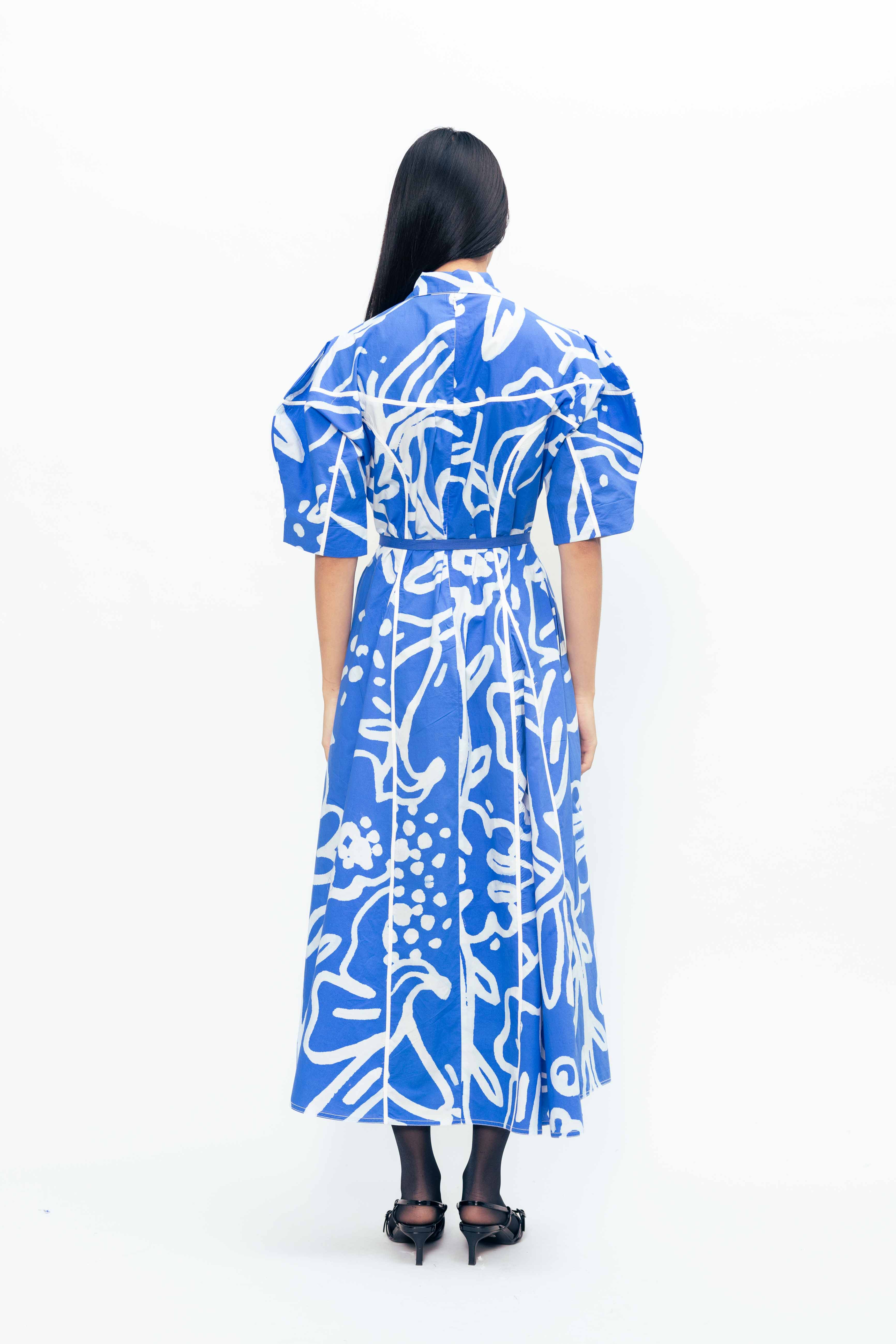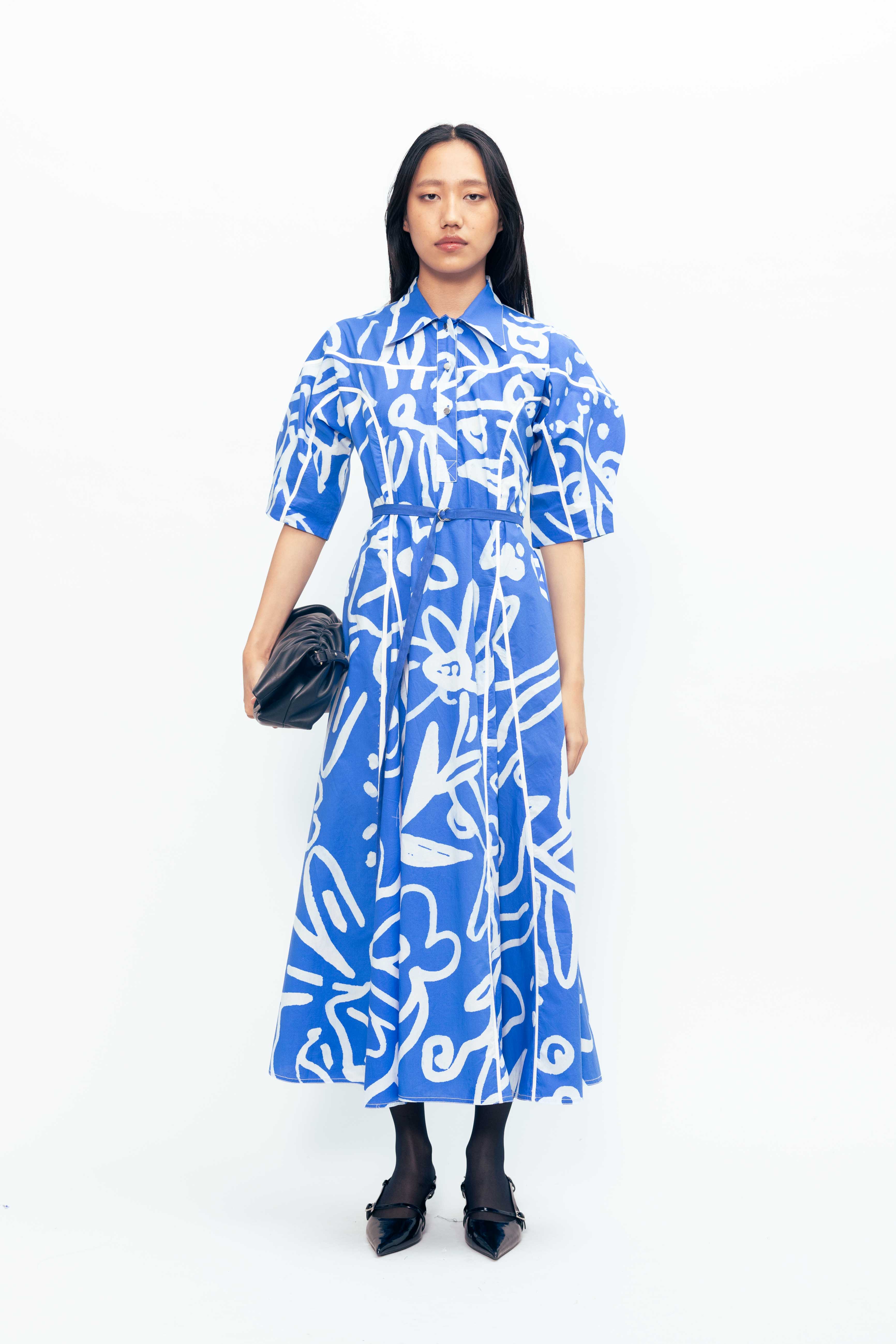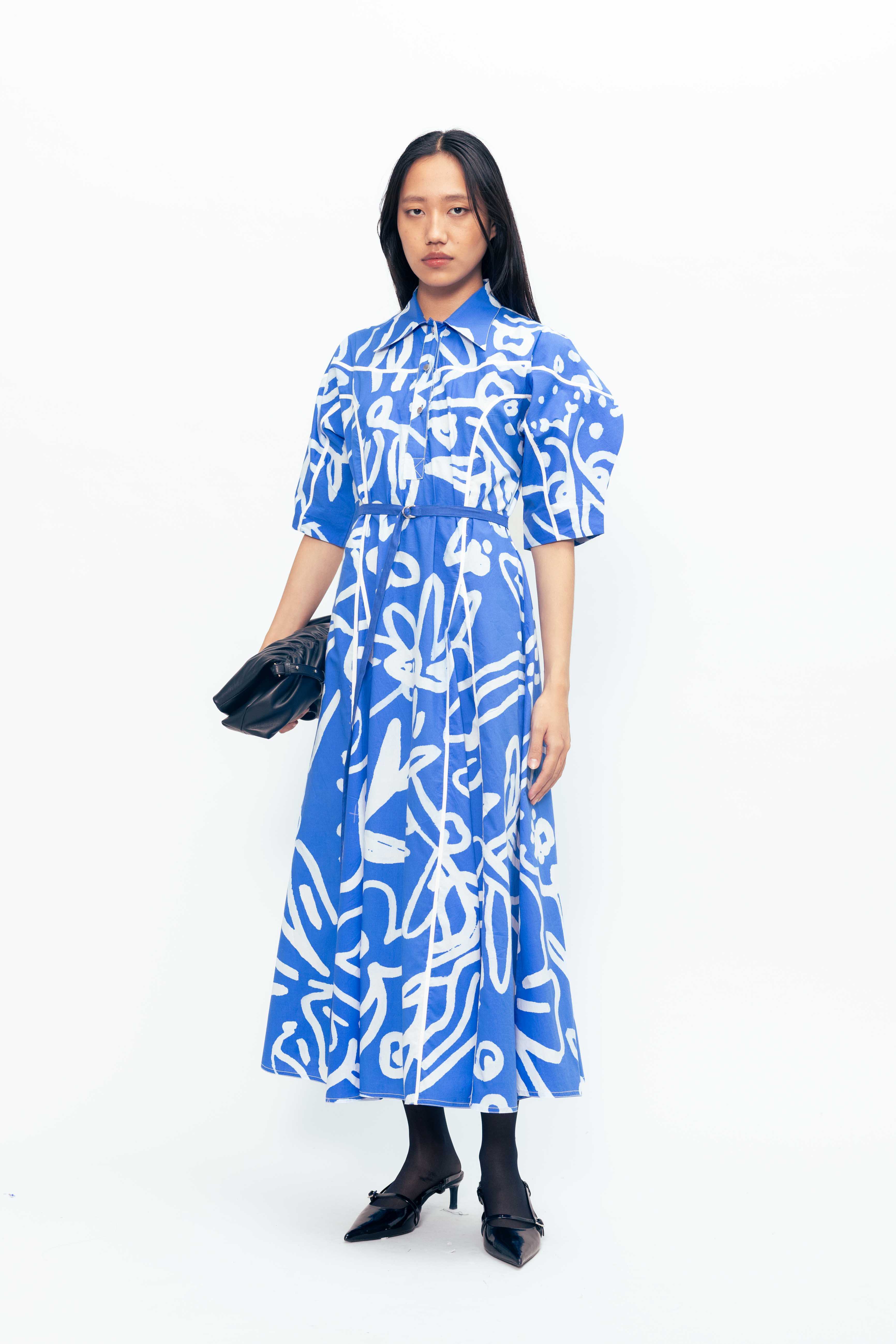 This fit-and-flare dress combines playful energy with a flattering, structured shape. Billowy sleeves add soft volume and movement, while the doodle-inspired print brings a lively, artistic touch.